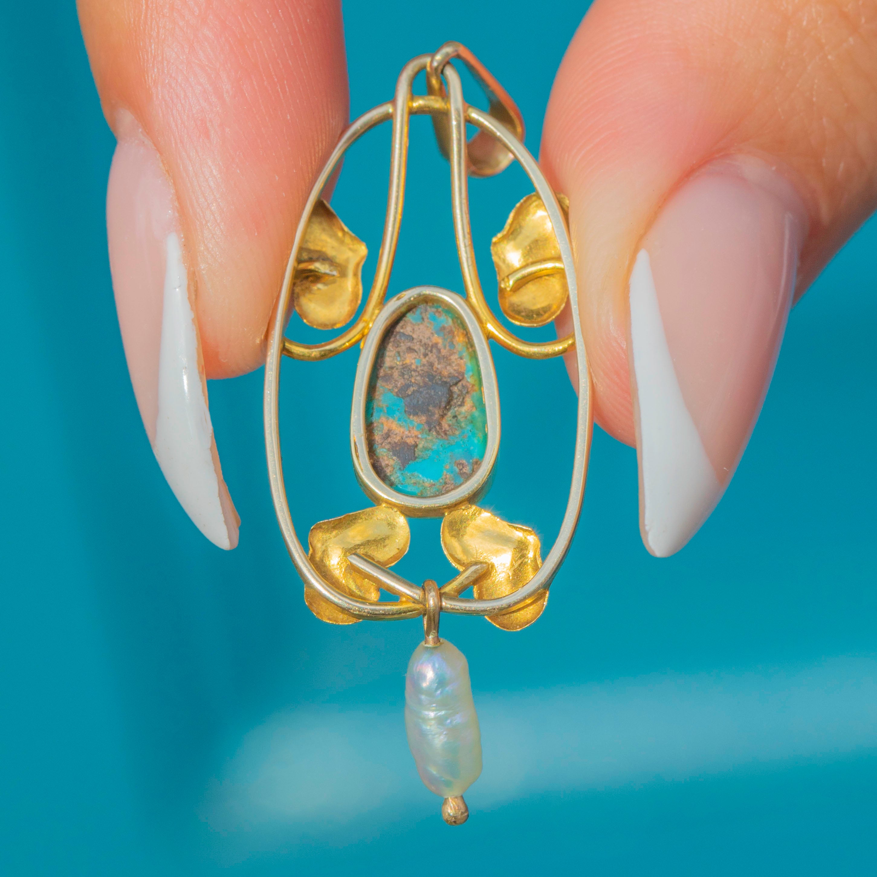 Art Nouveau 18ct Gold Turquoise Pearl Pendant  - Attributed to Murrle Bennett Item added