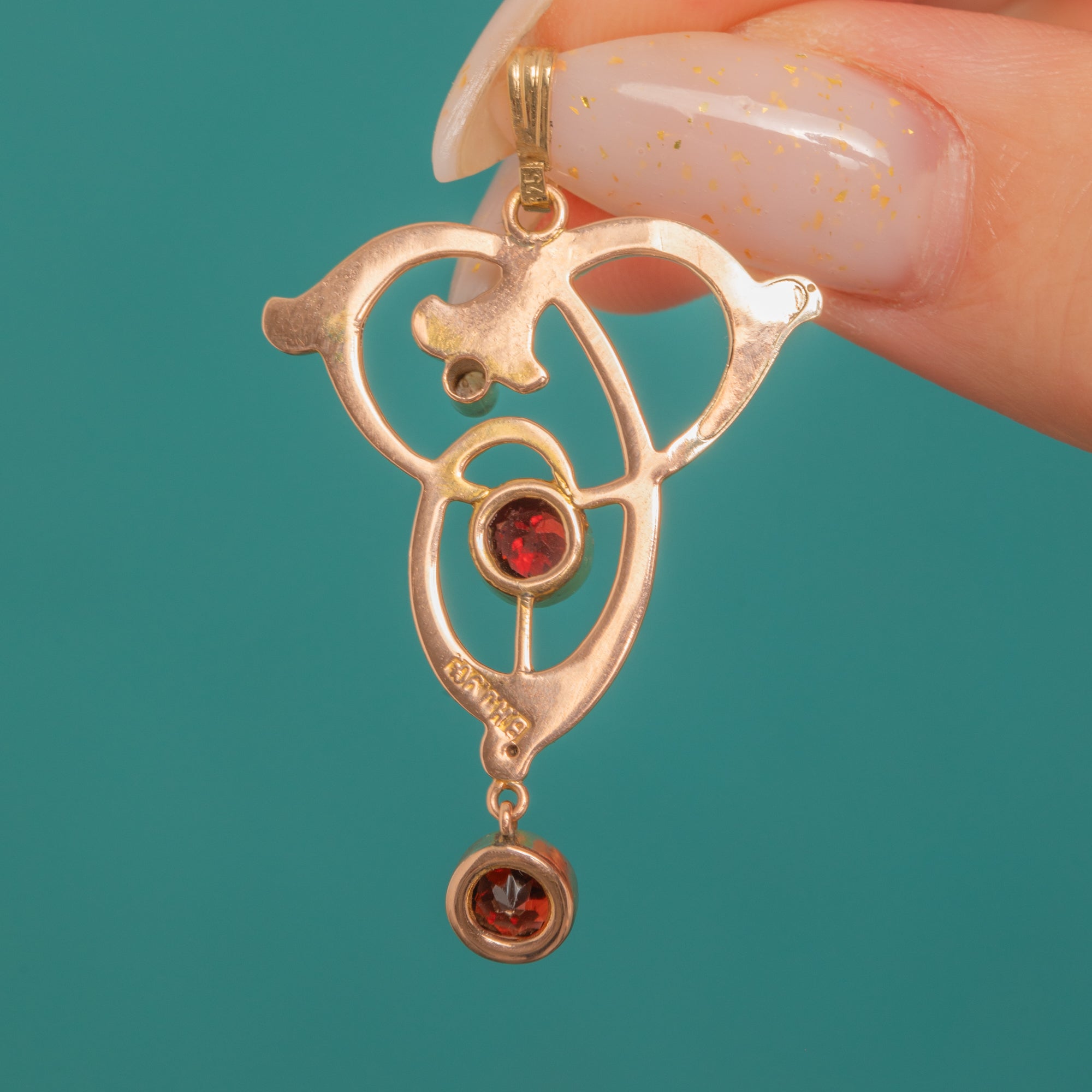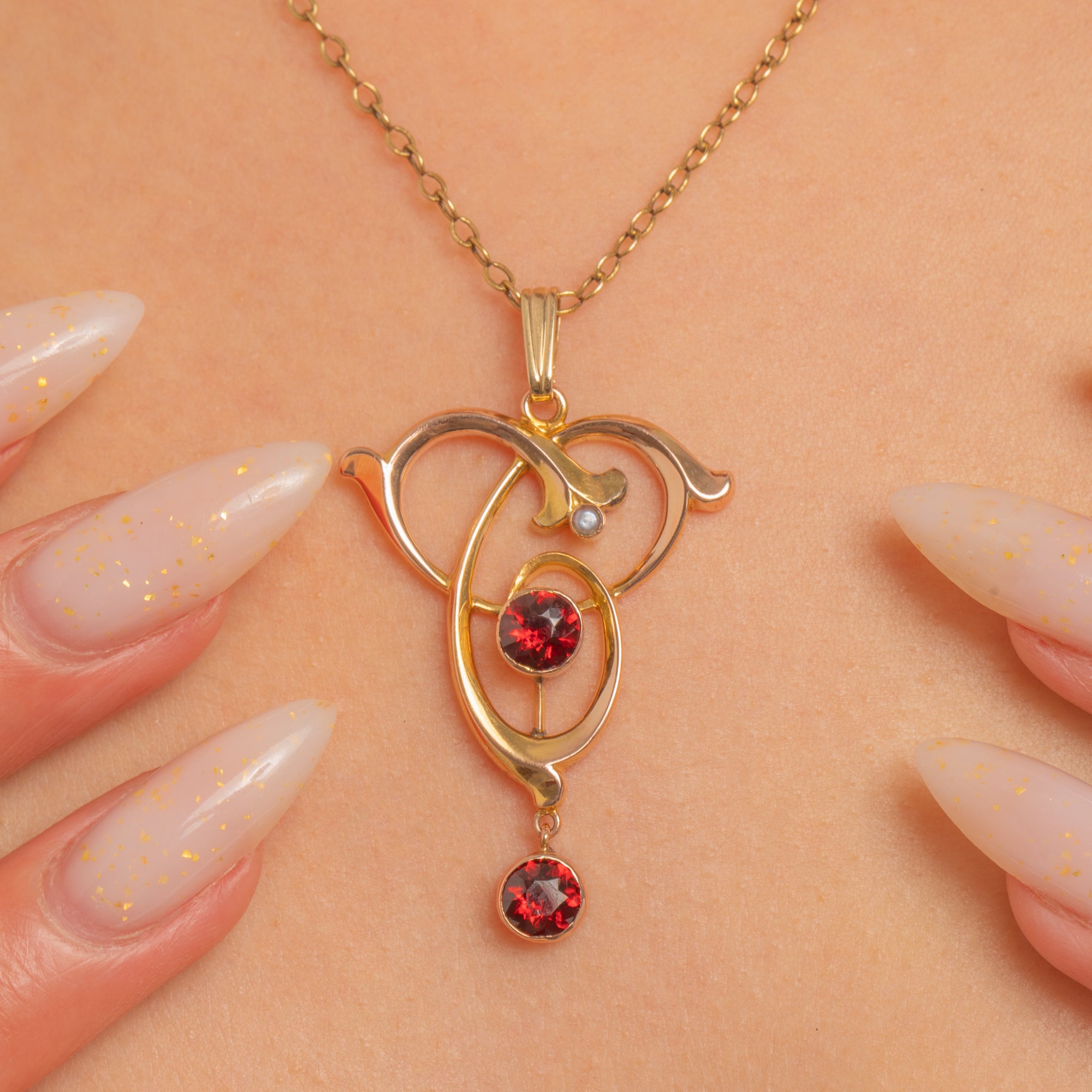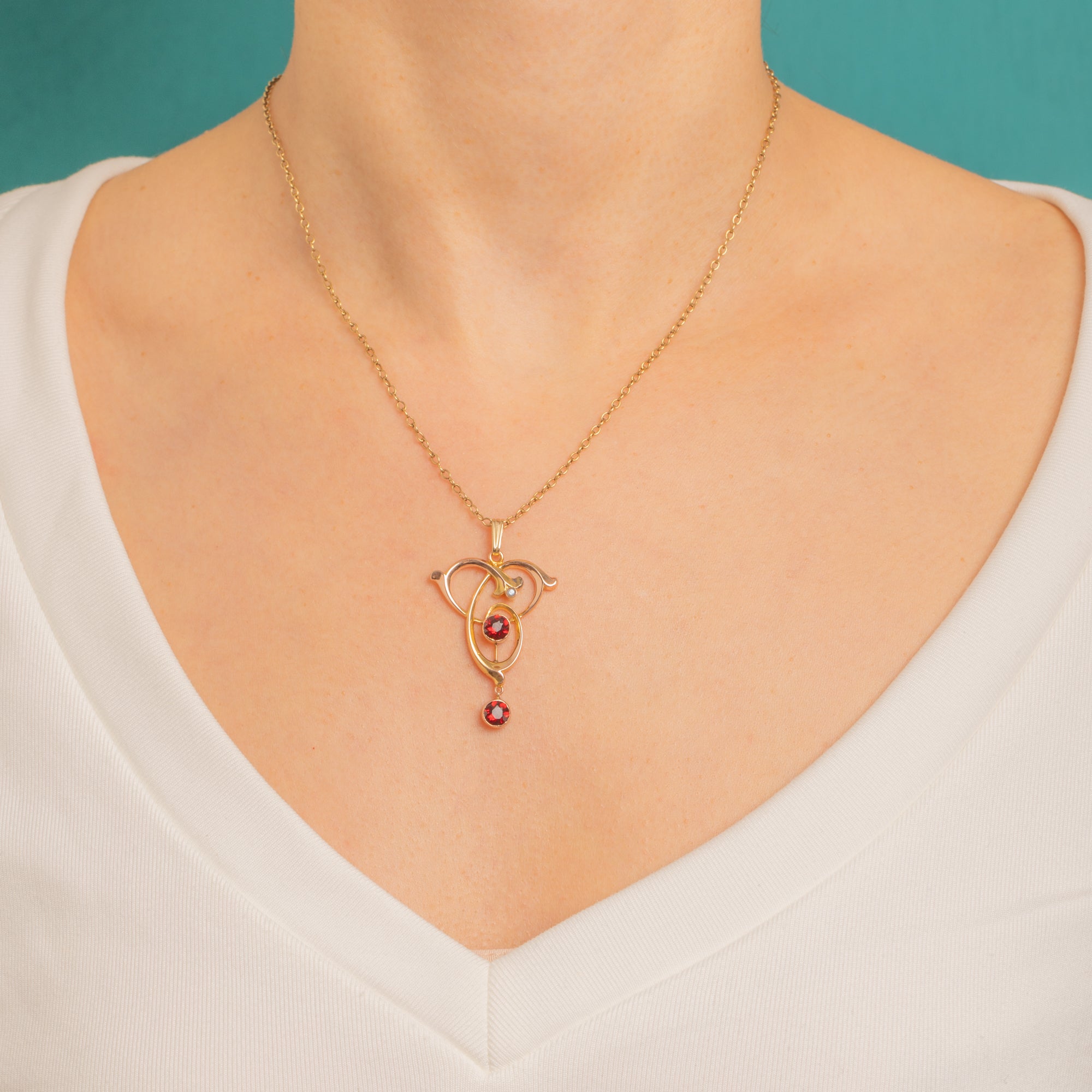 A graceful Art Nouveau pendant in 9ct Gold, designed with flowing, ribbon-like curves that capture the era’s love of organic line and movement. At its centre sits a vivid Garnet, with a second Garnet drop dancing below for that perfect touch of antique drama.
