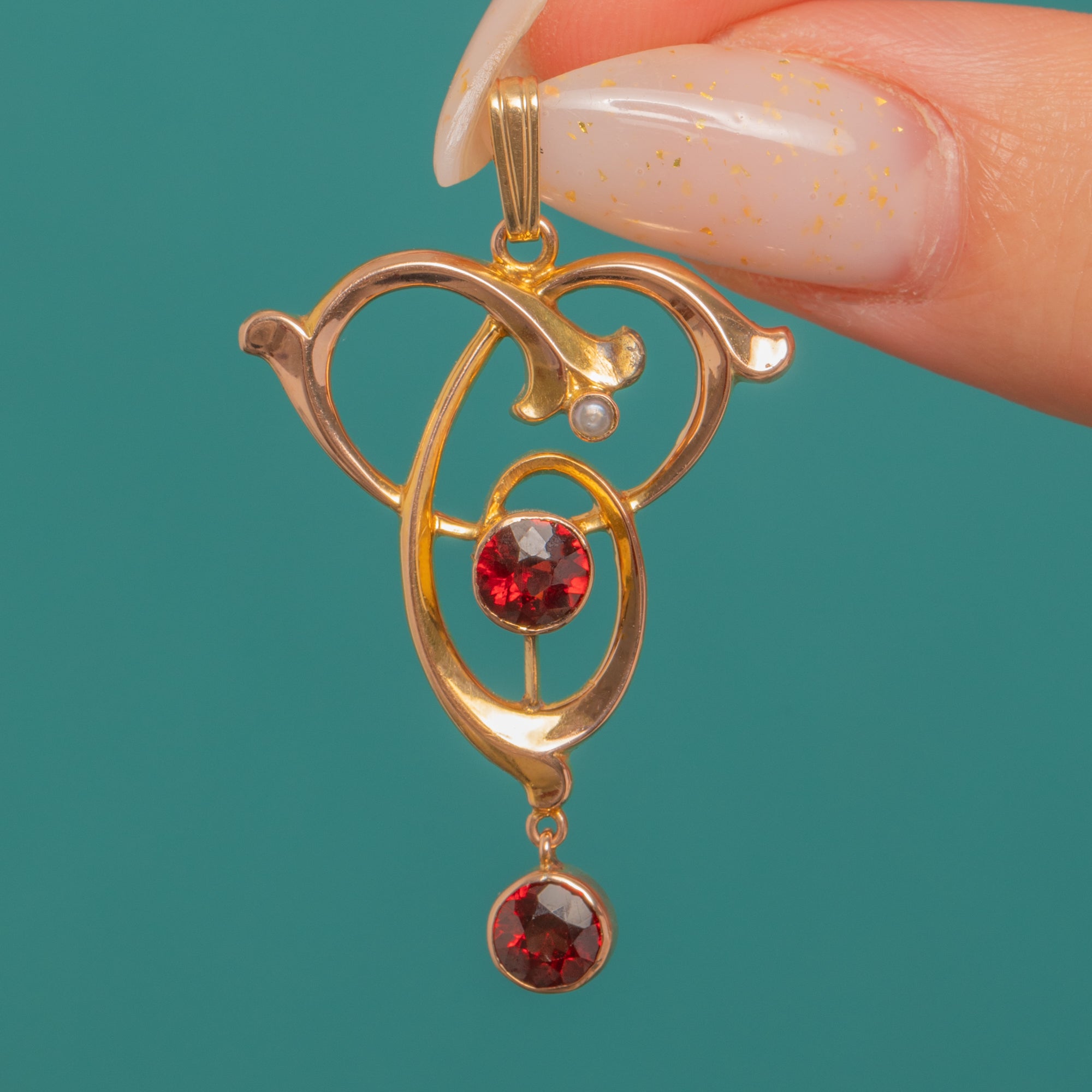 Art Nouveau 9ct Gold Garnet & Pearl Whiplash Drop Pendant
