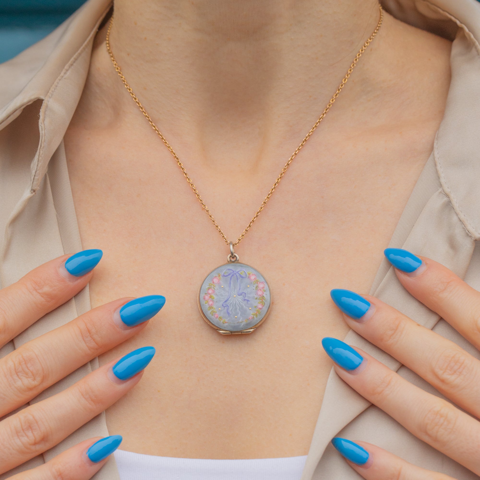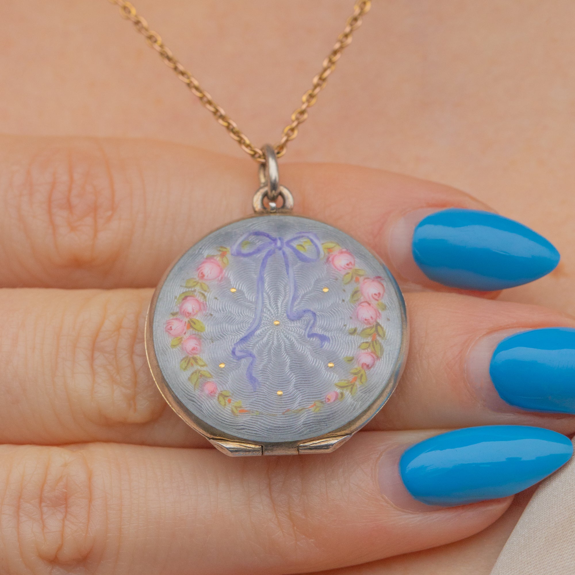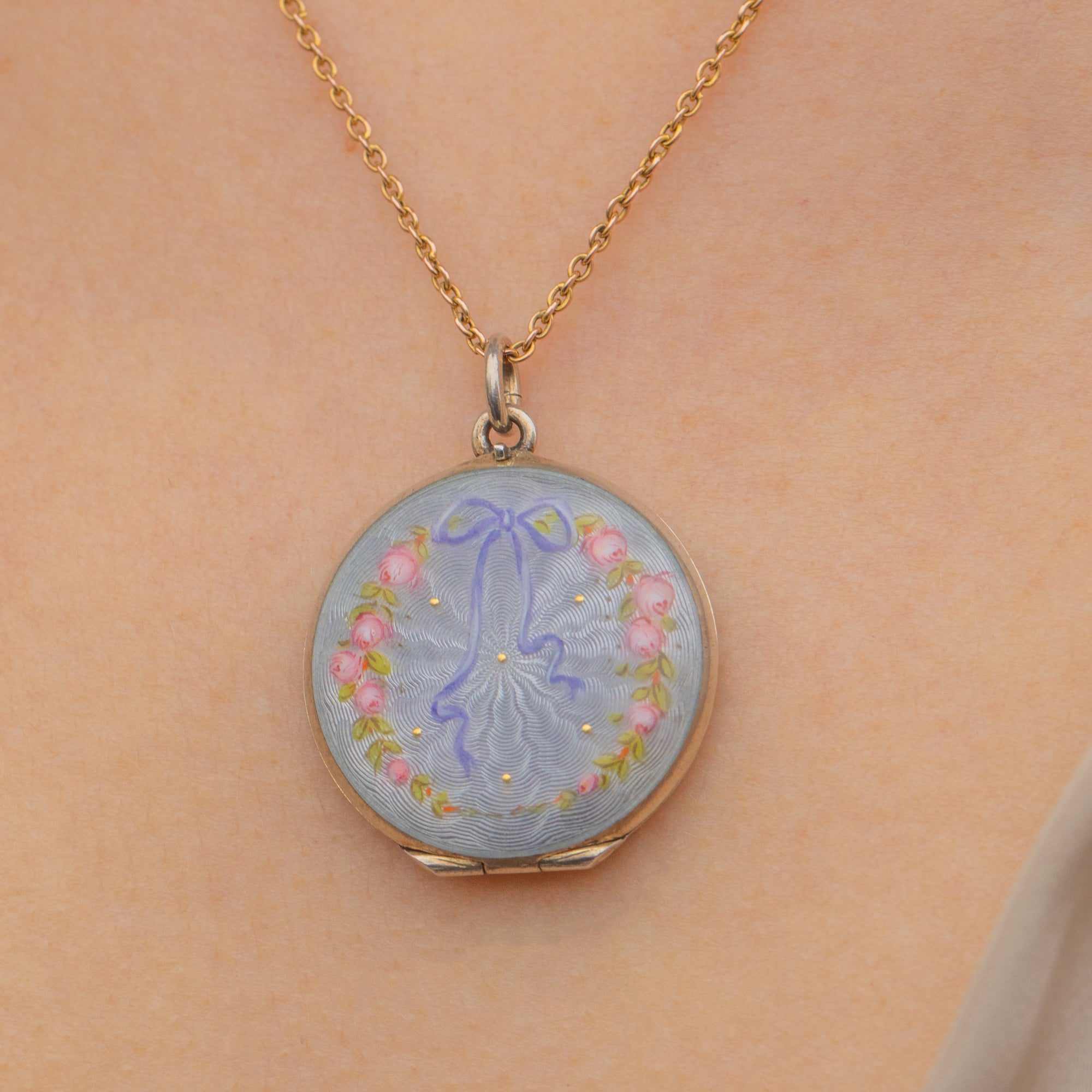 Art Nouveau Guilloche Enamel Locket with Ribbon & Roses