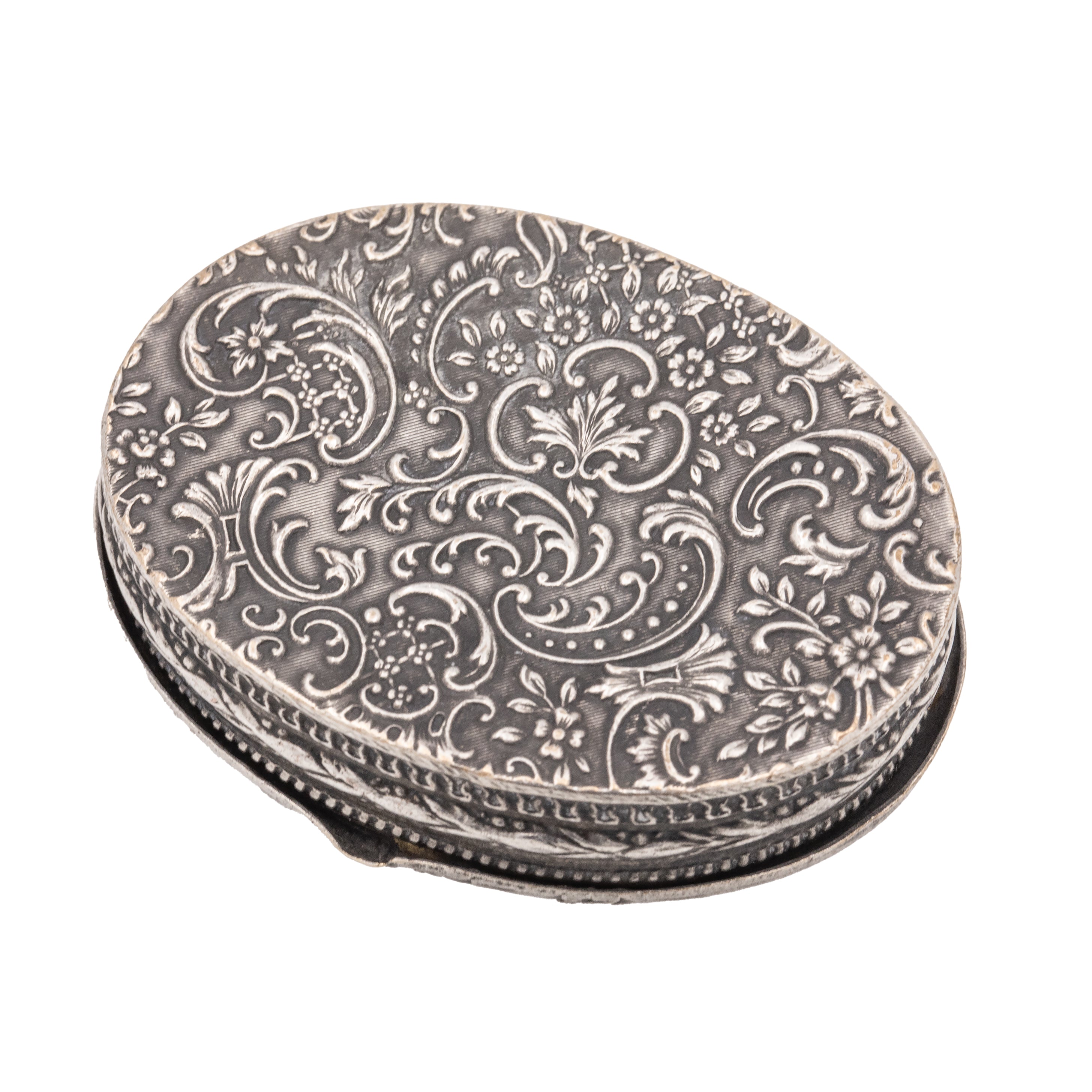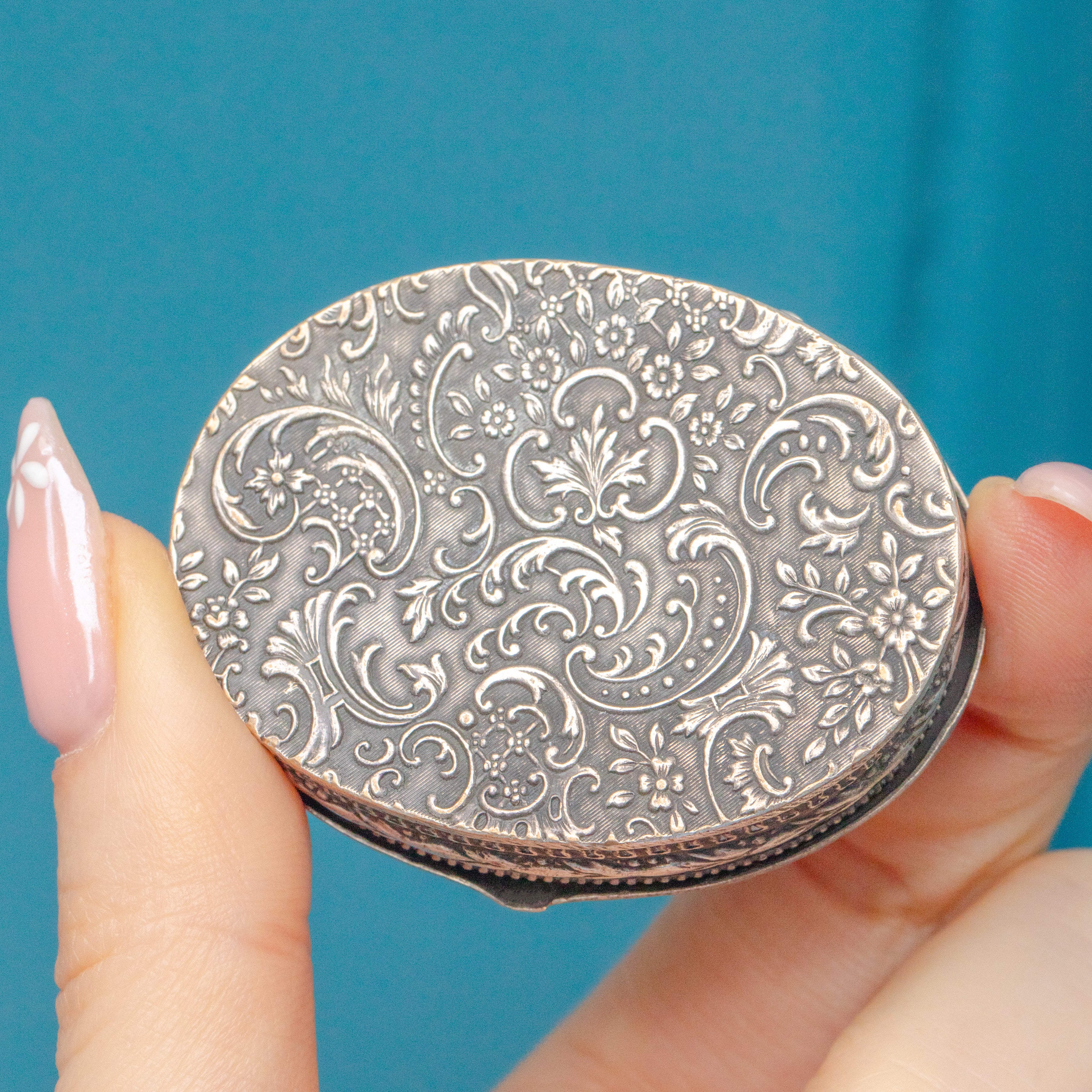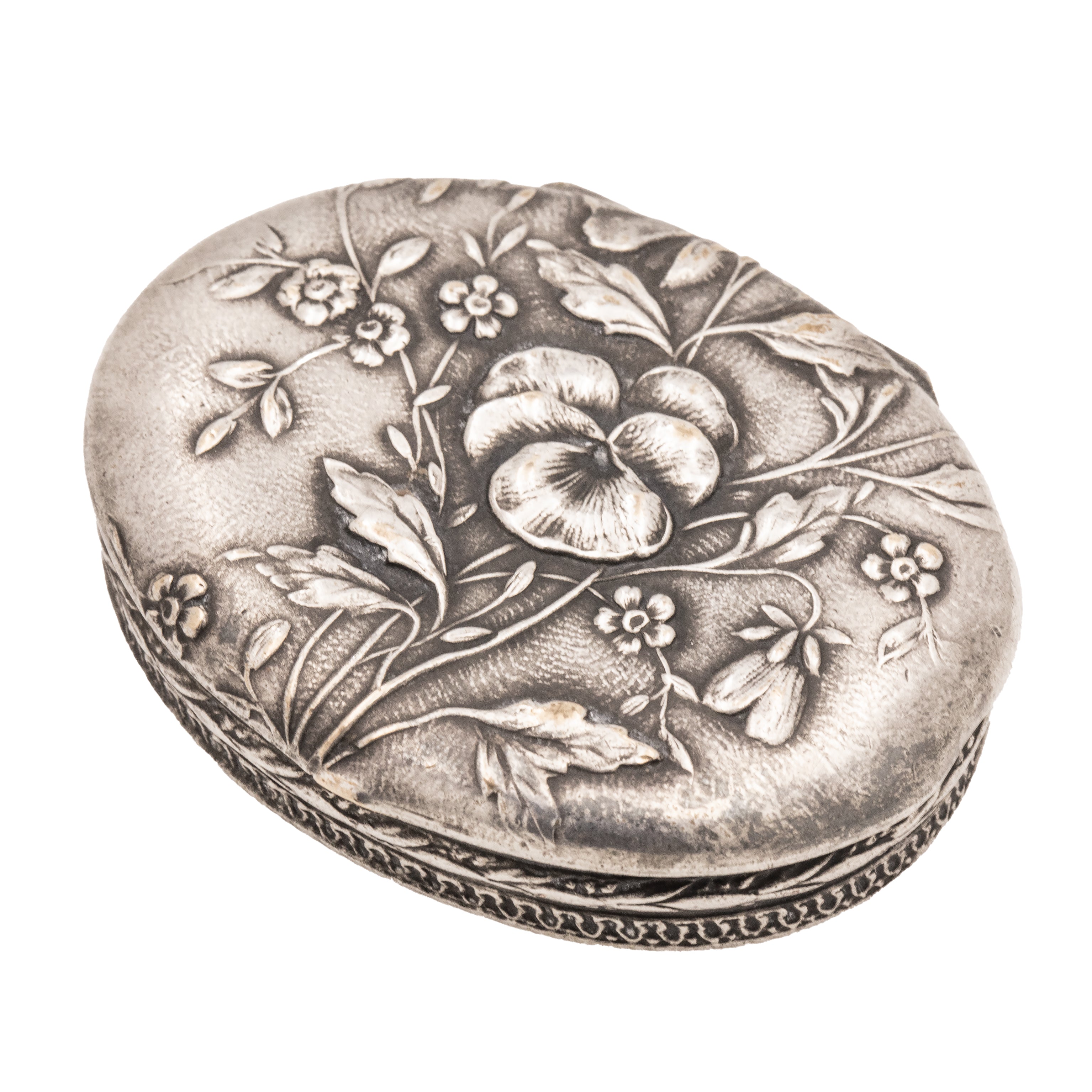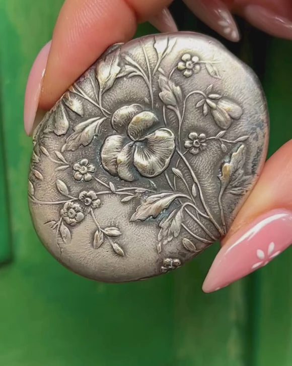 What a delightful Art Nouveau Silver repoussé mirror trinket box this is! Her body is laced with whimsical floral details, flaunting a blooming pansy at the front showcased entirely using the repoussé metalwork technique.