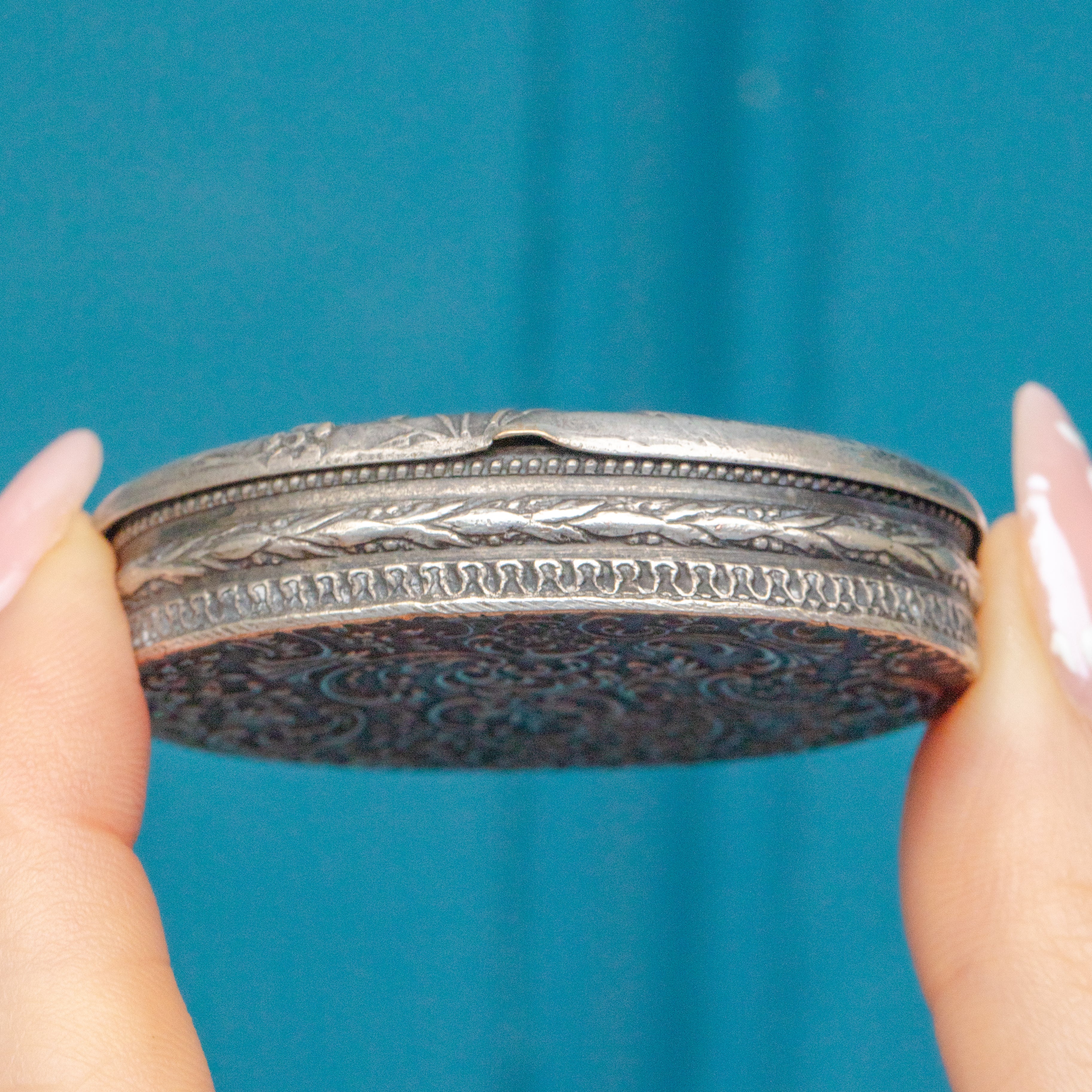 VERY GOOD. This Art Nouveau Silver repoussé mirror trinket box is in very good antique condition! The repoussé detailing is just sensational and has remained crisp, enhanced by the admirable patina that has accrued. To the inside there is some subtle darkening to the Gold gilt, however this does not detract from her overall beauty. The box shuts firmly so you can keep her tucked inside your bag safely. Such a beautifully crafted handmade piece, you won't want to miss the opportunity to make this Art Nouveau trinket yours!