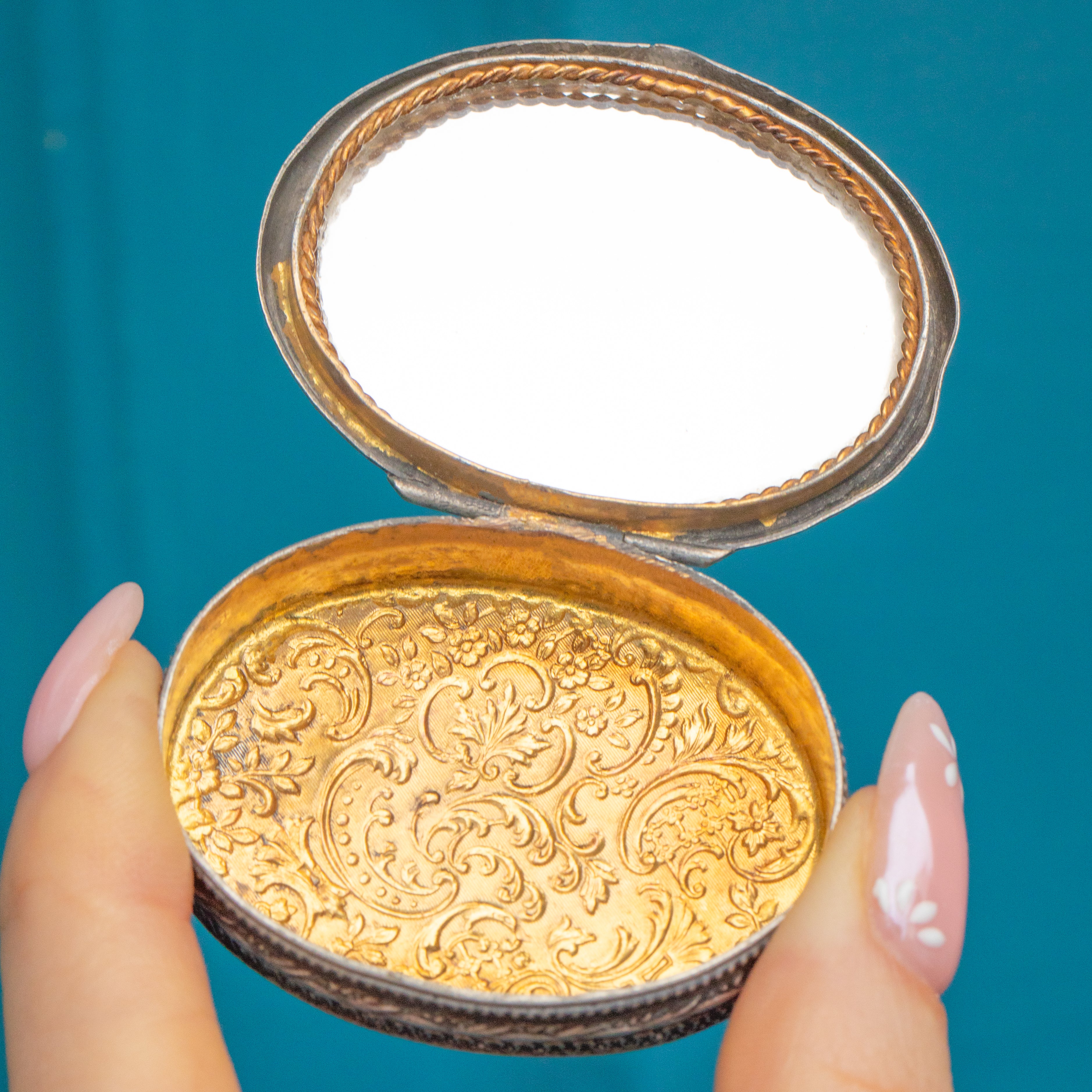 Quintessentially Art Nouveau in design, open this antique trinket box to reveal her dainty mirror in the lid with space to hold your most prized possessions in the base. Coated in Gold gilding inside, when open her acanthus leaf base gleams, lighting up your face as you look in the mirror. Antique in age with timeless beauty, this Silver trinket box has it all!