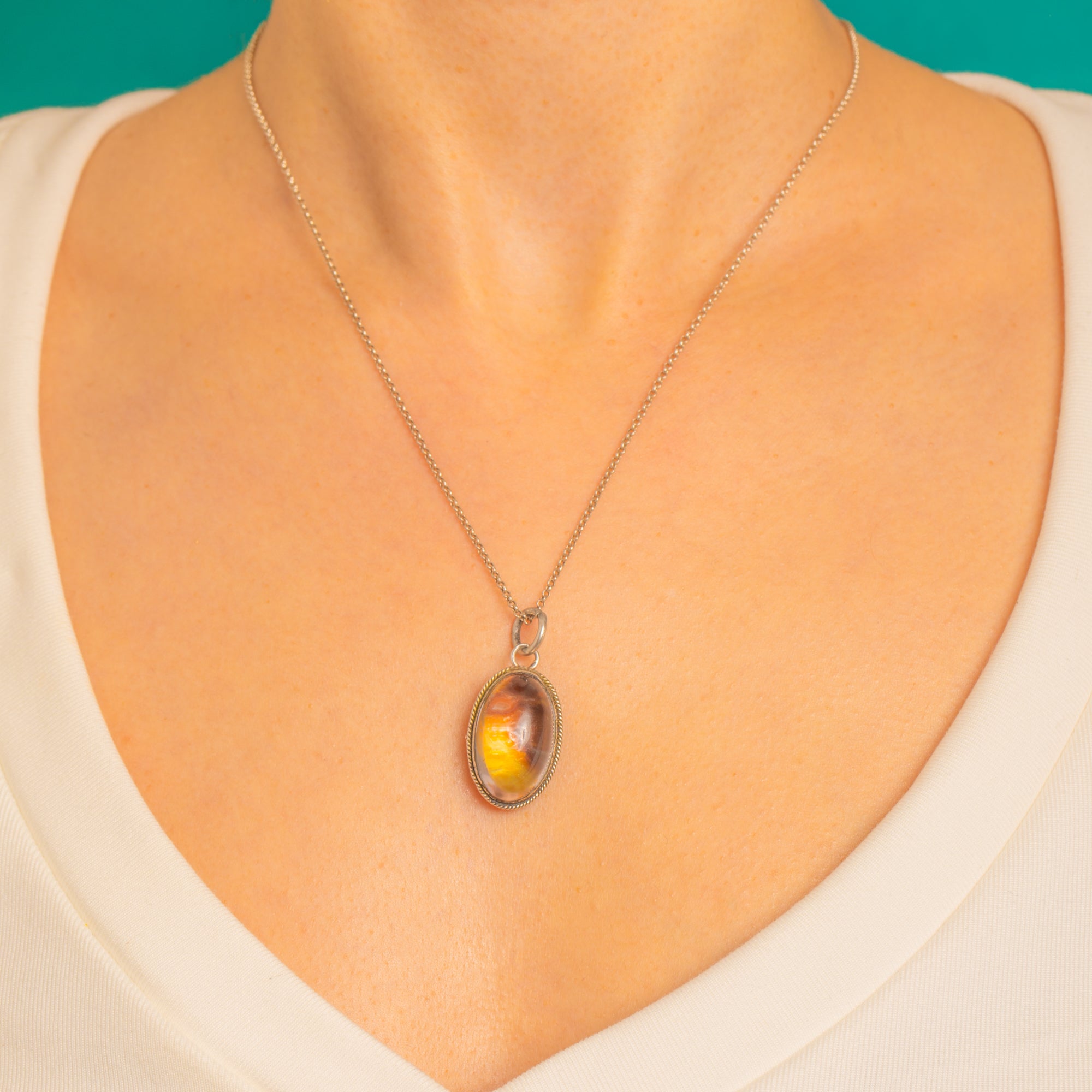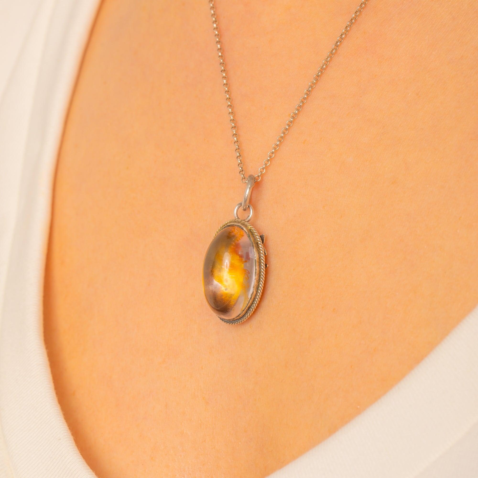 Glowing with serene clarity, this Art Nouveau pendant centres on a high oval Rock Crystal cabochon. A subtle, time-softened foil behind the Crystal lends a gentle, honeyed warmth to the otherwise transparent dome, while a hand-worked rope-twist border frames the stone with artisanal charm.