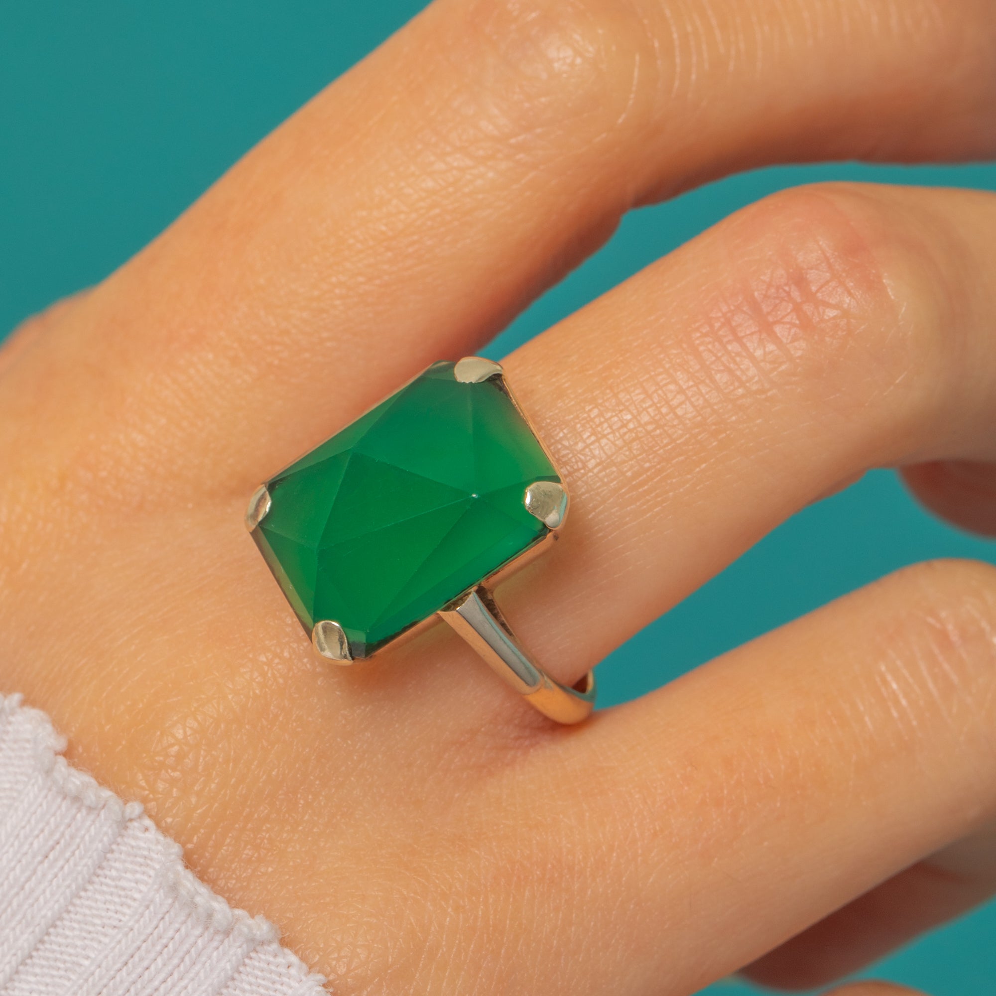 The open-back setting lets light pour through the stone for maximum glow. A bold yet wearable statement, perfect for adding a fresh pop of green to any look.