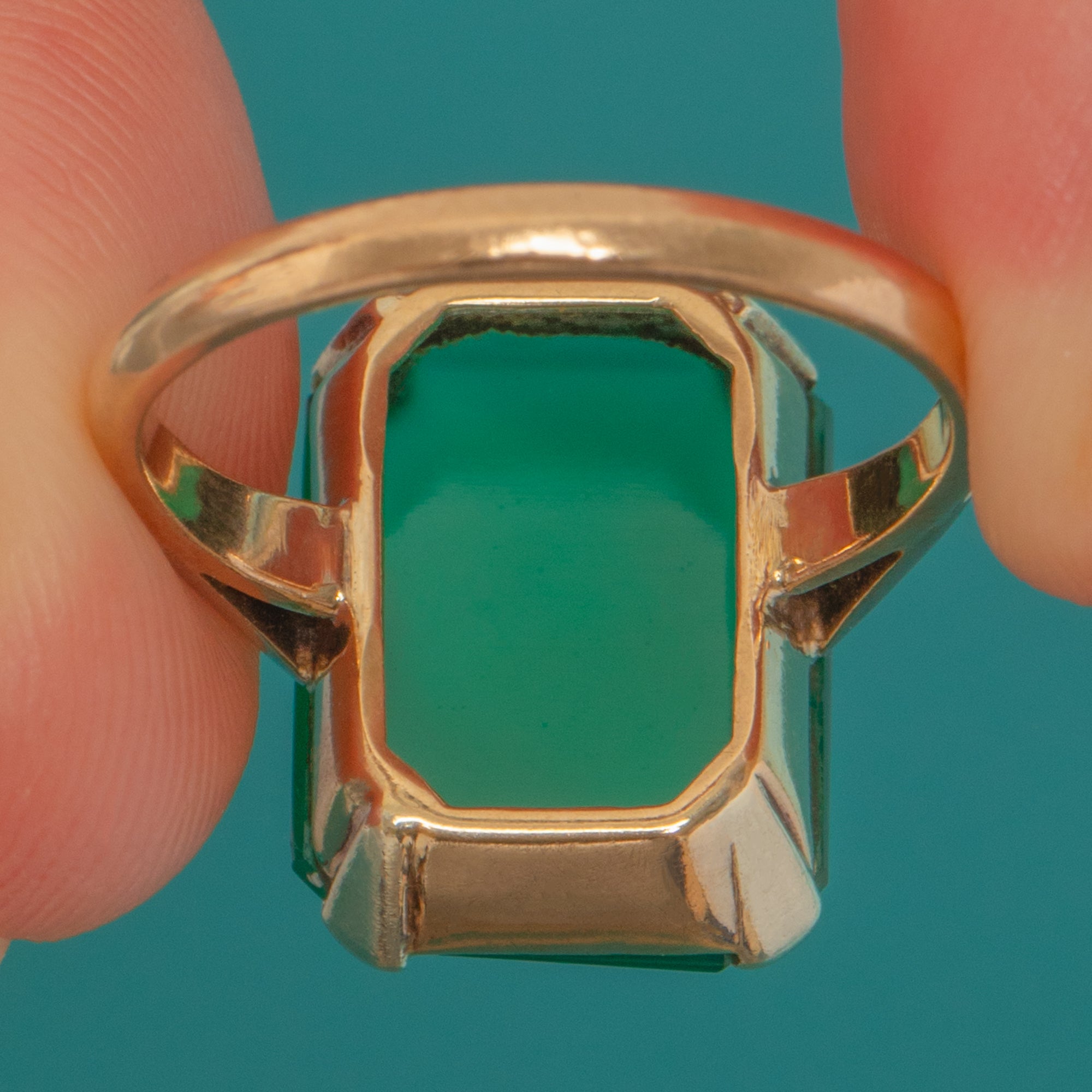 Confident, clean and beautifully architectural, this Arts and Crafts ring centres a vivid green rectangular step-cut Chrysoprase in a striking solitaire presentation. Four substantial corner claws frame the octagonal outline with crisp precision, while the slim knife-edge shank keeps the silhouette sleek and refined.