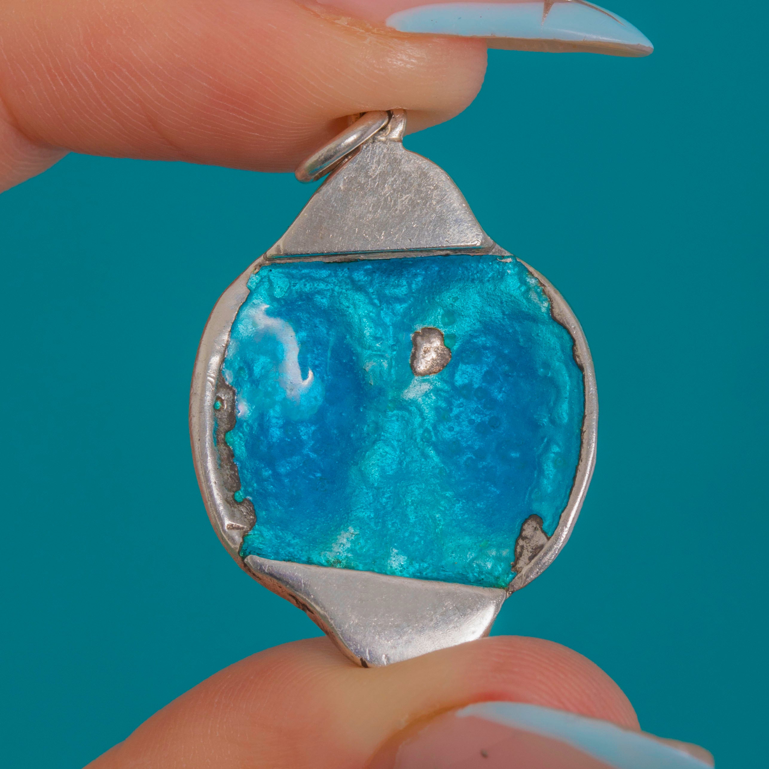A striking Arts and Crafts Silver and Enamel pendant with a bold, sculptural presence. Four recessed Enamel cells are divided by raised Silver partitions, forming a stylised, biomorphic motif. The glossy Enamel shimmers in saturated turquoise and cobalt blues with lively green flashes, delivering a rich play of colour against the cool Silver frame.