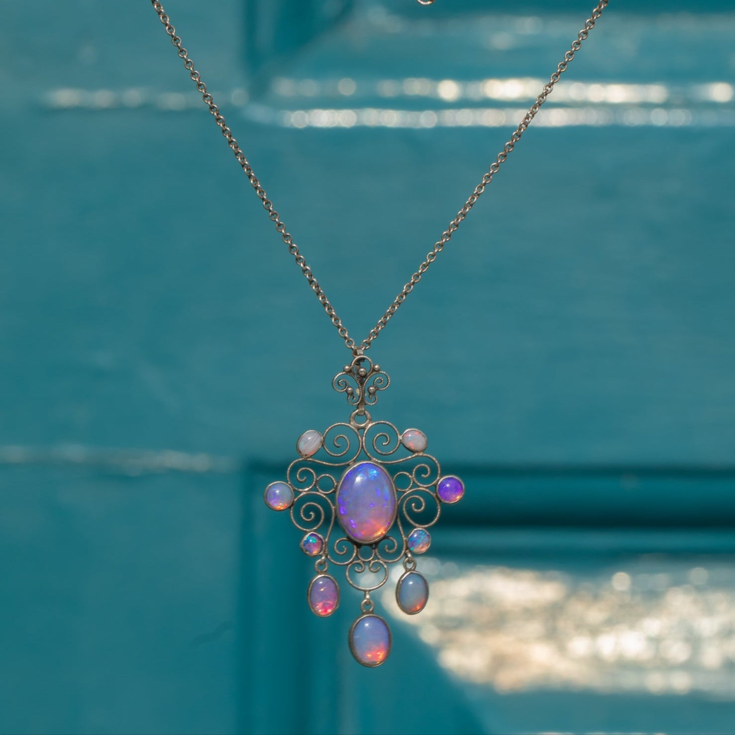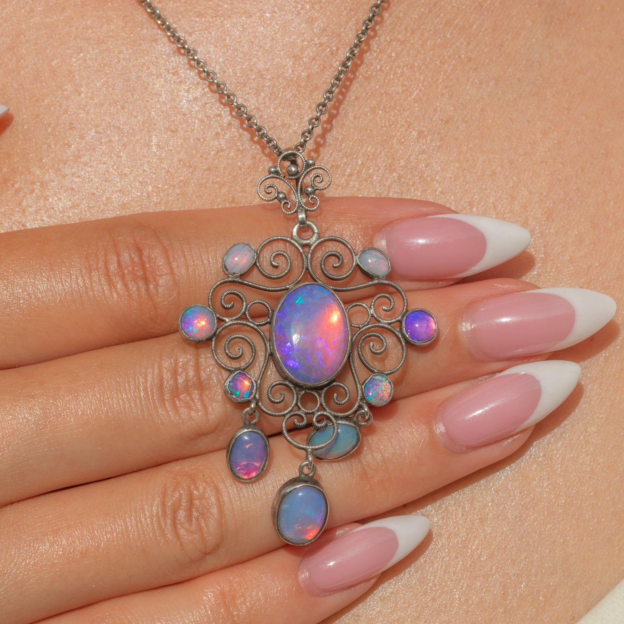 This Arts & Crafts pendant is set with captivating “Dragonsbreath” Glass cabochons, glowing with pink tones and a characteristic iridescent flash. The large 10 x 13mm central stone is framed by an ornate arrangement of smaller pink glass gems, graduating in size for a harmonious, handcrafted look.