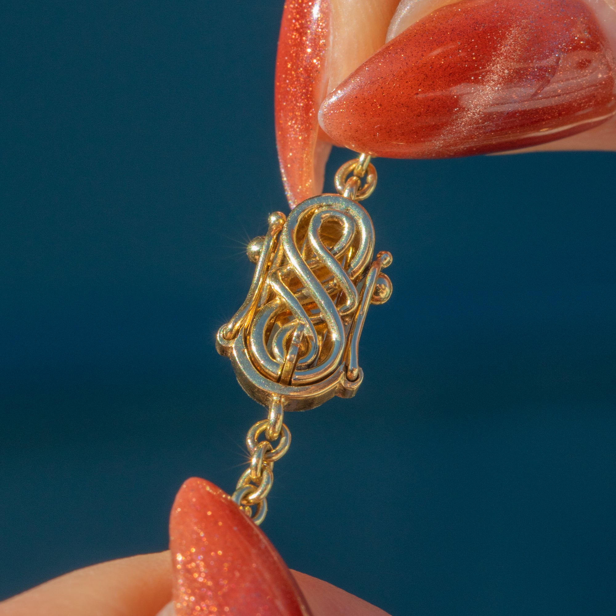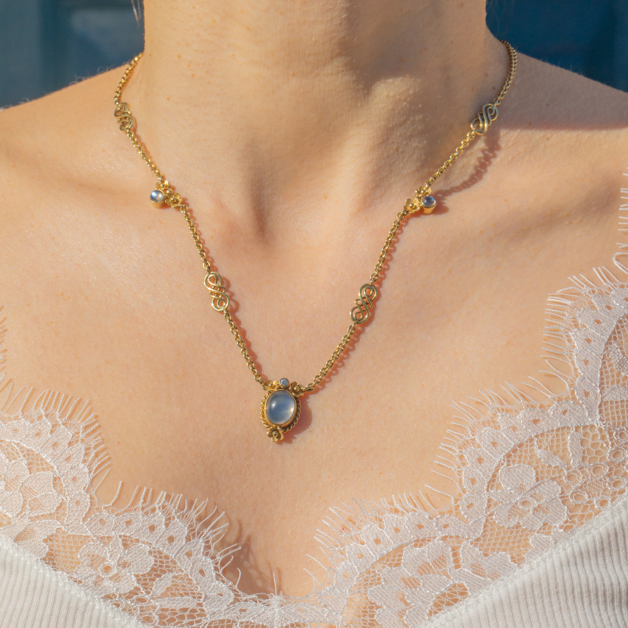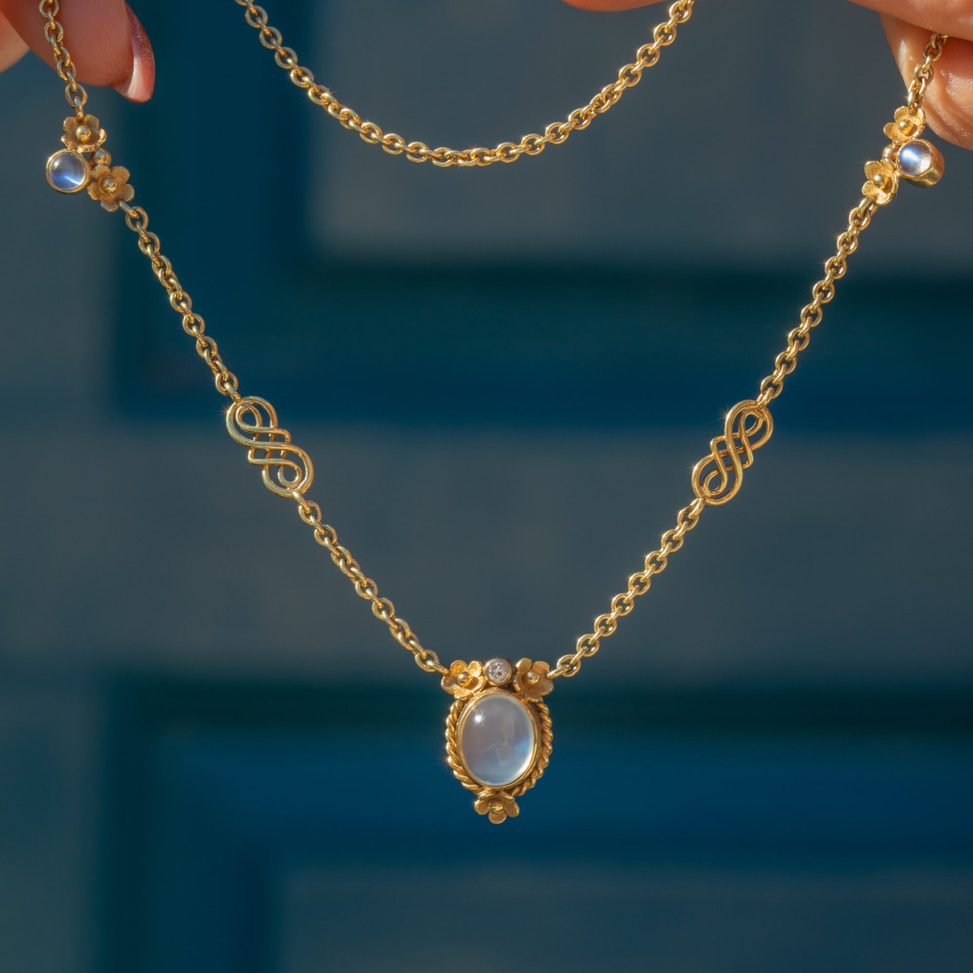 Crafted from 14ct yellow Gold, this Art Nouveau necklace has a lovely saturation throughout, perfectly complementing the ethereal adularescence of the Moonstones, which are decorated with dainty flower accents.
