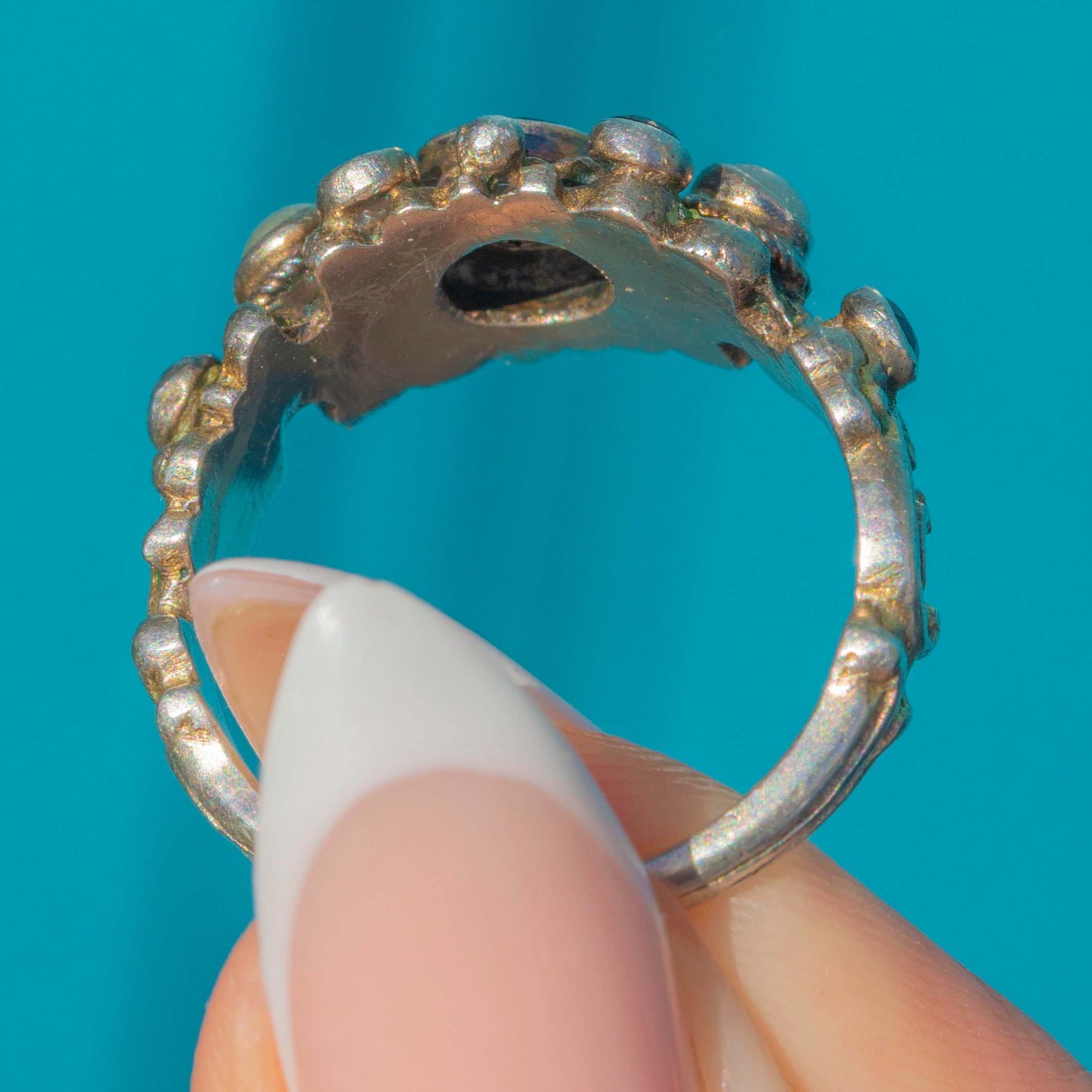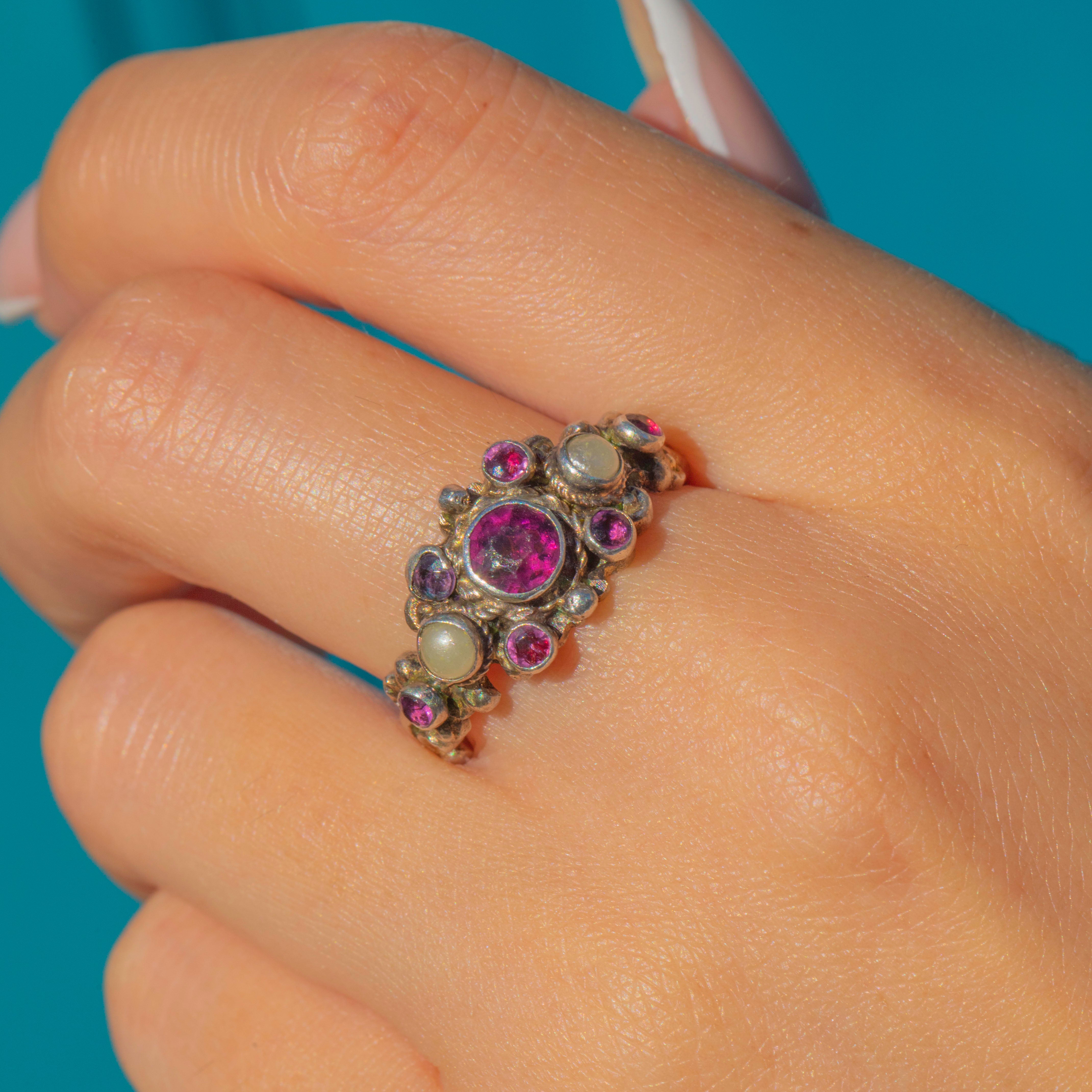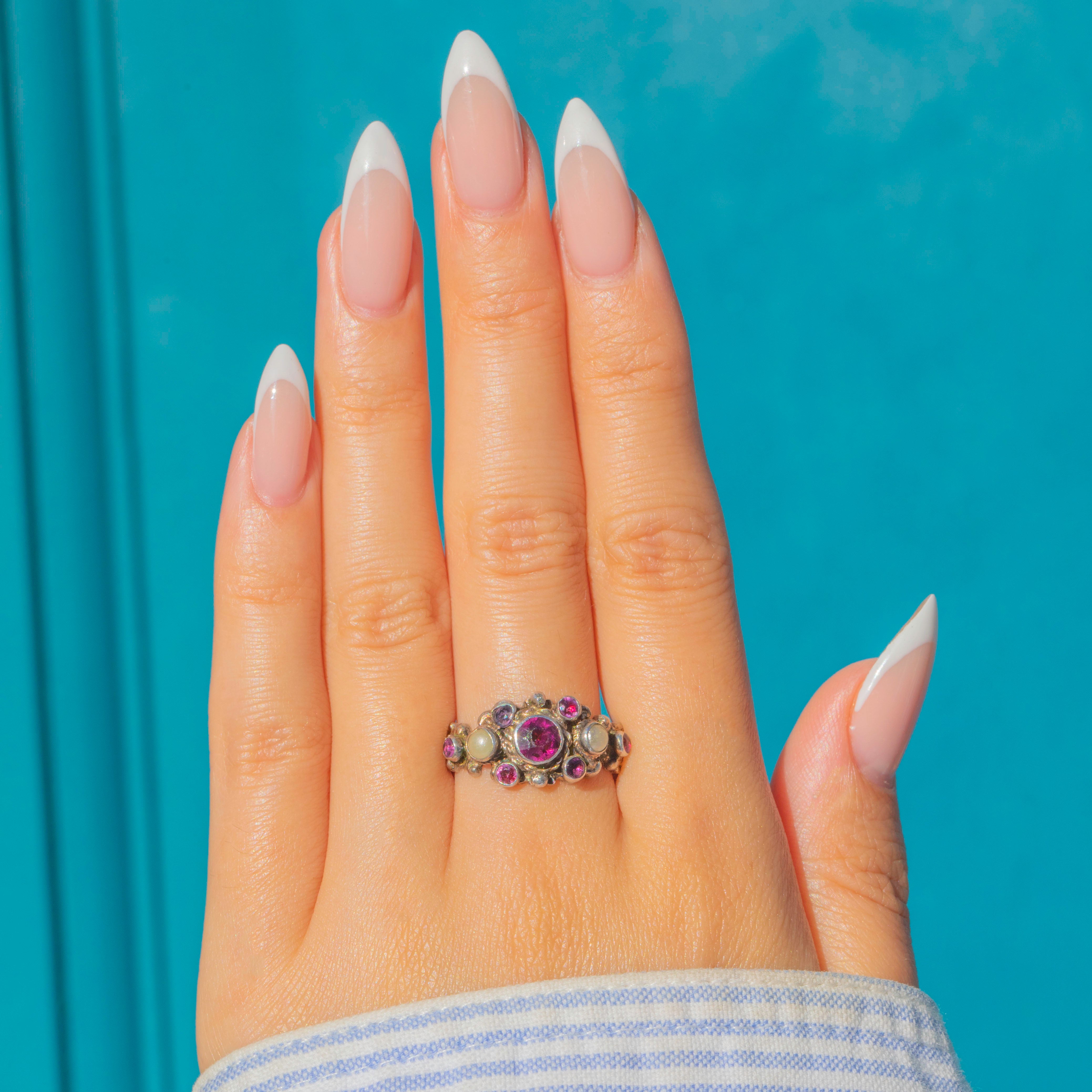 This ornate Austro-Hungarian ring, c.1900, is crafted in Silver and set with glowing red Garnets and luminous natural Pearls. The rich colour contrast and detailed repoussé work are characteristic of the region’s celebrated jewellery tradition, blending opulence with craftsmanship.