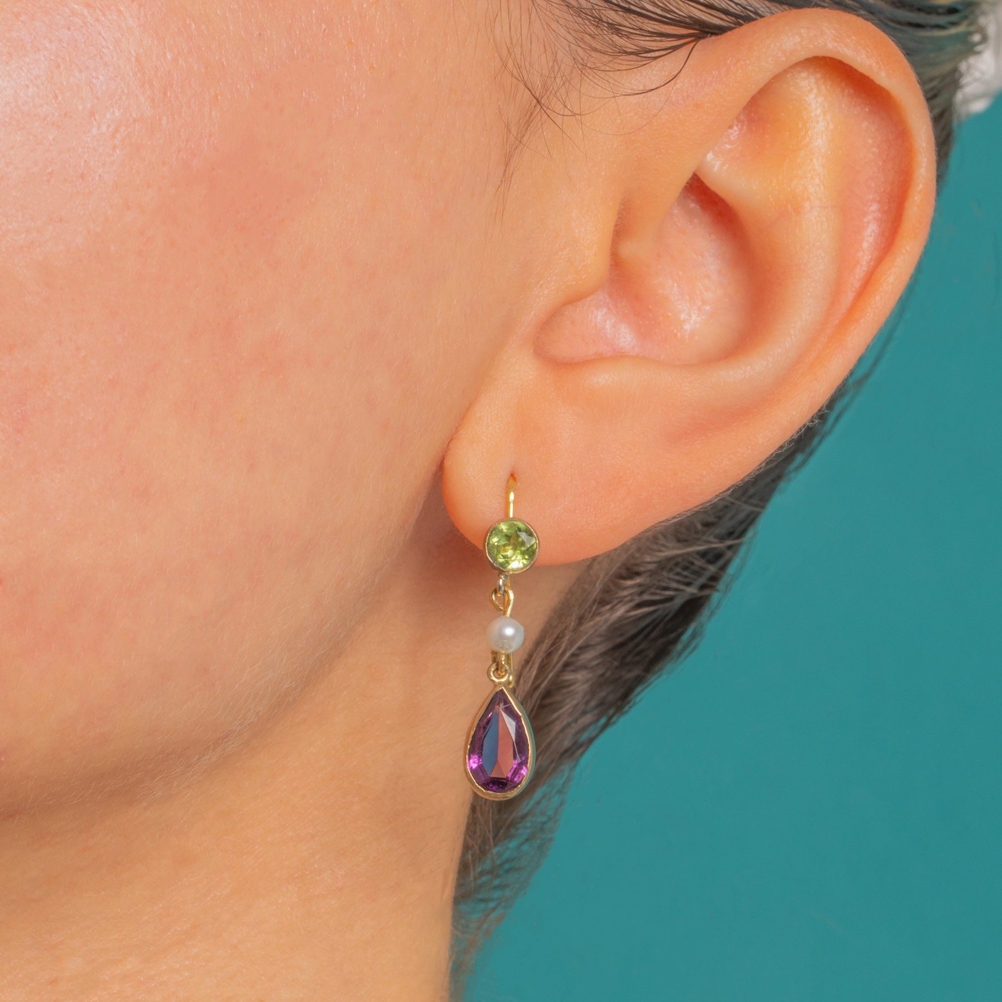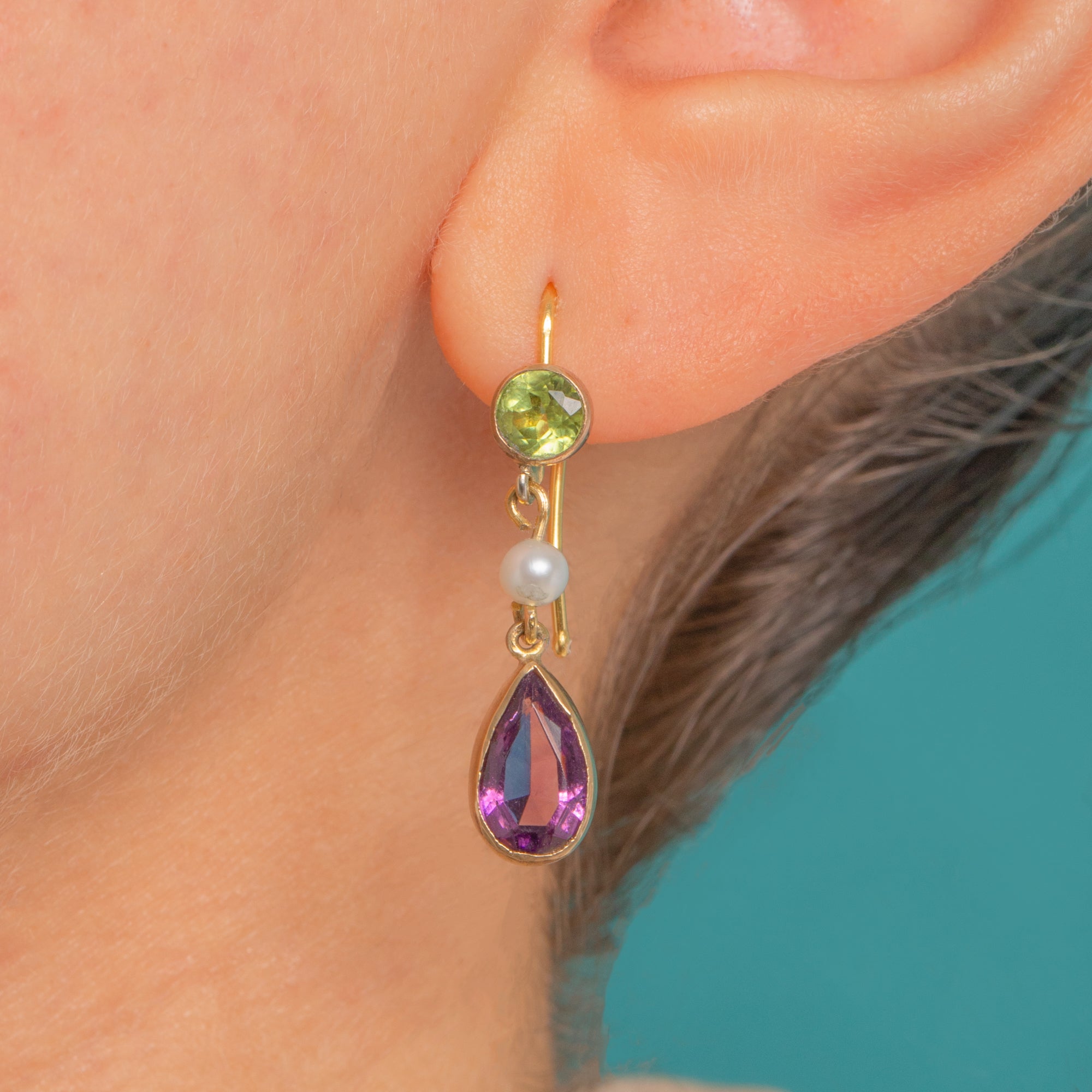A timeless pair of Edwardian Suffragette drop earrings, finely crafted in warm 9ct Gold. Lively round Peridots crown each drop, offset by a petite white Pearl spacer and finished with vivid pear‑cut Amethysts in sleek, smooth bezel settings. The articulated three‑part design lends elegant movement, with the classic green‑white‑violet palette glowing beautifully against the Gold.