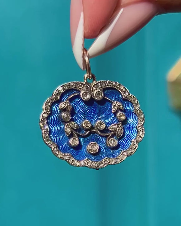 Belle Époque 15ct Gold & Silver Blue Guilloché Enamel & Rose-Cut Diamond Pendant, c.1890