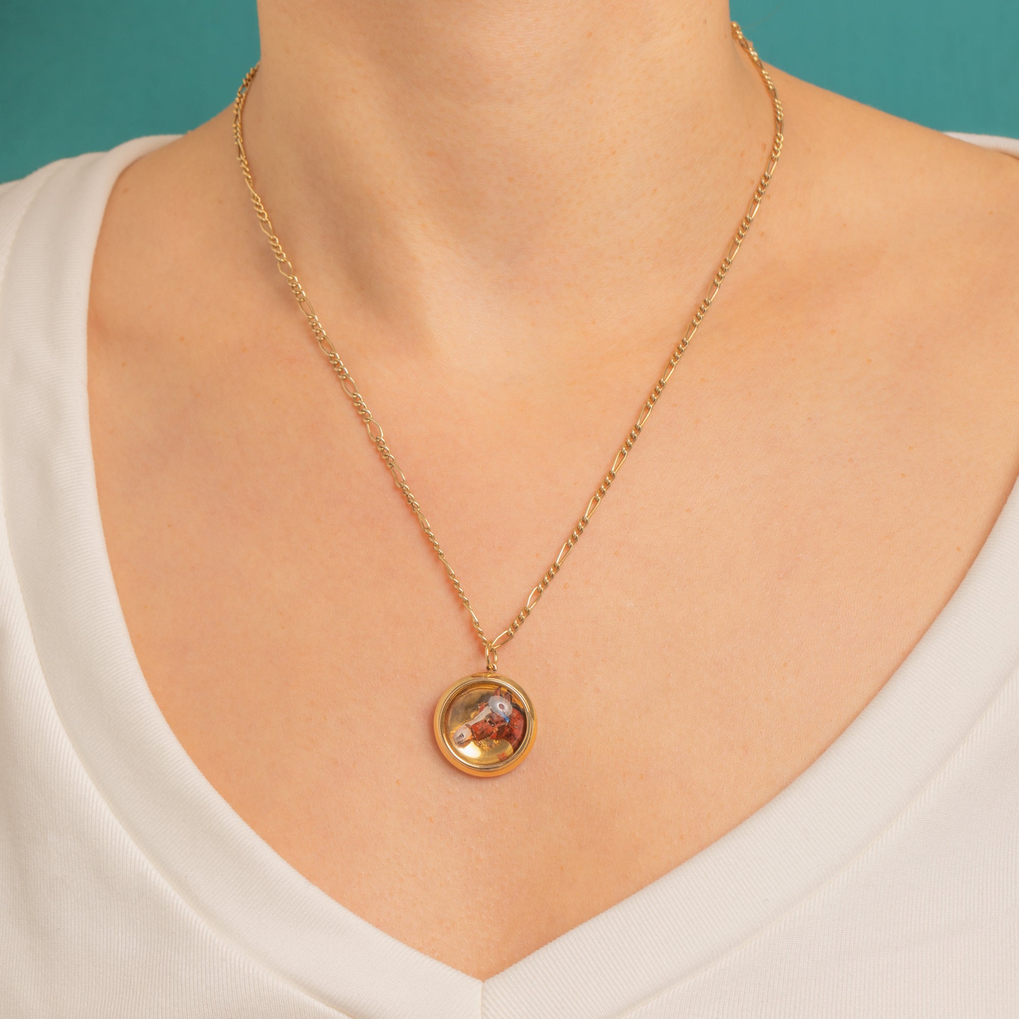 Charming and beautifully evocative, this Victorian 15ct Gold Essex Crystal pendant, c.1880, celebrates the timeless allure of the equestrian motif. Beneath the domed crystal, a finely rendered chestnut horse with a striking white blaze and a delicate blue browband rests against a warm golden ground, all framed by a sleek polished bezel.