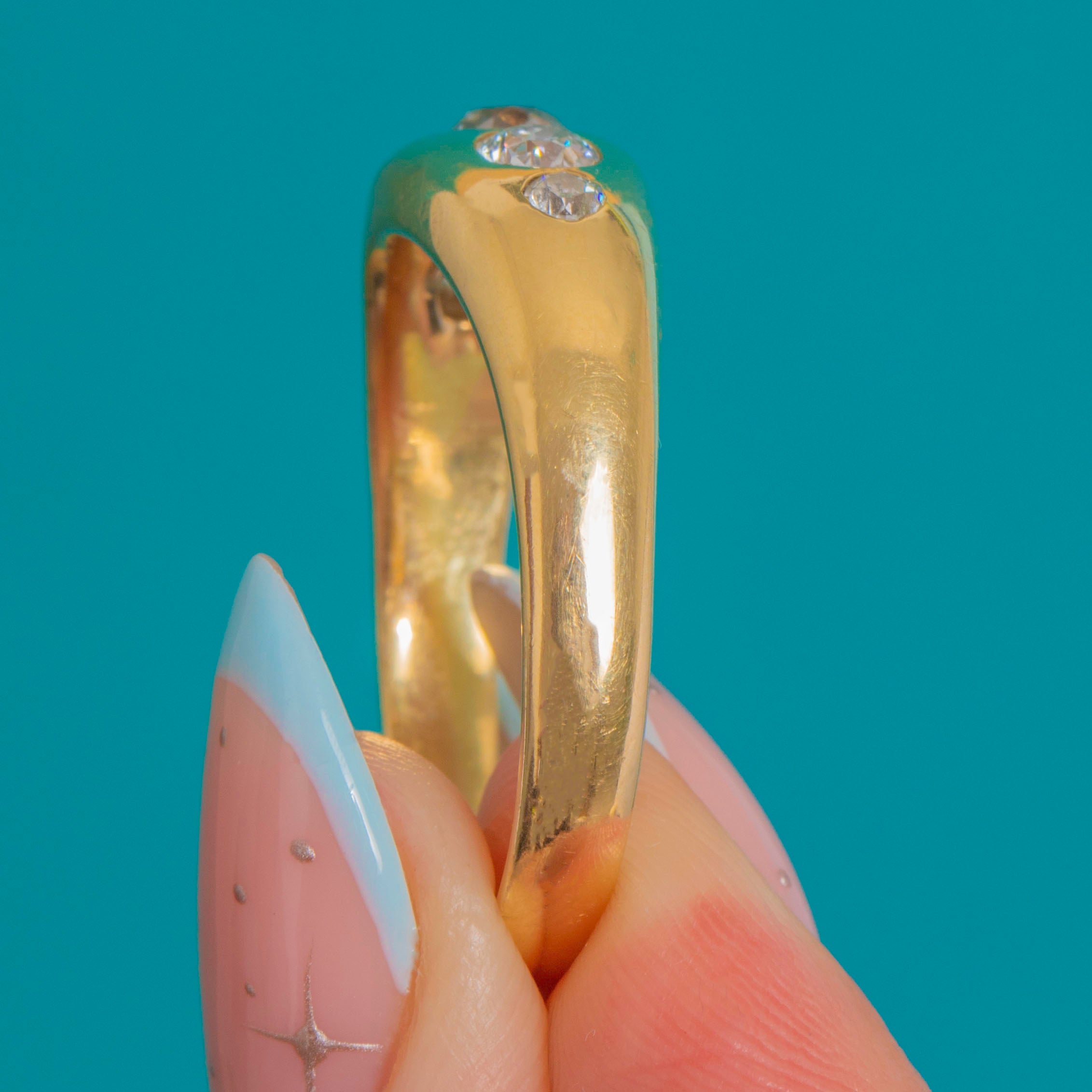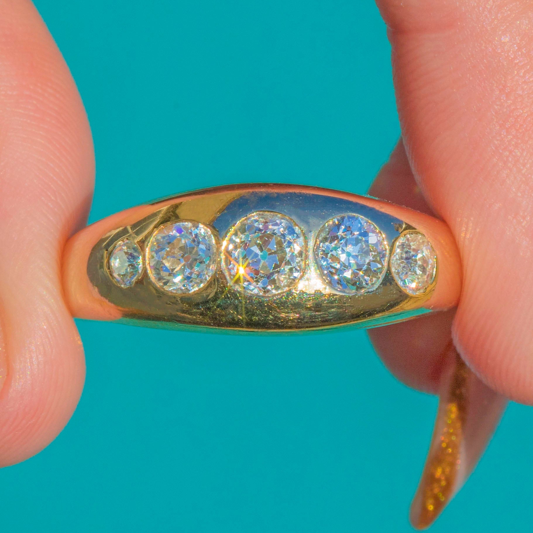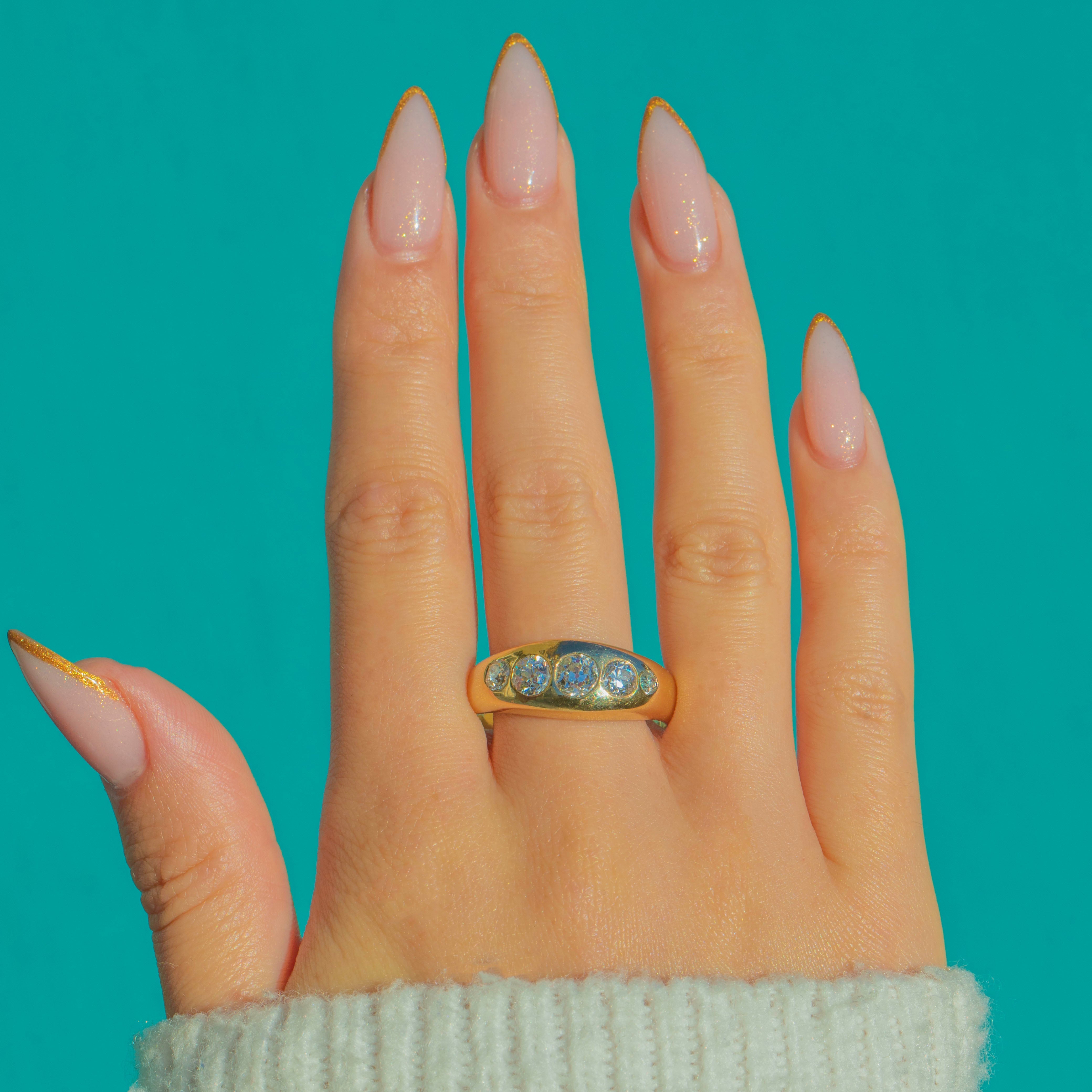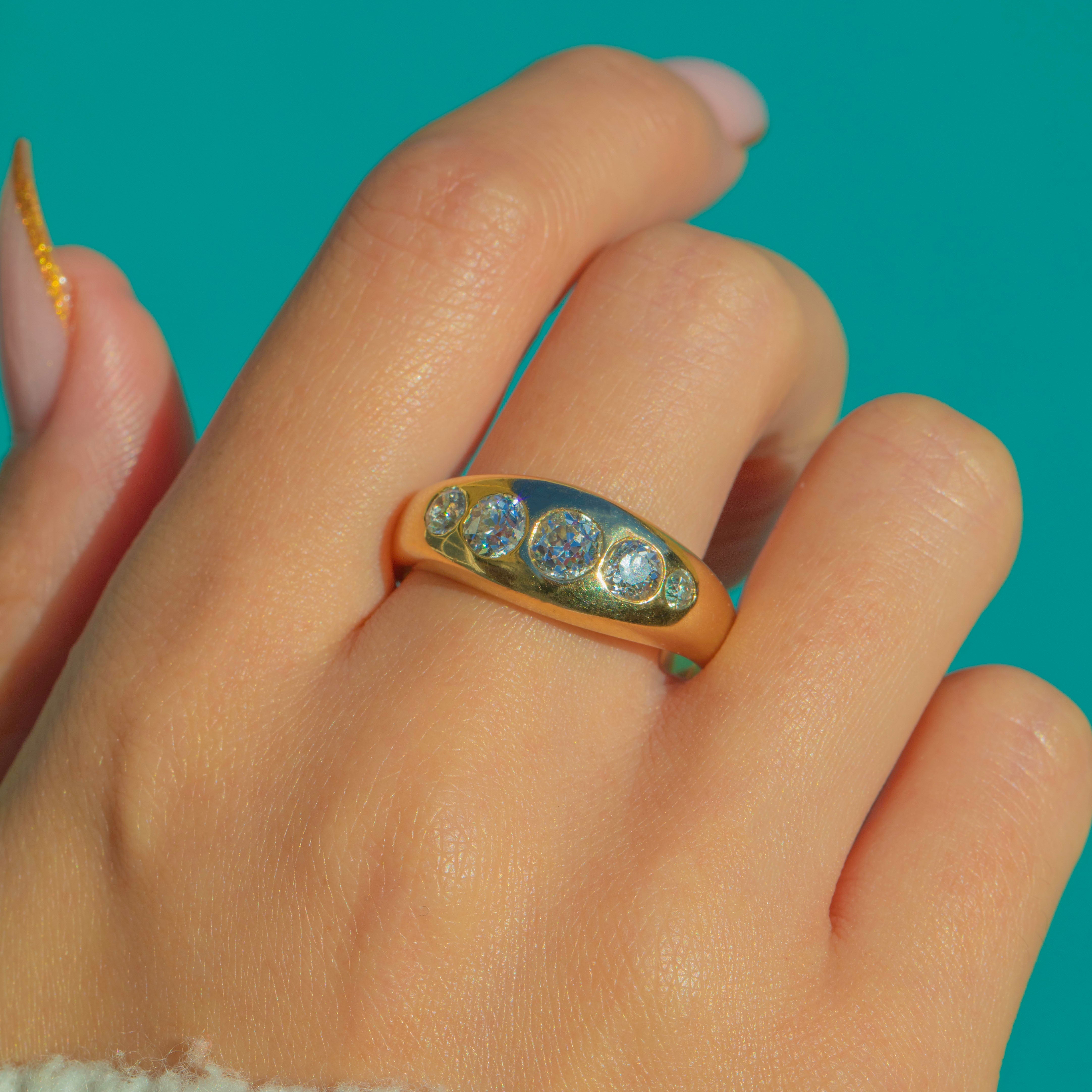 This bold and beautifully executed vintage ring showcases a glorious spread of old cut Diamonds, flush-set into a thick, gleaming band of 14ct Gold. Brimming with vintage charm, each Diamond displays the crisp facets, high crowns and lively brilliance that make old cuts so enduringly beloved.