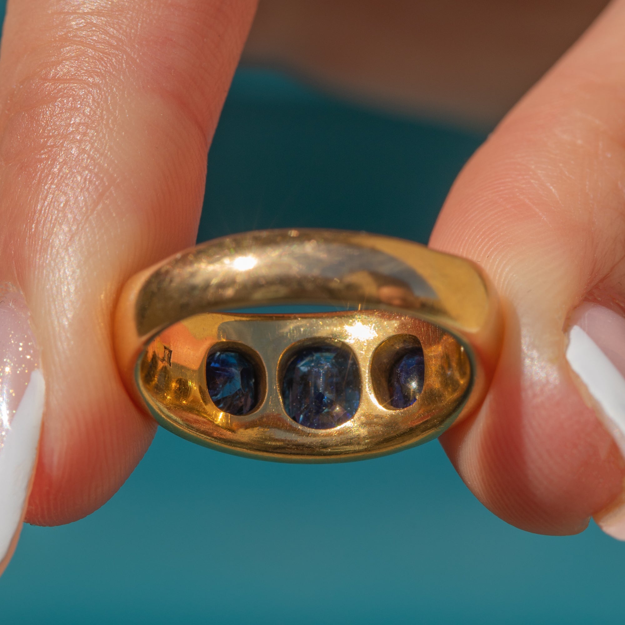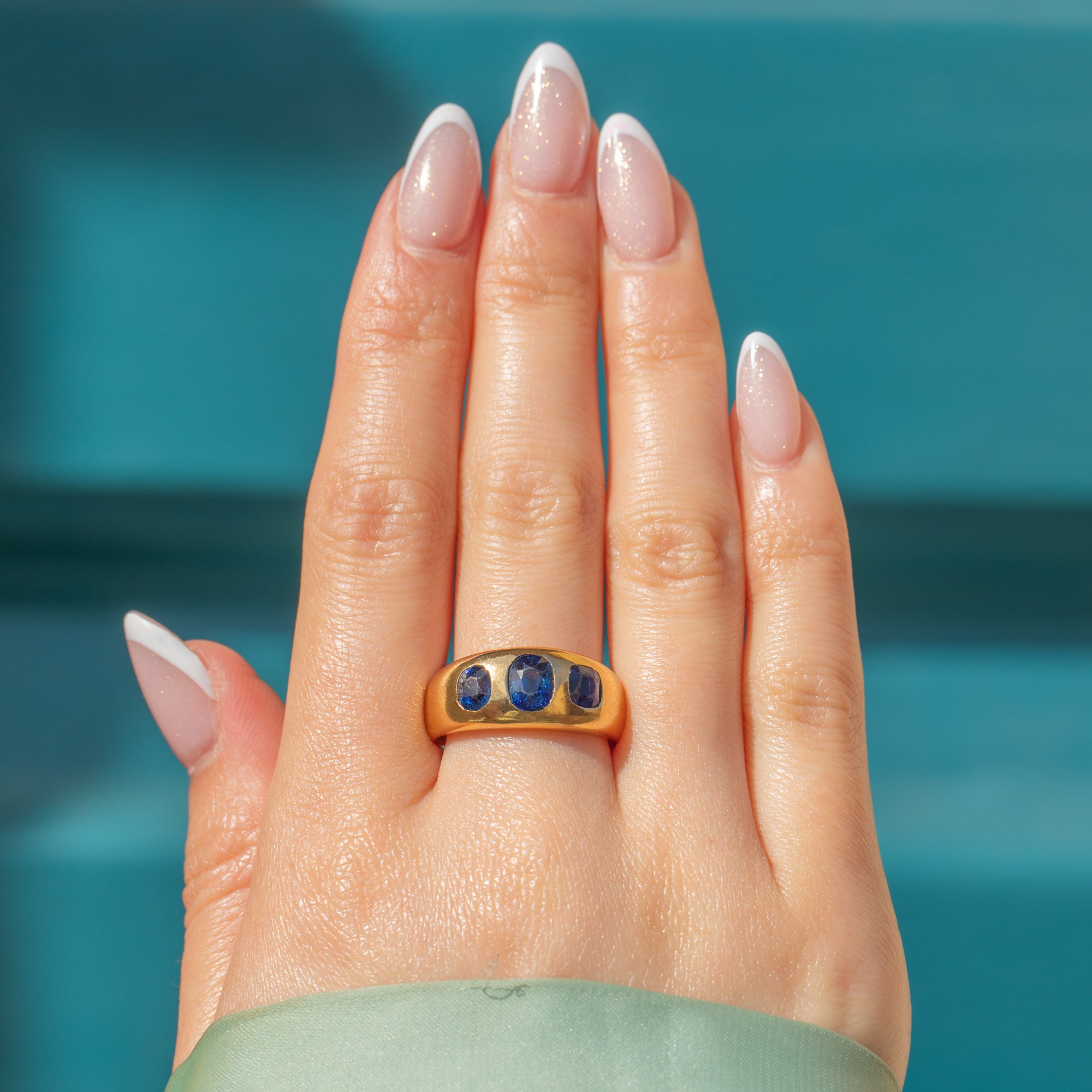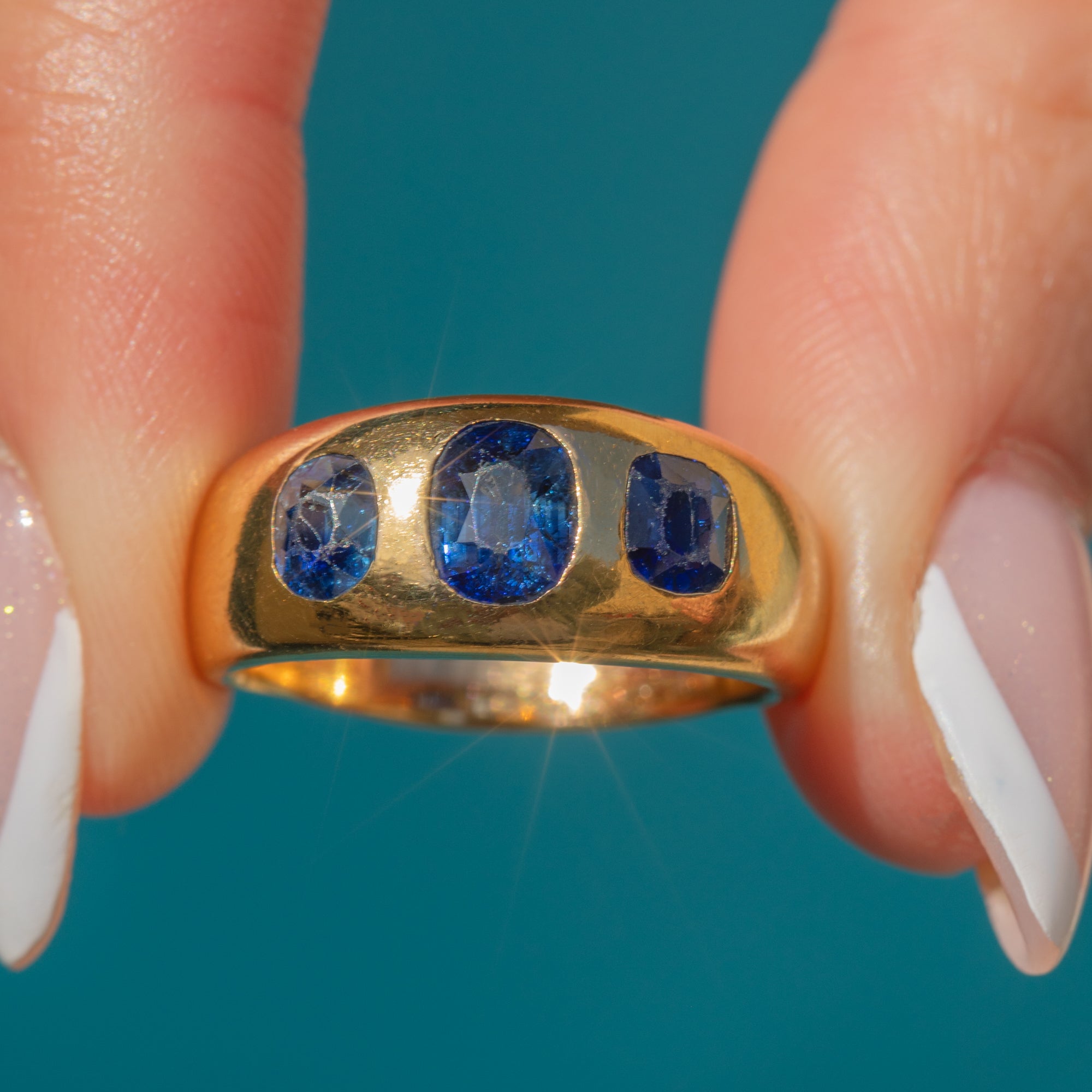 This chunky 18ct Gold flush-set Natural Sapphire gypsy ring is a striking piece! This Victorian-era gypsy ring is crafted from solid 18ct gold, boasting a bold, chunky design that epitomises the unique designs of the era. At her centre sits three stunning flush-set Natural Sapphires, their deep blue hues beautifully complementing the rich warmth of the Gold.