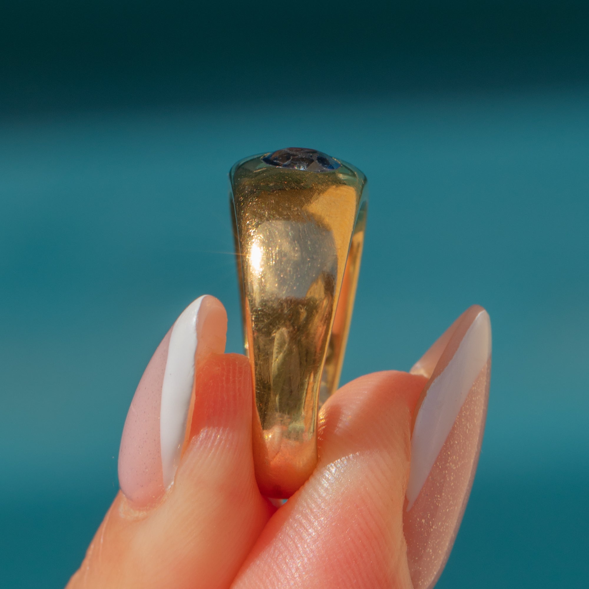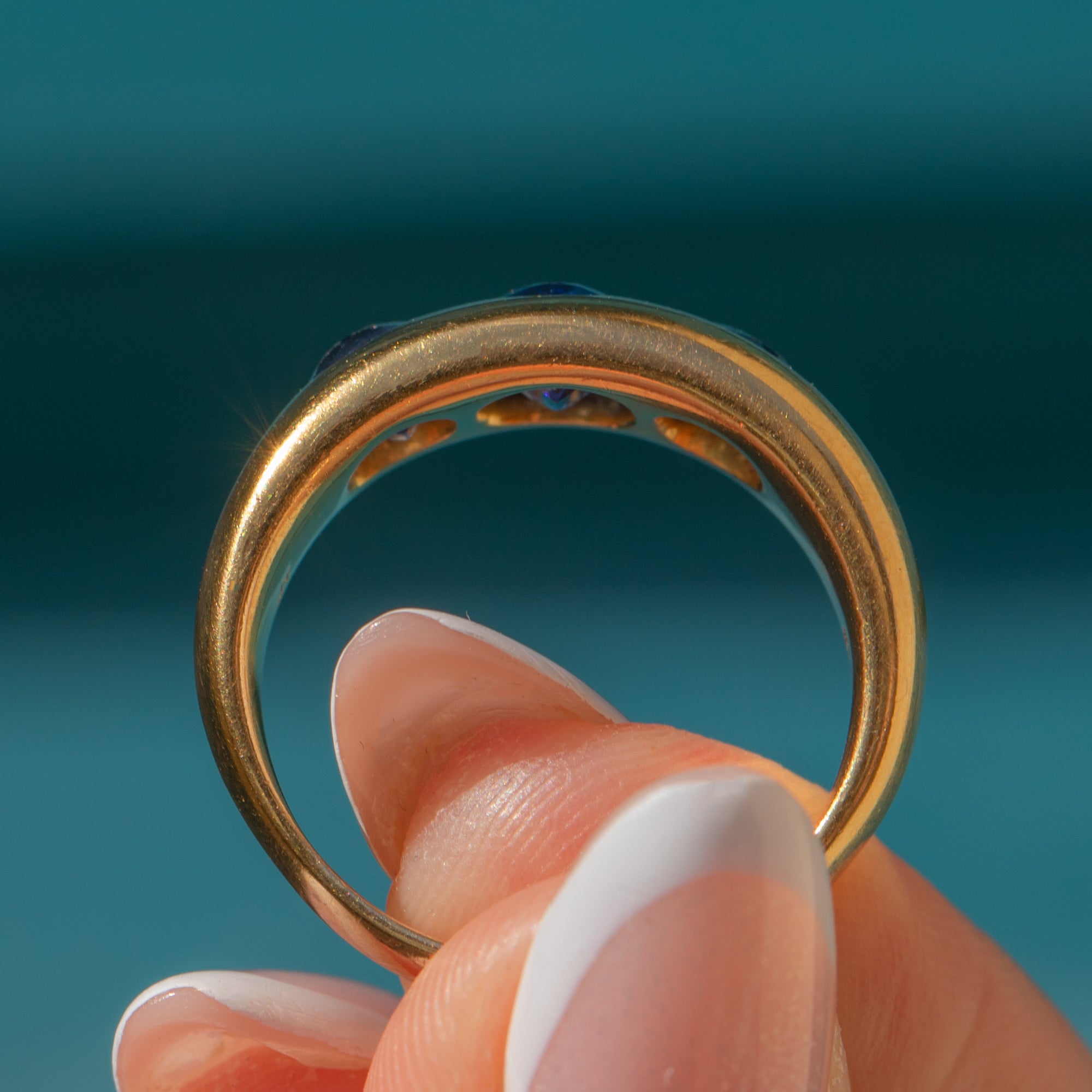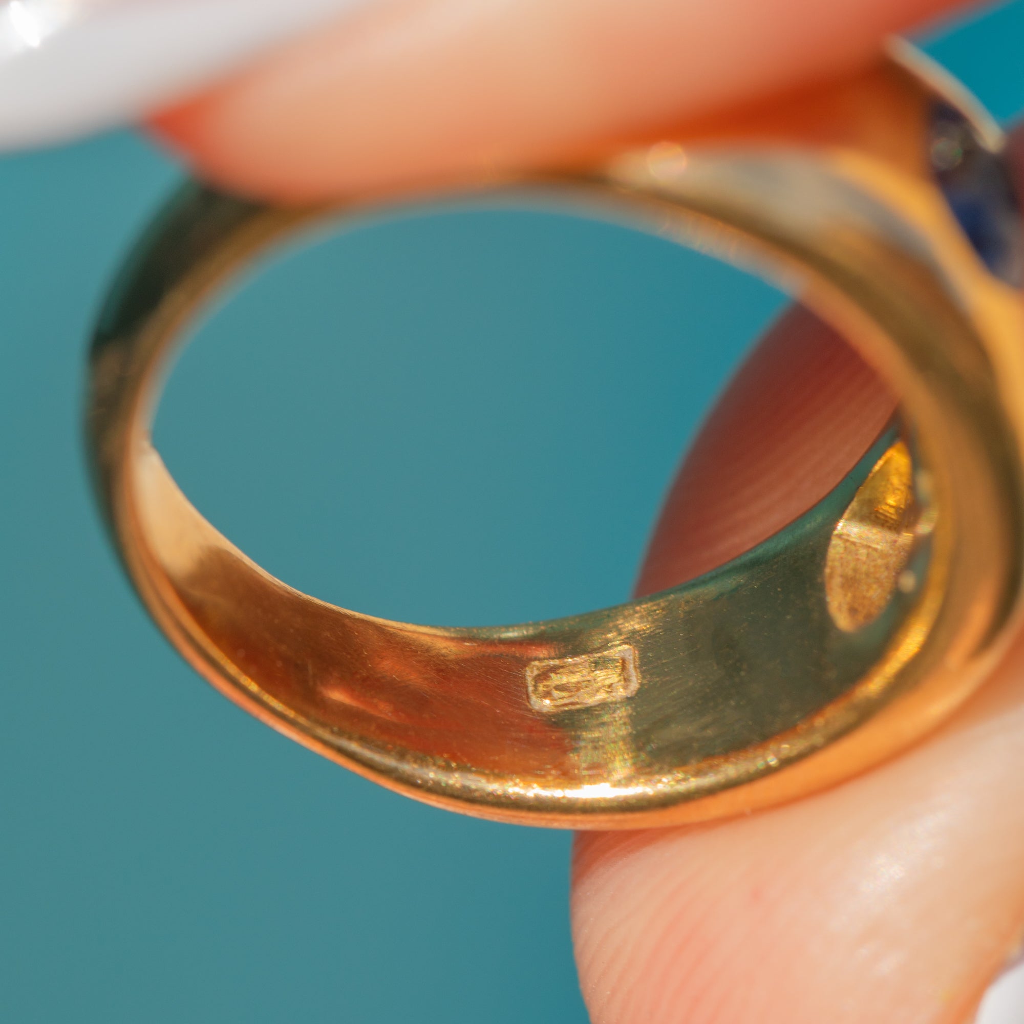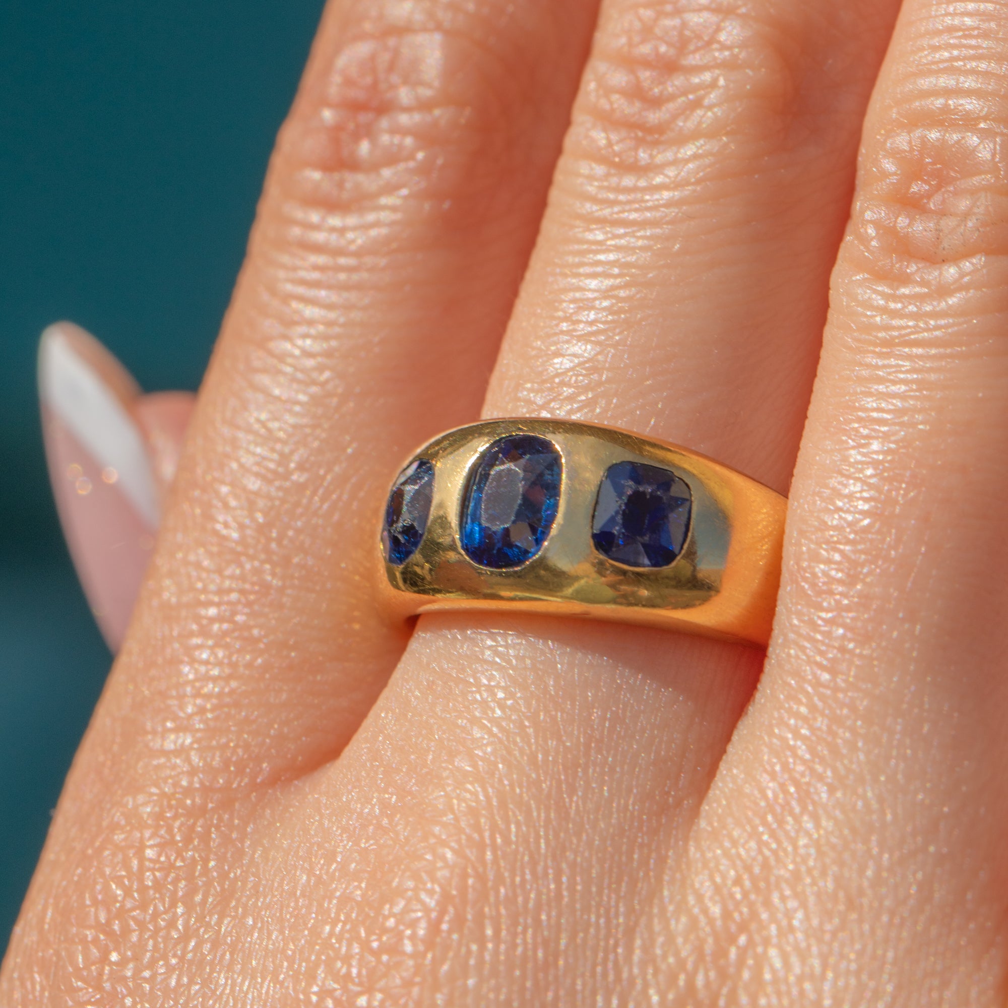 This chunky 18ct Gold flush-set Natural Sapphire gypsy ring is a striking piece! This Victorian-era gypsy ring is crafted from solid 18ct gold, boasting a bold, chunky design that epitomises the unique designs of the era. At her centre sits three stunning flush-set Natural Sapphires, their deep blue hues beautifully complementing the rich warmth of the Gold.