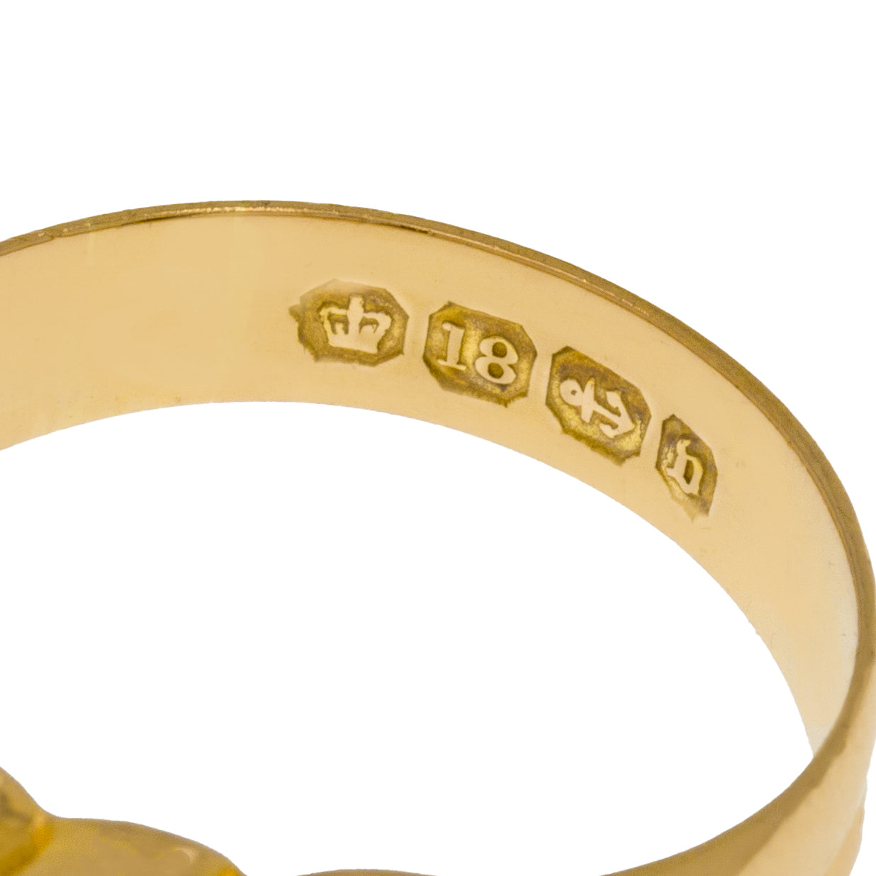 EXCELLENT. This chunky antique 18ct Gold keeper ring is in absolutely wonderful condition throughout! Her 18ct Gold is buttery and sleek to the touch, and her smooth band makes for comfortable wear. The knotted detailing looks superb, providing great finger coverage. With a full set of hallmarks allowing us to accurately date her to 1895, this Victorian Gold band is a wonderful investment piece!