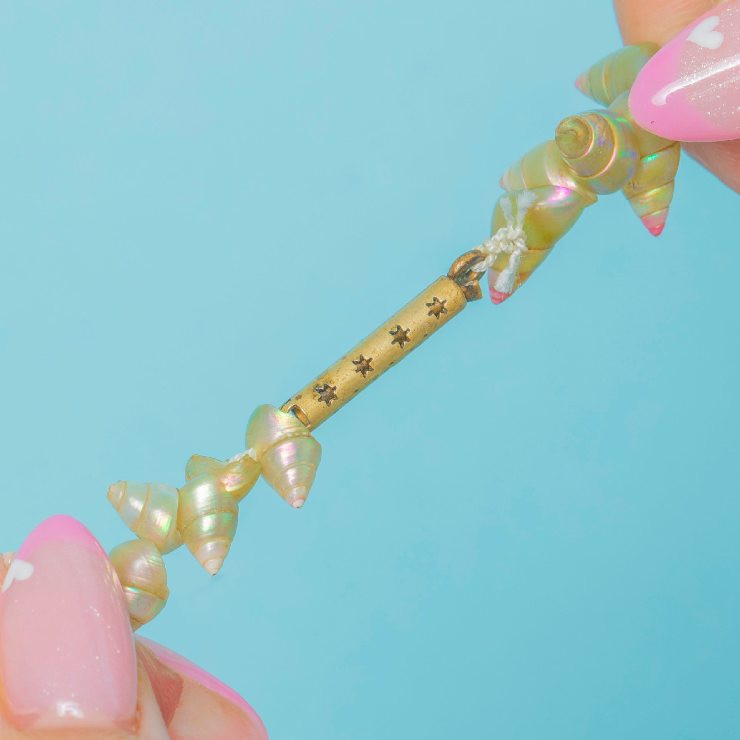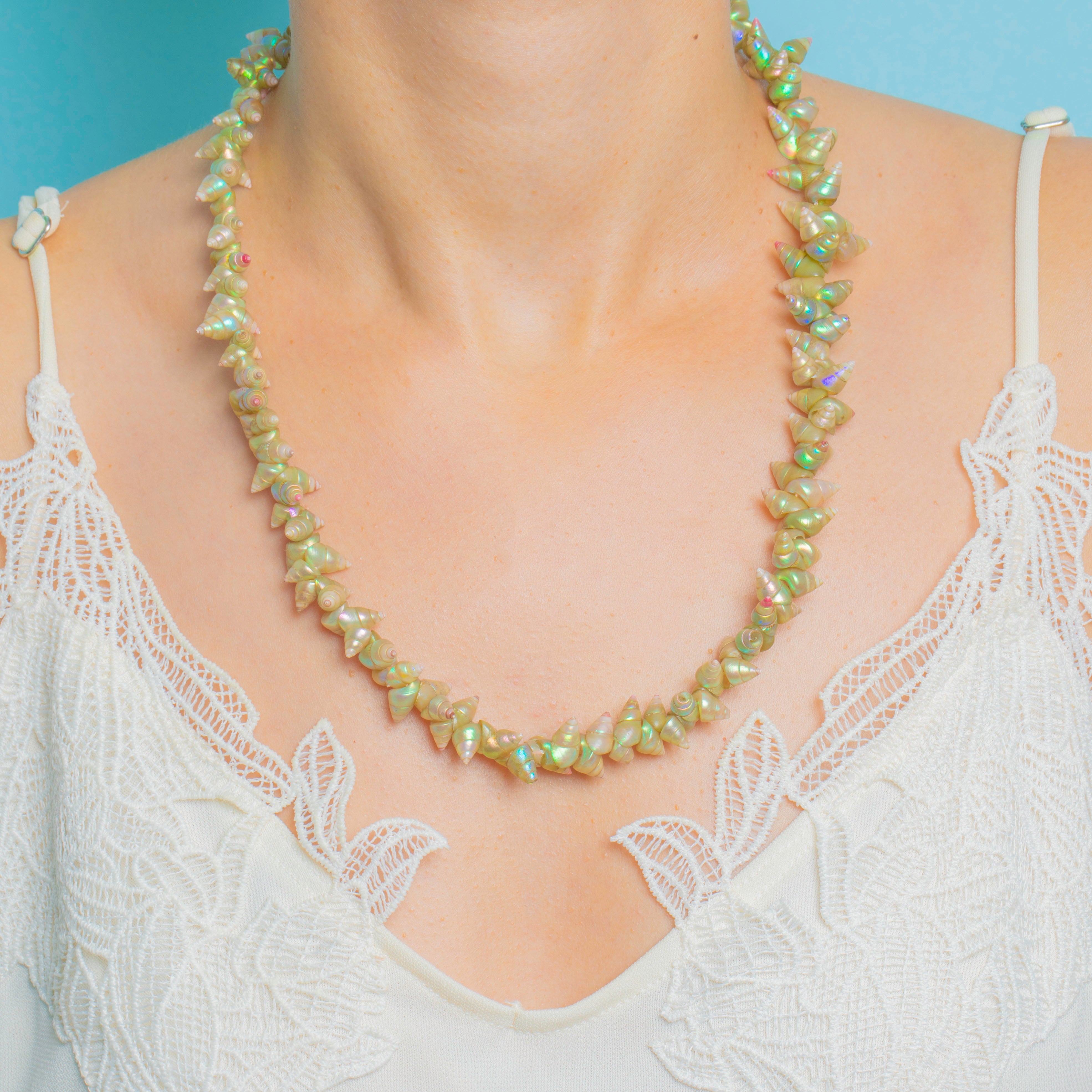 This striking Victorian necklace is strung with naturally iridescent Tasmanian Maireener shells, prized for their distinctive lustre and subtle colour variations. The shells graduate beautifully in size, forming an organic rhythm along the neckline and fastening with a charming pierced star barrel clasp typical of 19th-century craftsmanship.