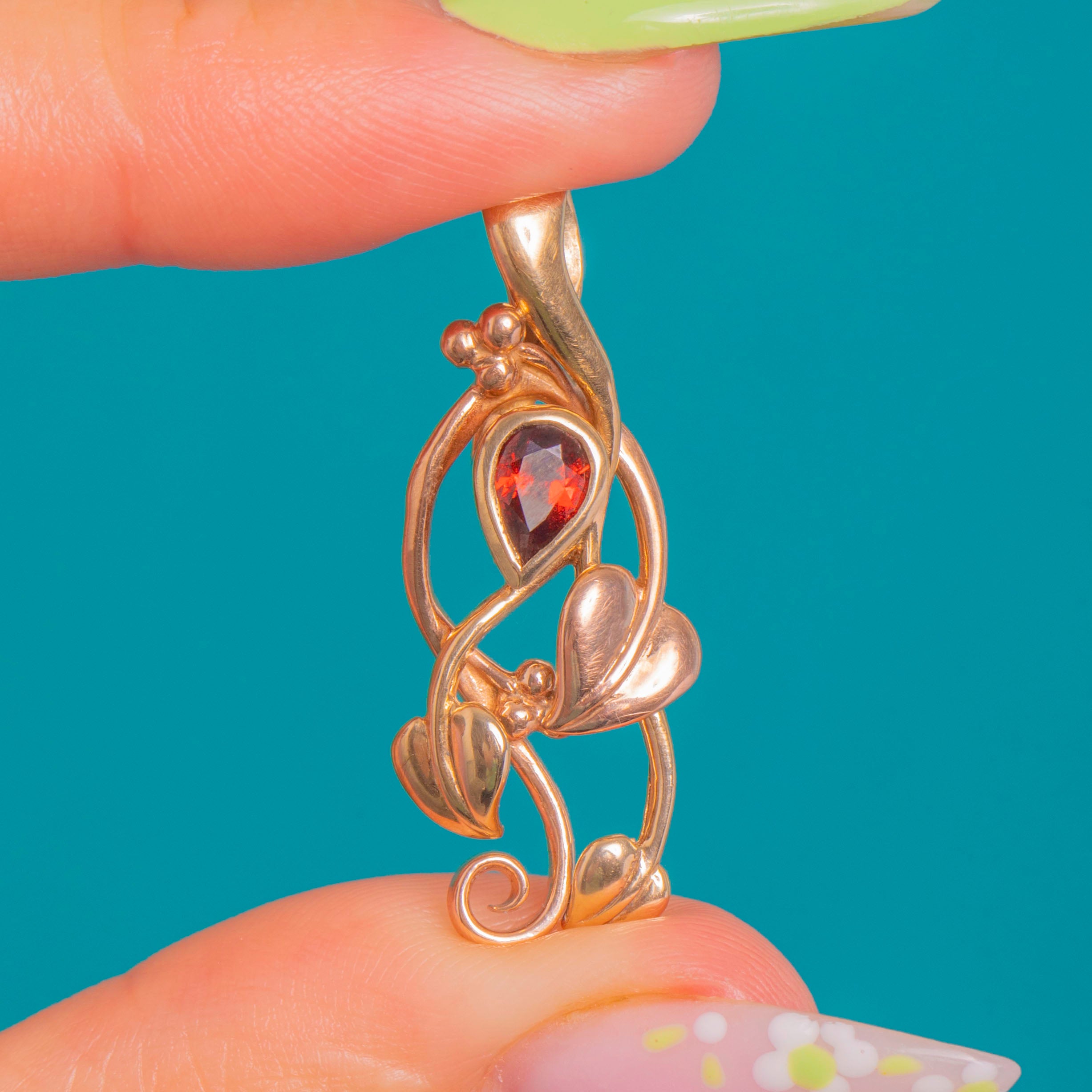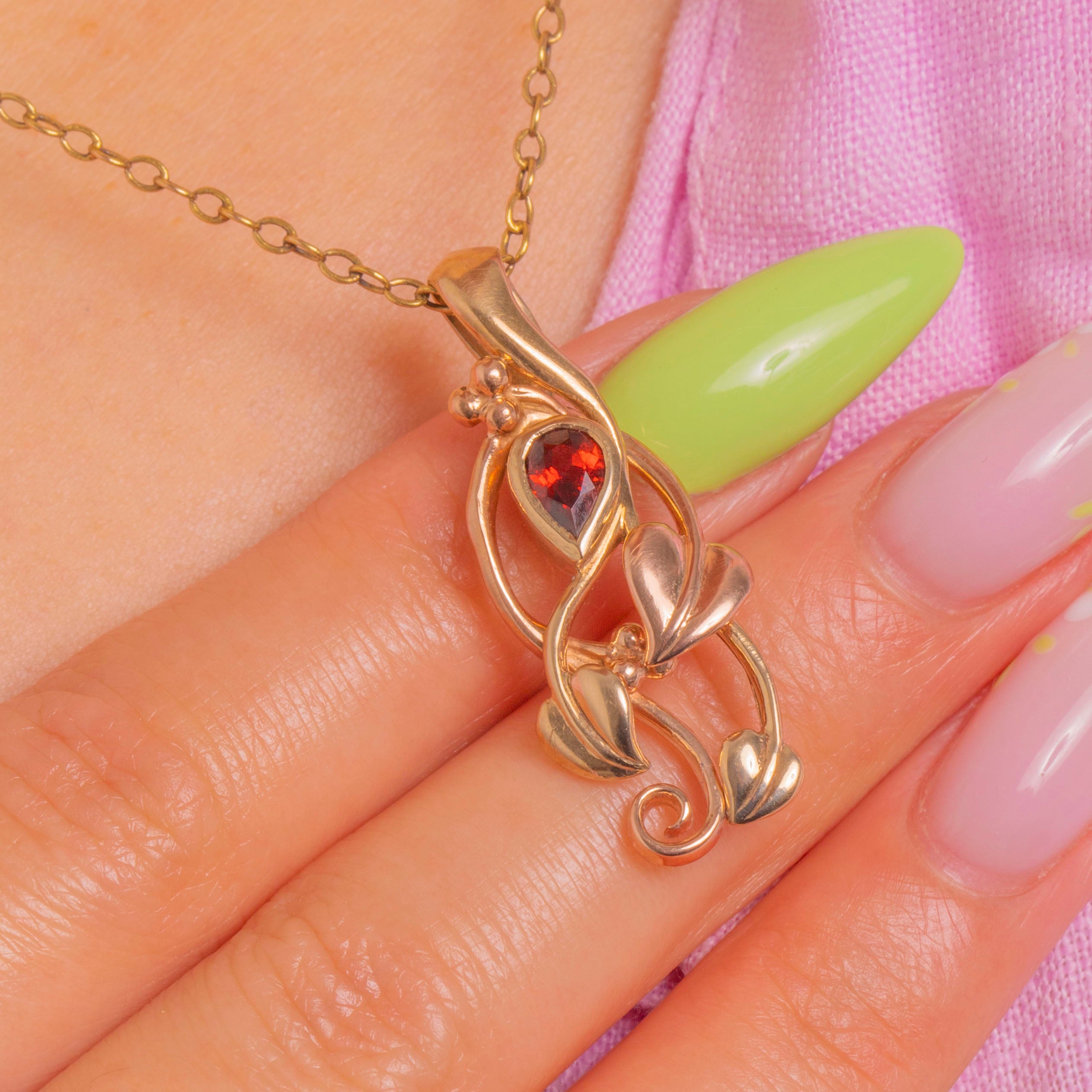 This Clogau ivy leaf pendant curls and twines in sculptural openwork, its leaves rendered in interwoven 9ct Gold for a subtle, romantic glow. Nestled near the top, a pear-cut Garnet brings a deep red warmth, bezel-set to mirror the pendant’s fluid whiplash curves.