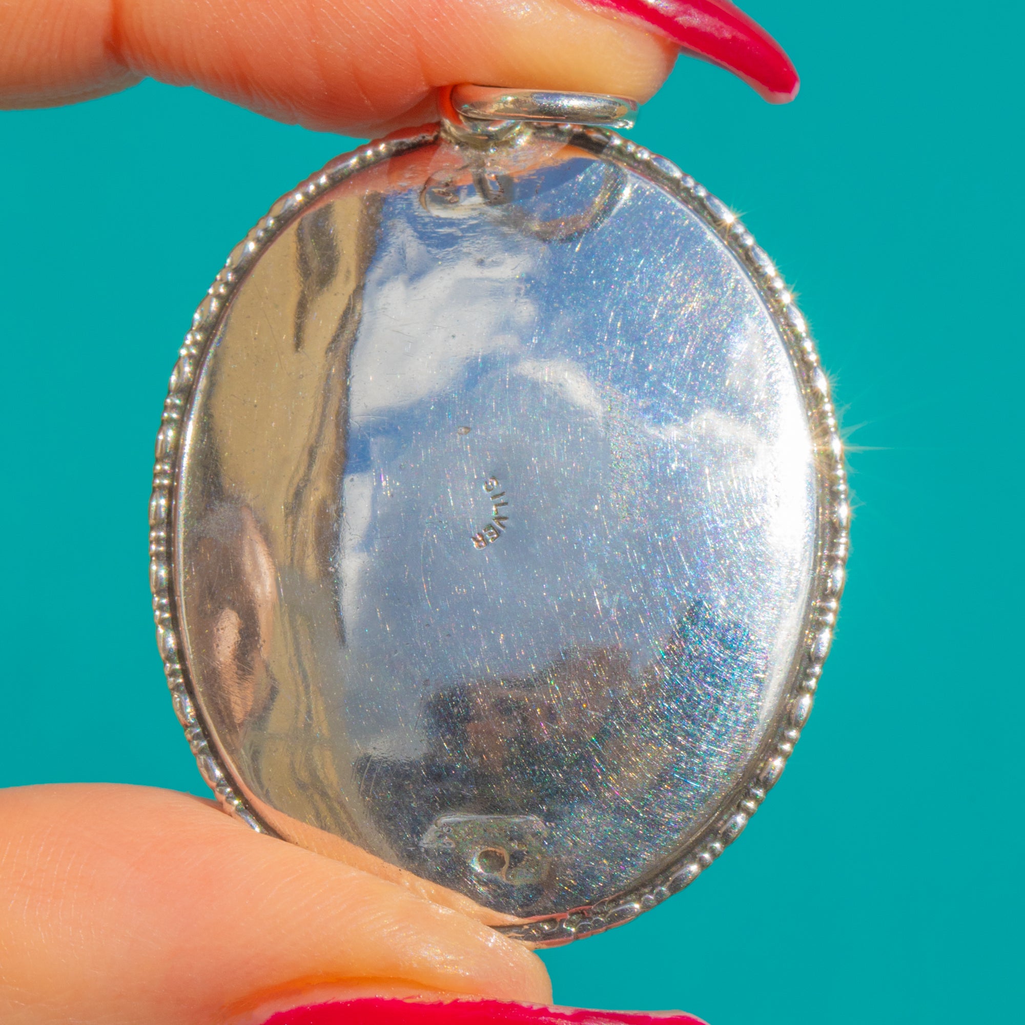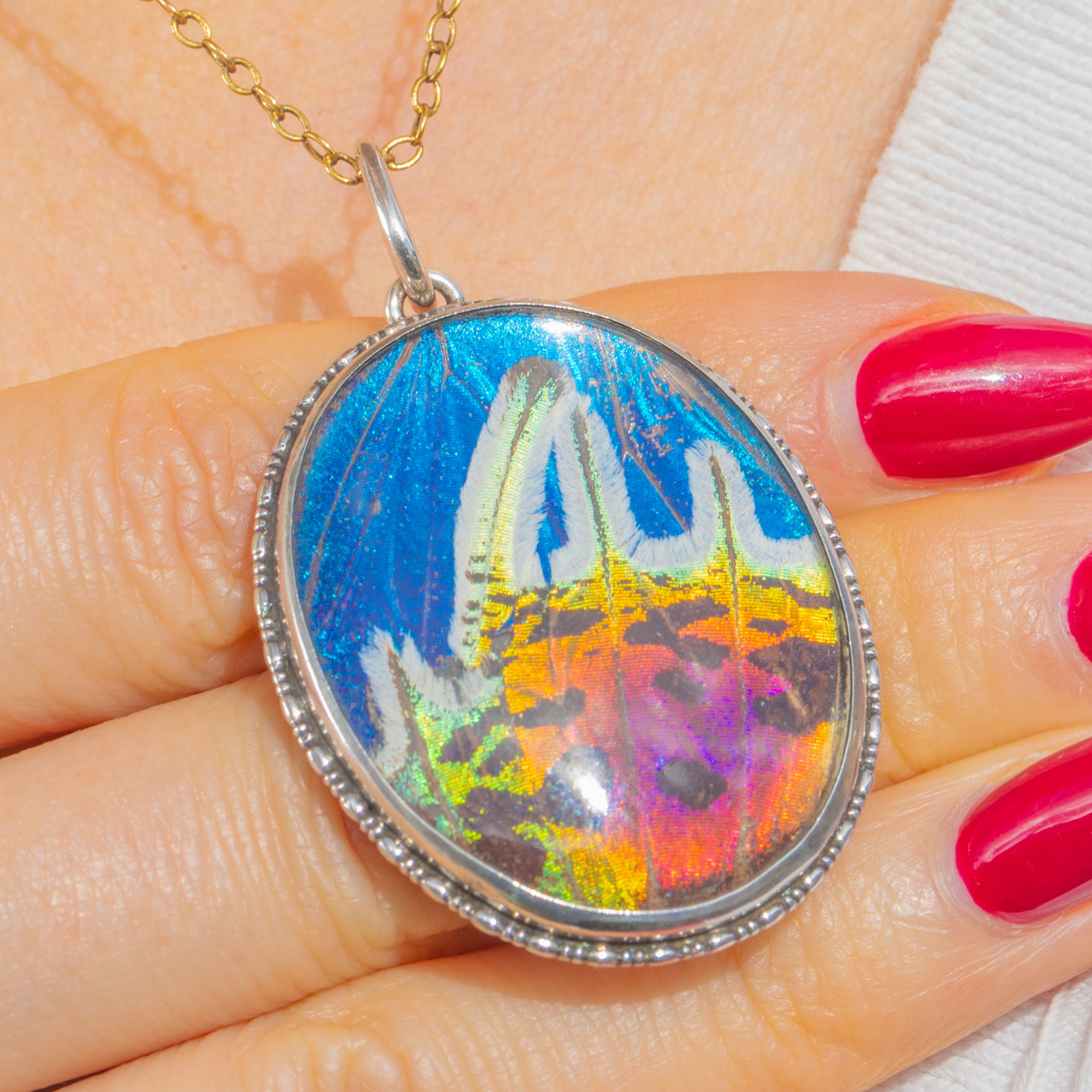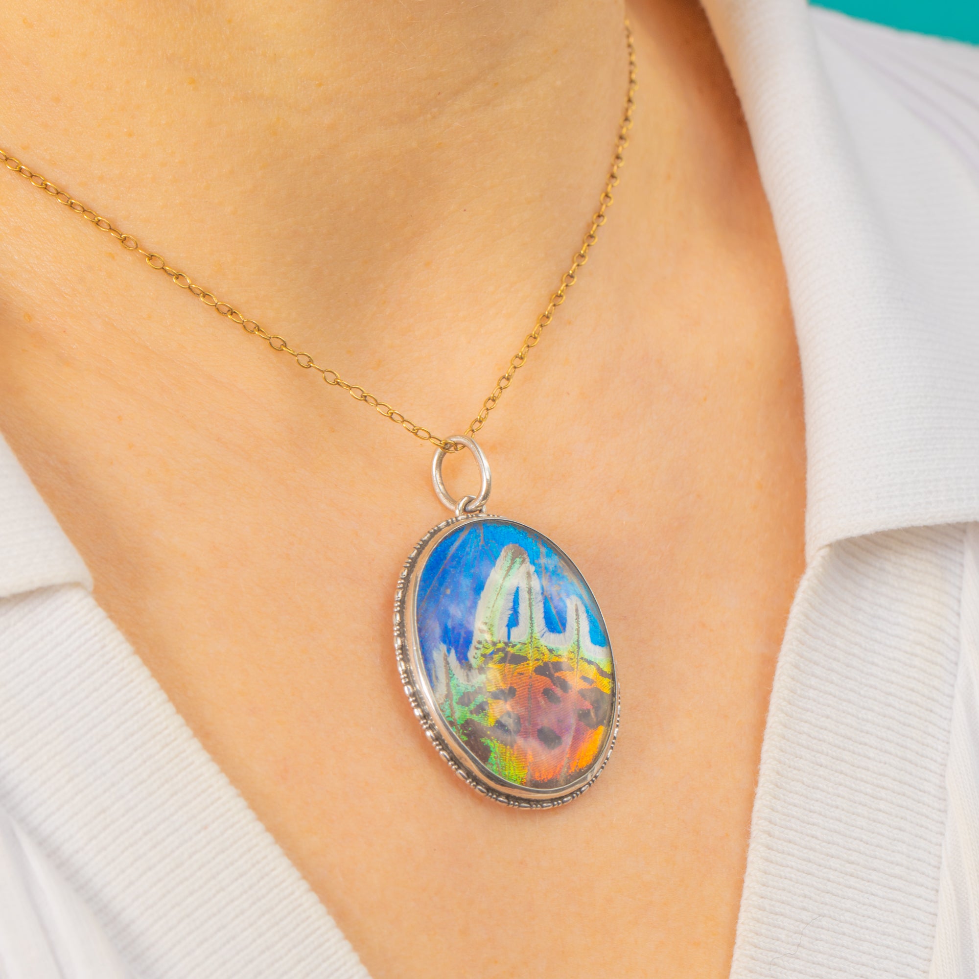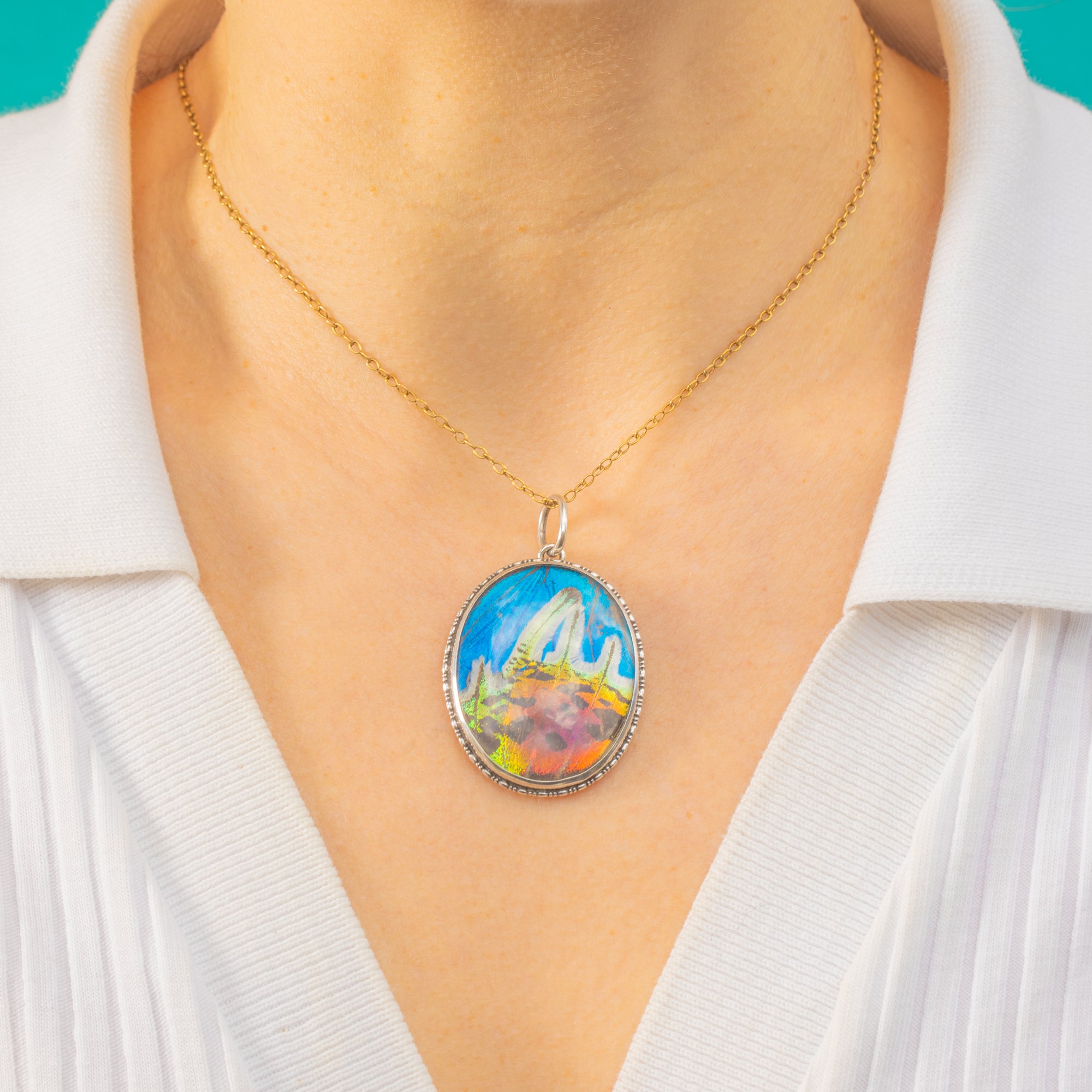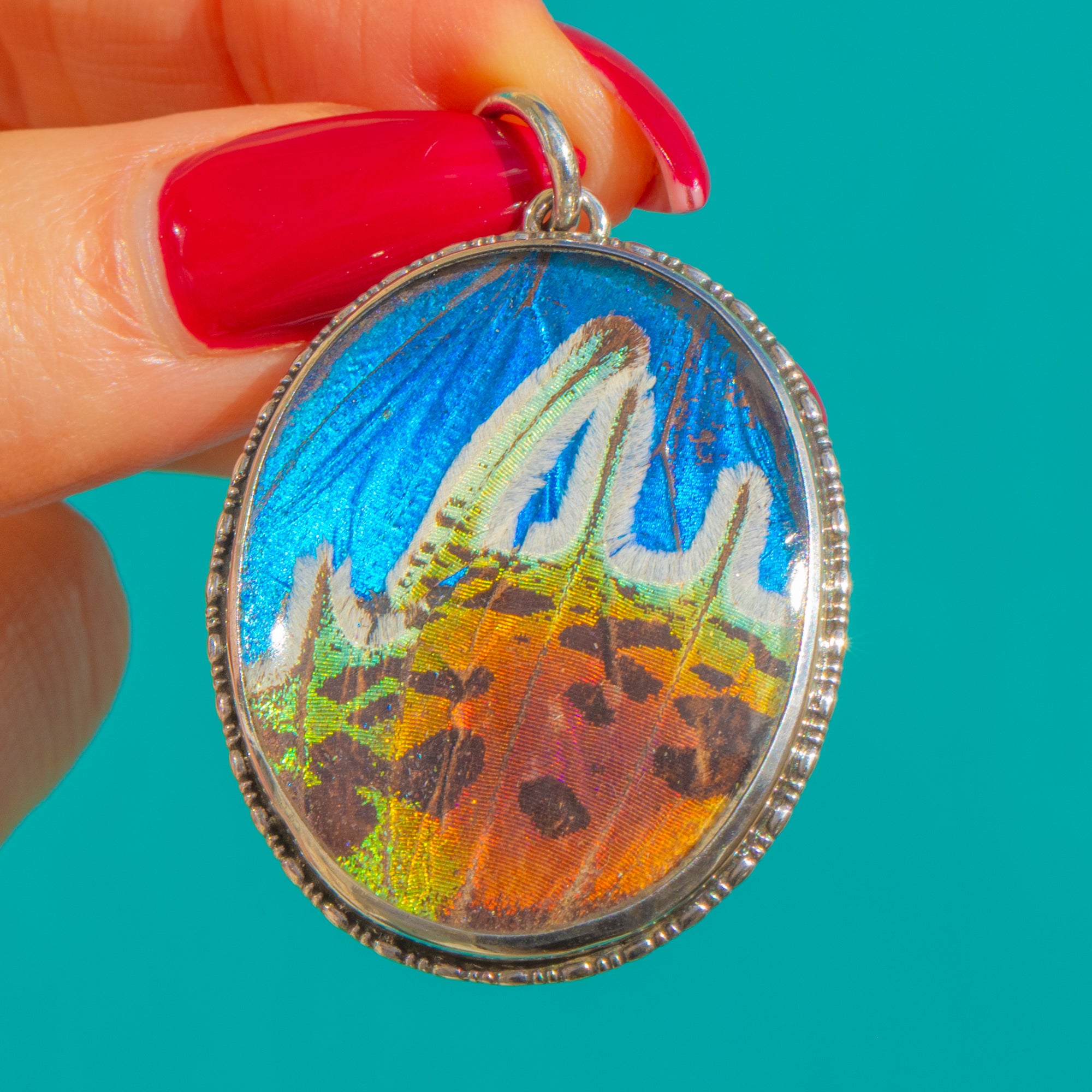 Alive with tropical blues, lagoon greens and iridescent pinks, this Art Deco Butterfly Wing pendant shimmers beautifully beneath a domed Glass cover. The oval silhouette is framed by a finely beaded Sterling Silver bezel, lending delicate texture and an elegant antique finish to the vivid natural display within.