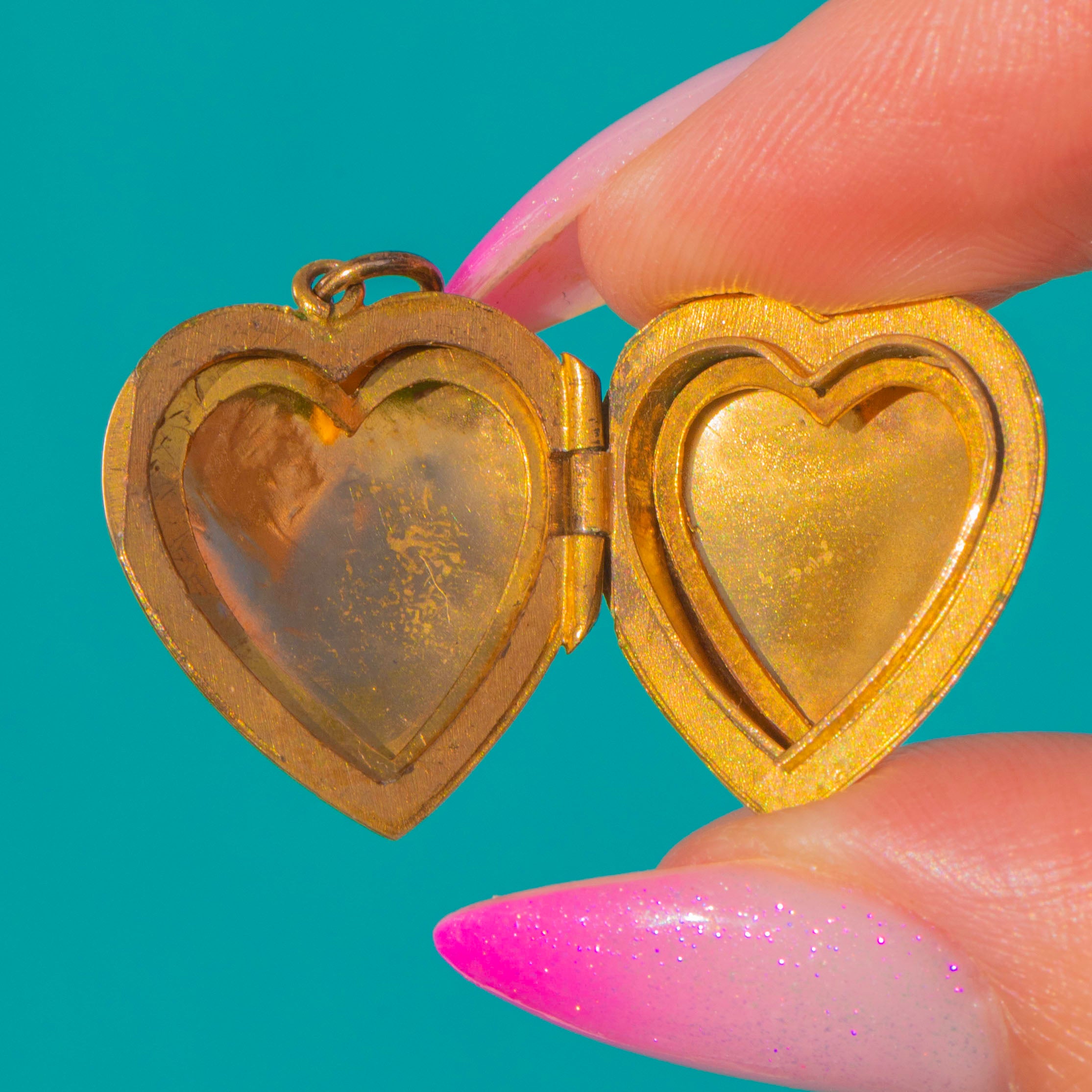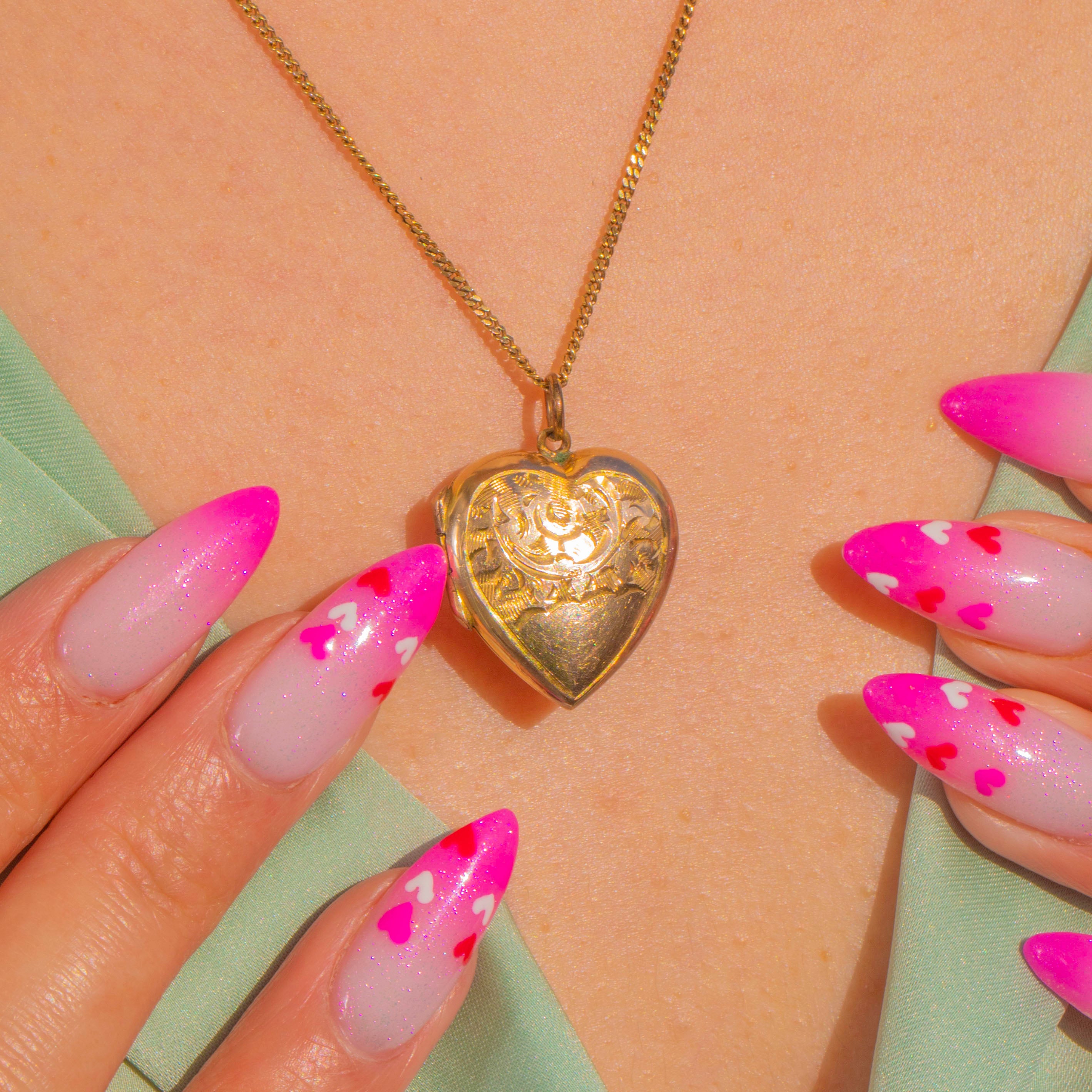 Inside are two heart-shaped compartments to hold treasured photos or keepsakes. The engravings remain crisp, and the piece wears beautifully with gentle age to the high points—timeless sentiment in a petite, elegant form.