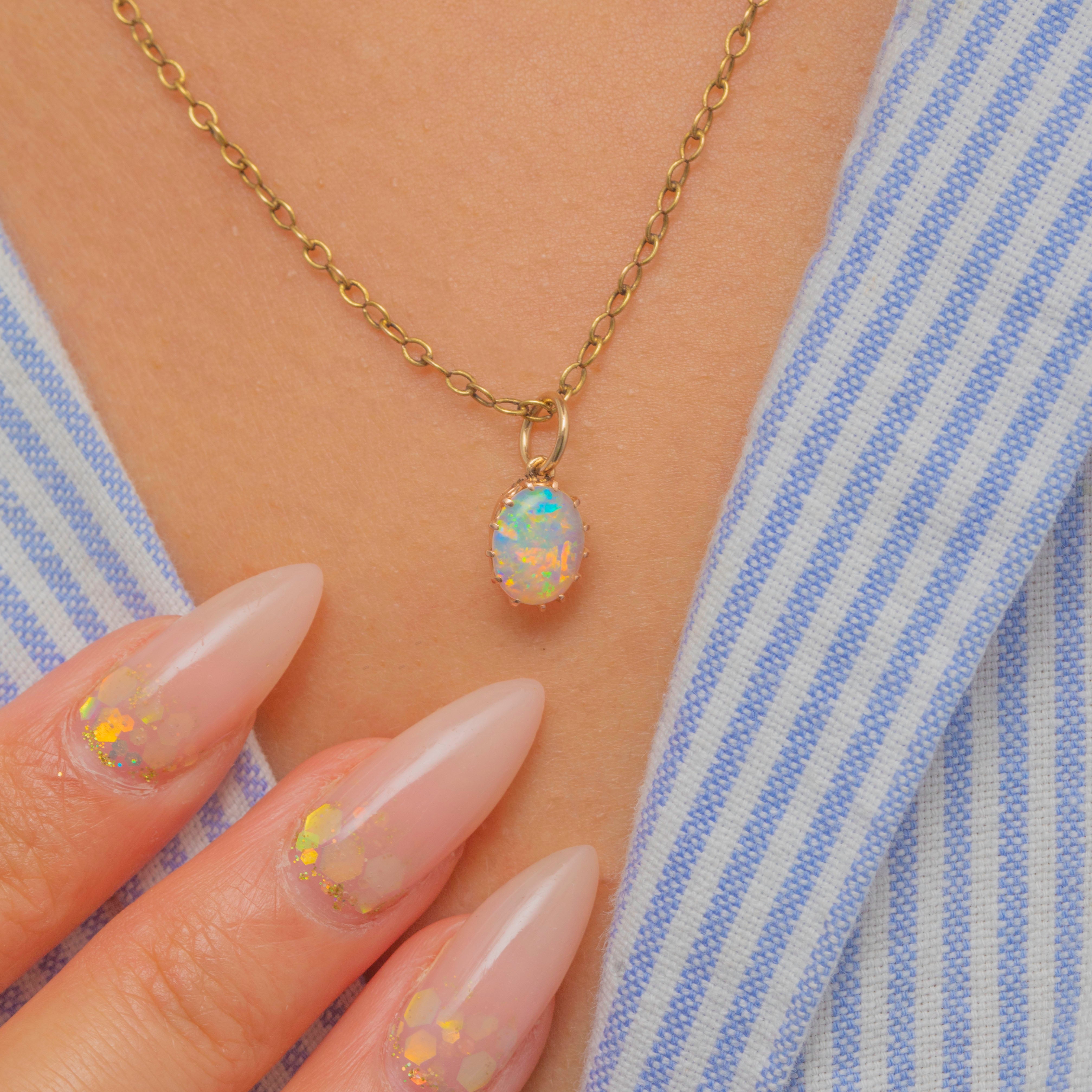 This dainty Victorian charm is crafted in 9ct Gold and set with a luminous Opal cabochon. The Opal glows with flashes of colour, delicately framed in classic claw settings that let the light dance across its surface.