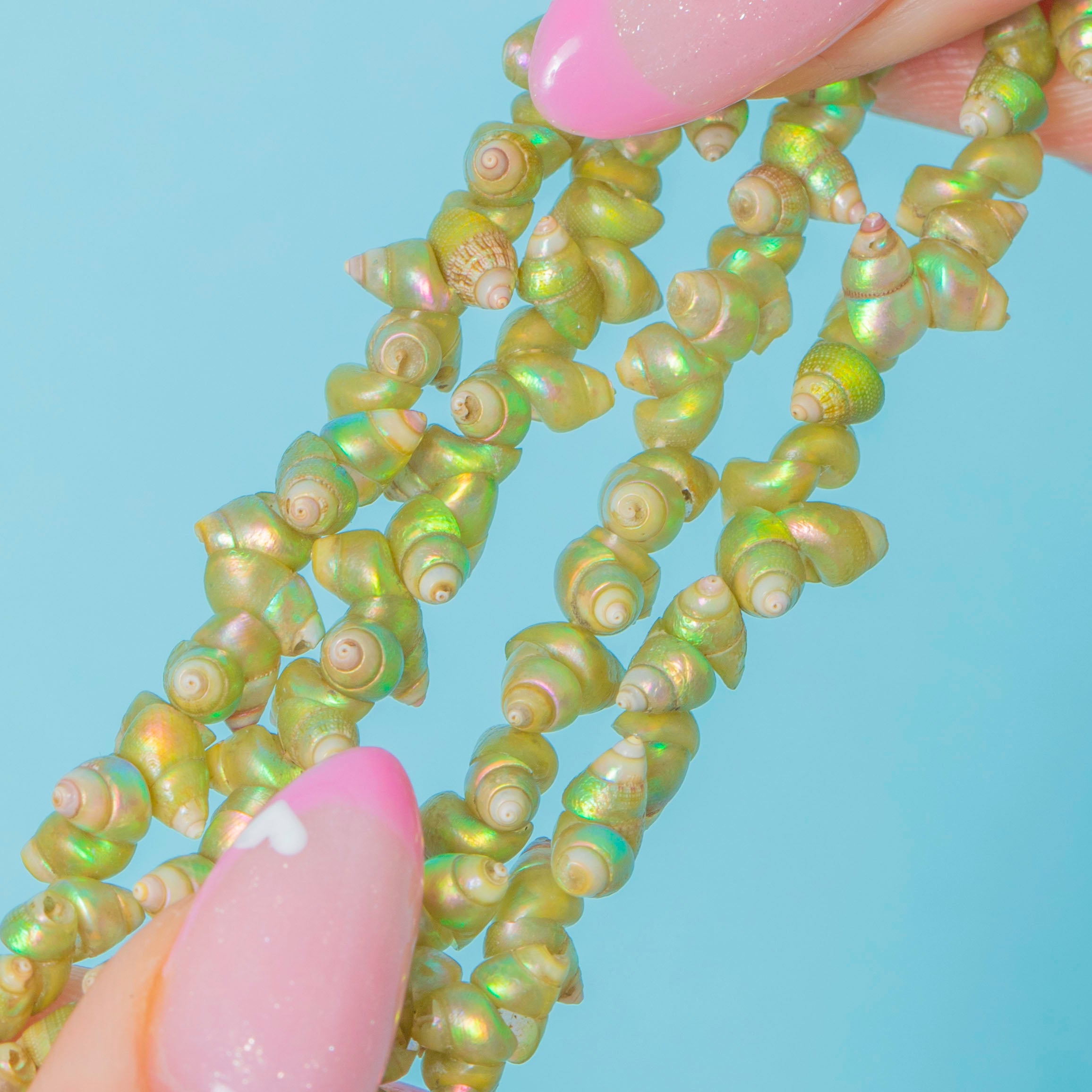 A delicate Victorian necklace strung with lustrous Tasmanian Maireener shells in soft iridescent green tones. Traditionally hand-crafted by Tasmanian Aboriginal makers, these shell necklaces are prized for their natural beauty and intricate workmanship.