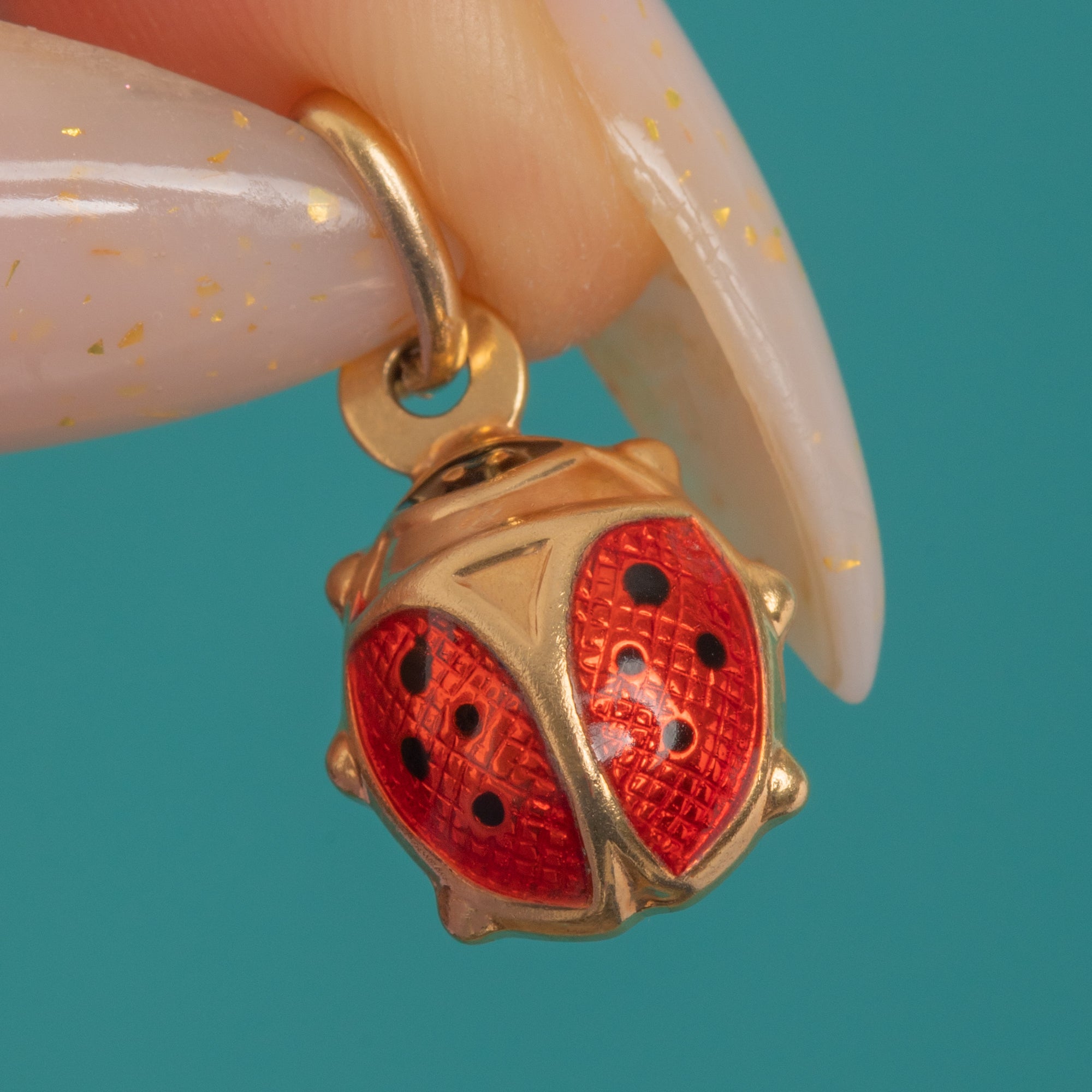 Sweet, petite and oh‑so chic, this Italian Vintage ladybird charm is crafted in 9ct Gold with vivid translucent red Enamel delicately dotted with glossy black spots. The three‑dimensional body is beautifully modelled, and the shimmering guilloché‑style texture beneath the Enamel gives the wings a luminous, jewel‑like glow.