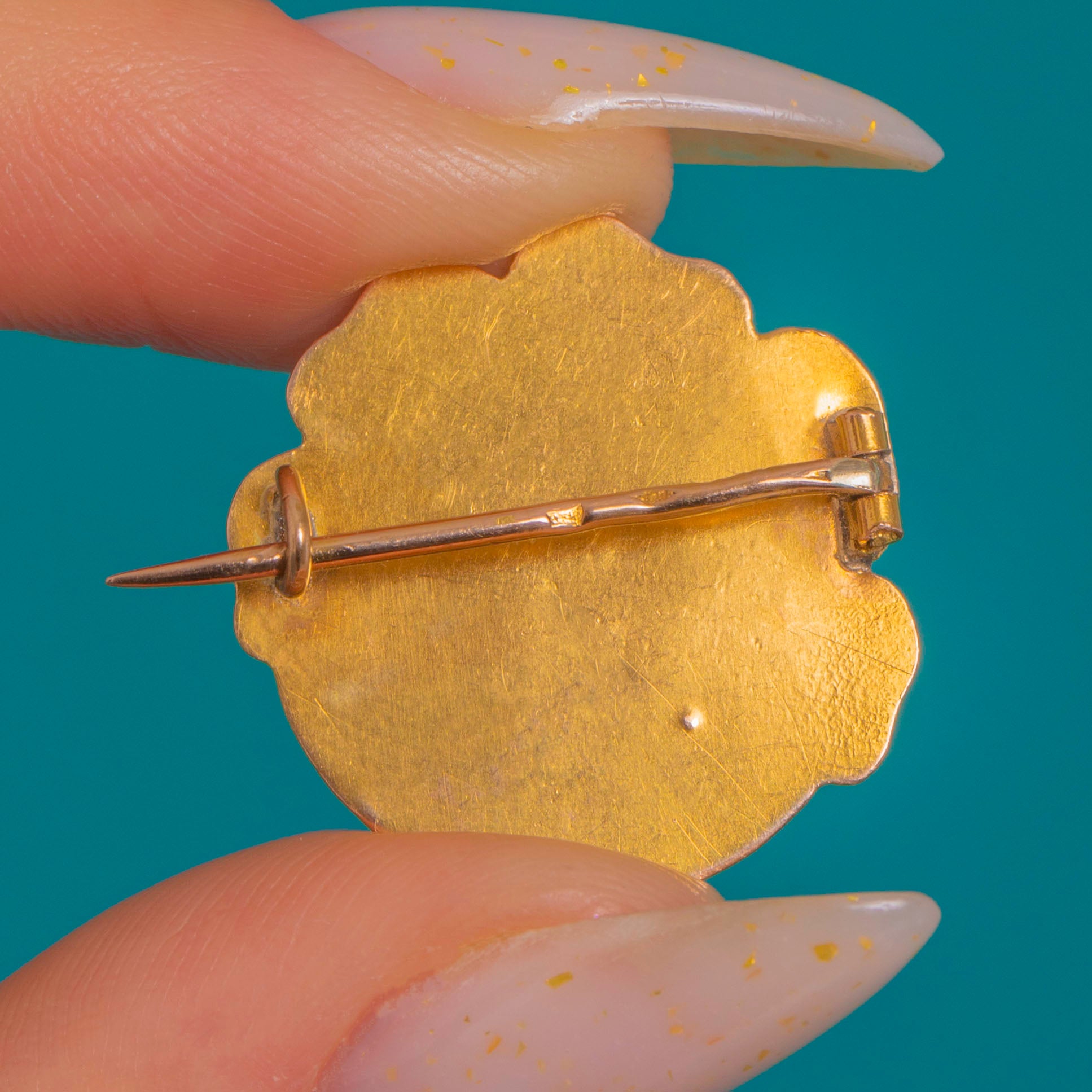 VERY GOOD: Diamonds are secure and bright with no obvious chips to the naked eye. The Gold plaque shows light surface scratches and tiny pits consistent with age, while the relief remains crisp and well-defined. Fittings (tubular hinge, C-catch and overlong pin) are intact and function well.