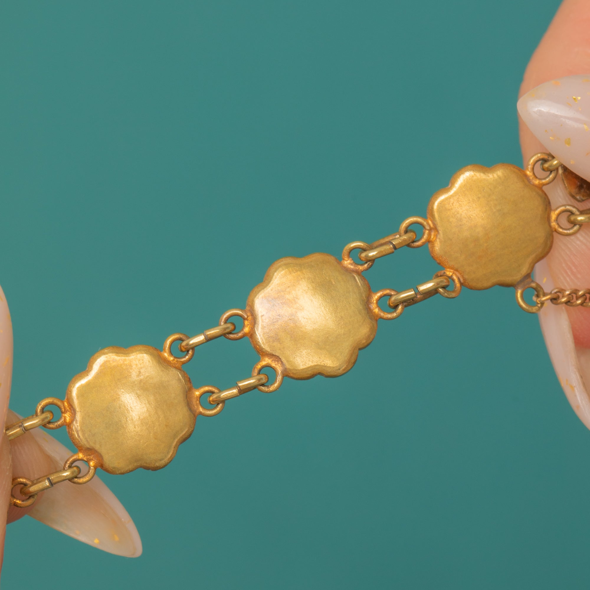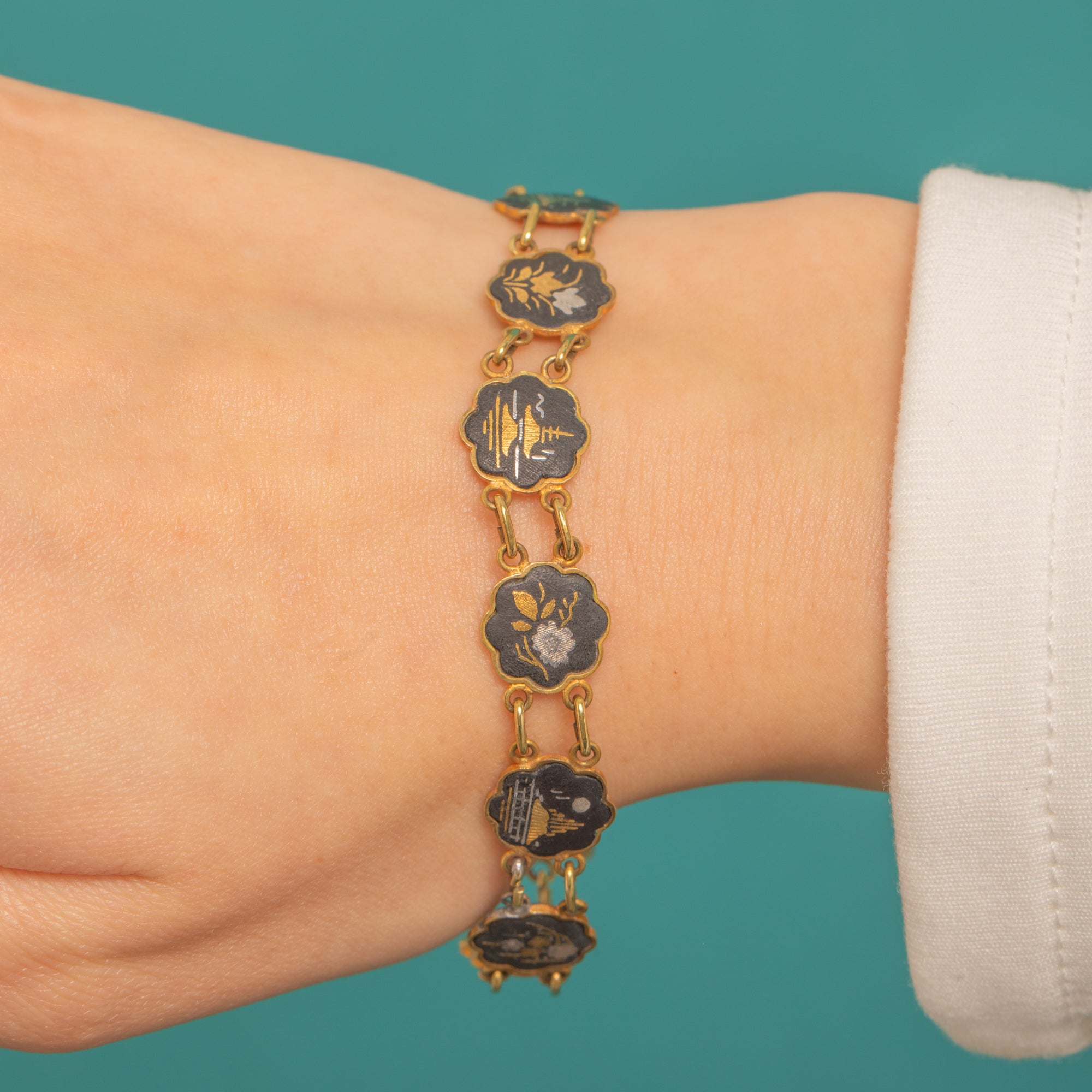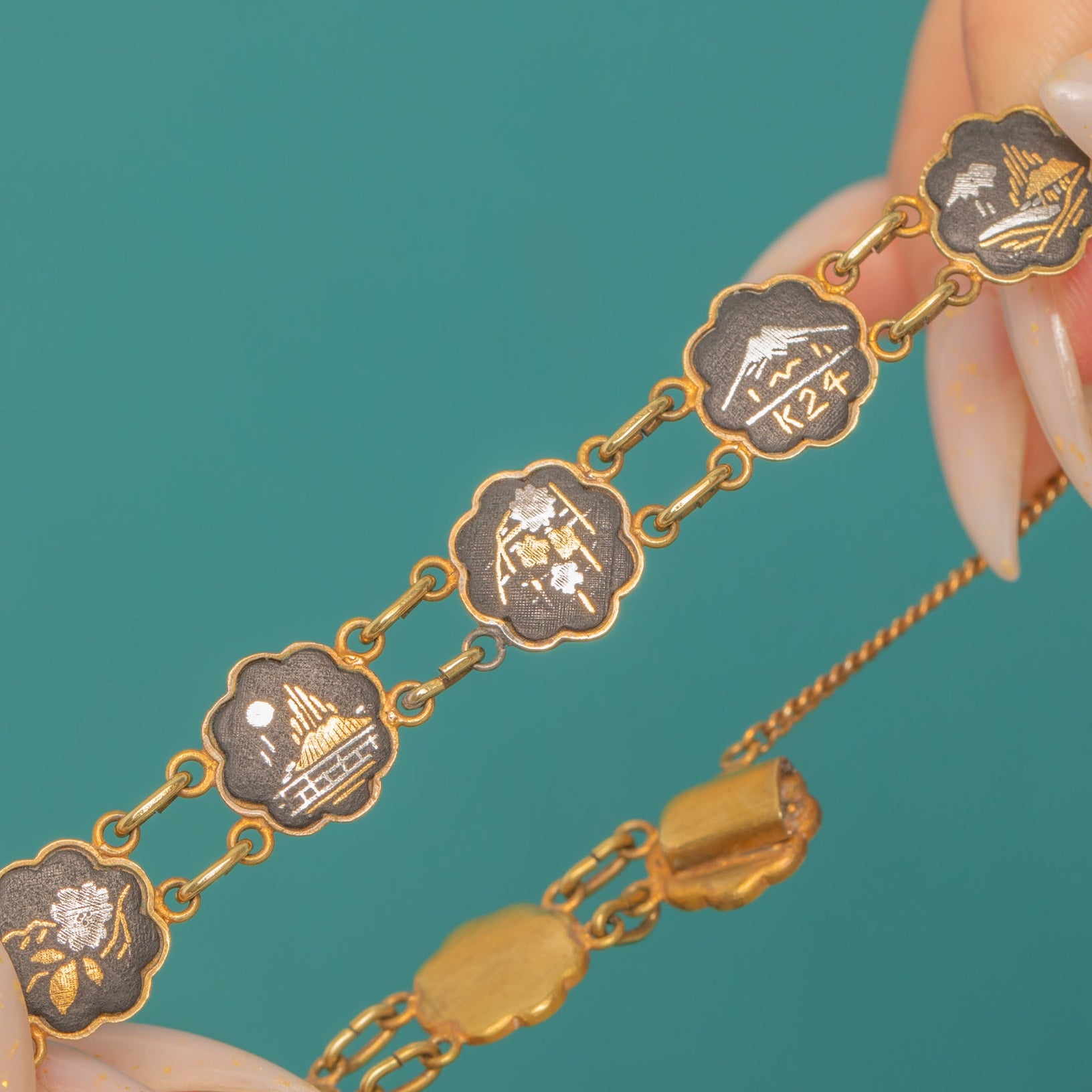 A refined Art Deco Shakudo bracelet, composed of delicately scalloped round plaques linked for fluid movement. Each plaque displays fine gold- and silver-toned inlay against a rich dark patina, depicting flowers, butterflies and serene Japanese landscapes with beautiful clarity. Finished with a neat box clasp and safety chain for peace of mind.
