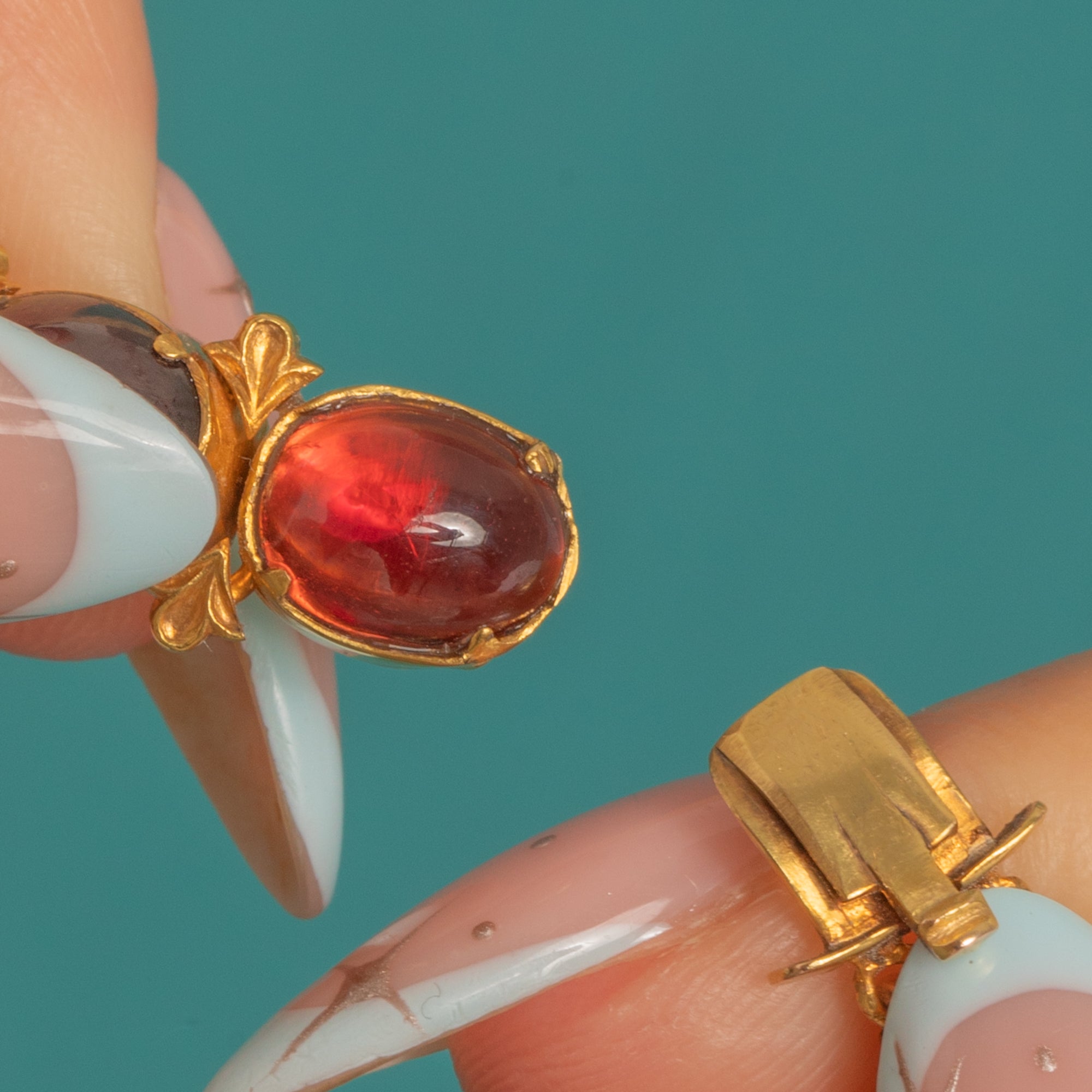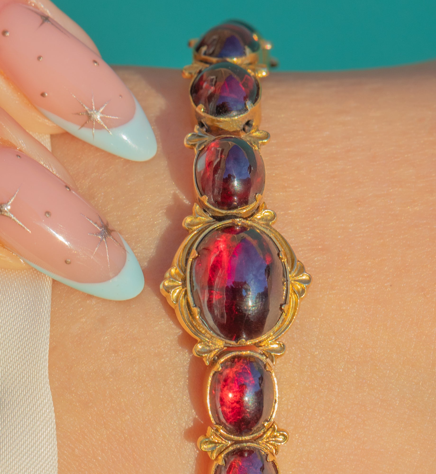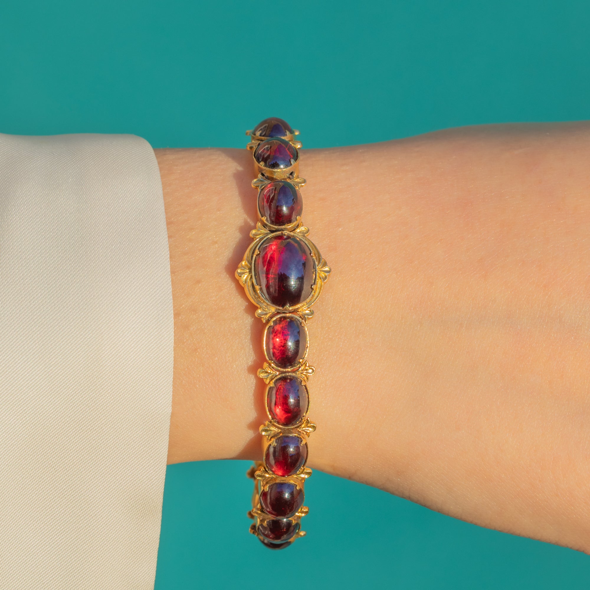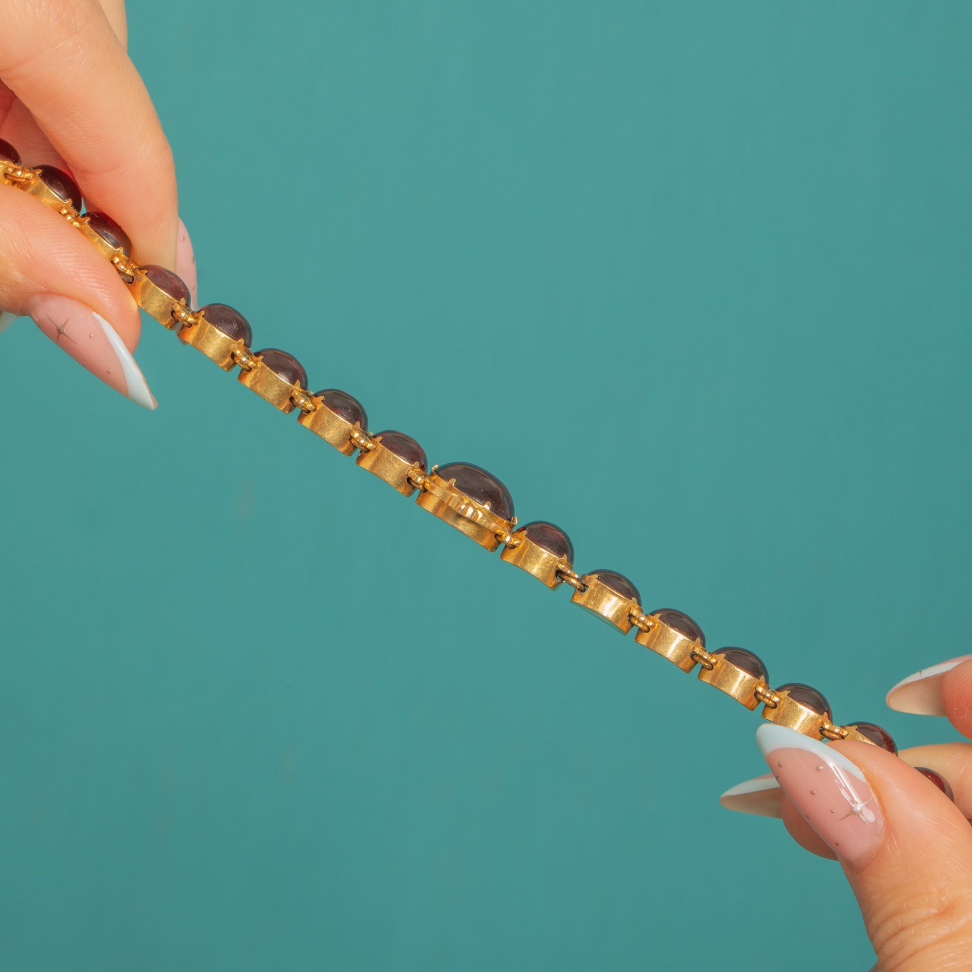 Each Garnet showcases its deep wine-red hue, the links articulated for an elegant, fluid drape. A neat push-in box clasp completes the design, true to the period and wonderfully wearable today—an antique treasure with timeless allure.