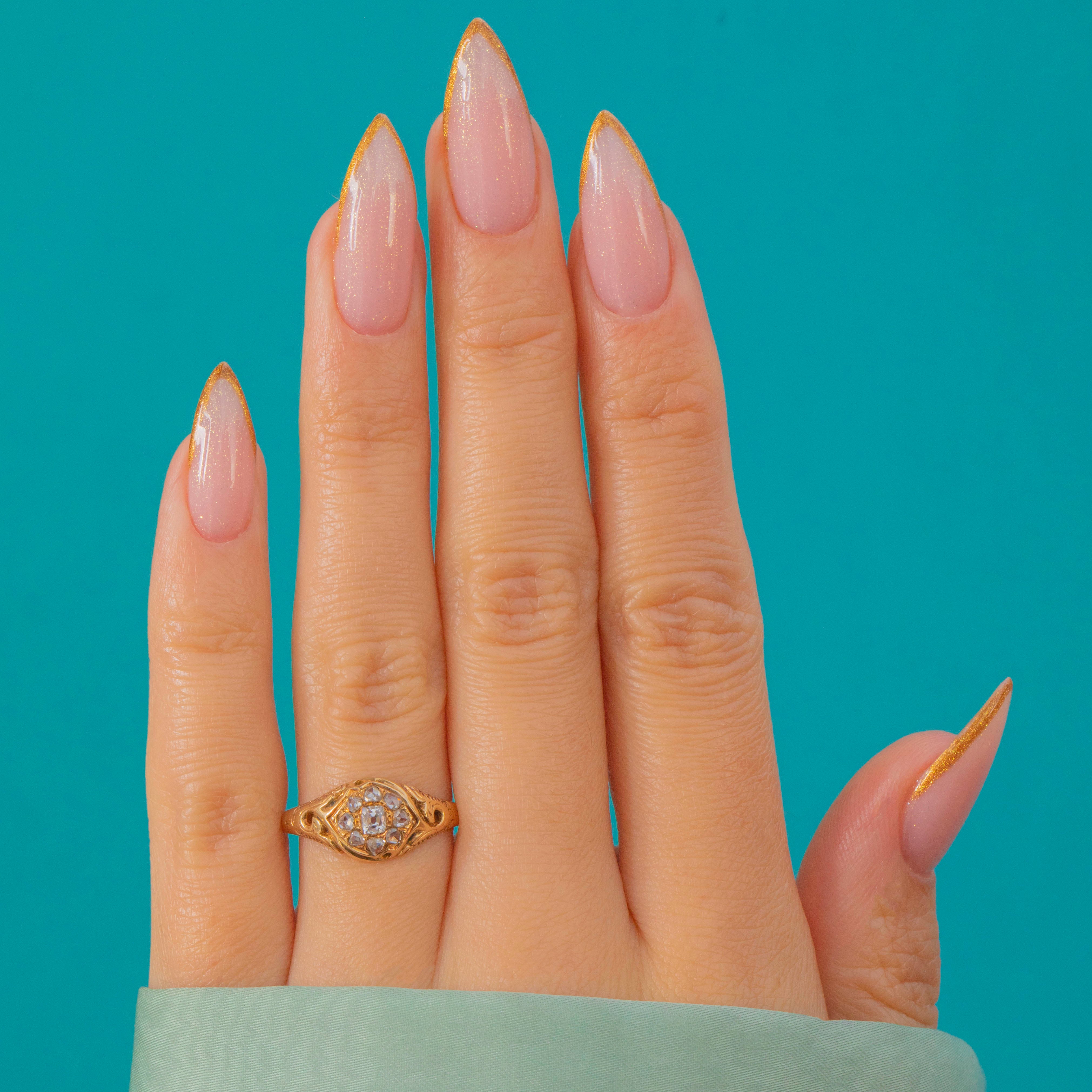 This exquisite 18ct Gold early Victorian cluster ring sparkles with a central old mine-cut Diamond surrounded by delicate rose-cut accents, all set in a beautifully detailed 18ct Gold mount. The openwork shoulders and engraved scrolls are quintessential of the 1850s, full of charm and craftsmanship from the early days of the Diamond engagement ring tradition.