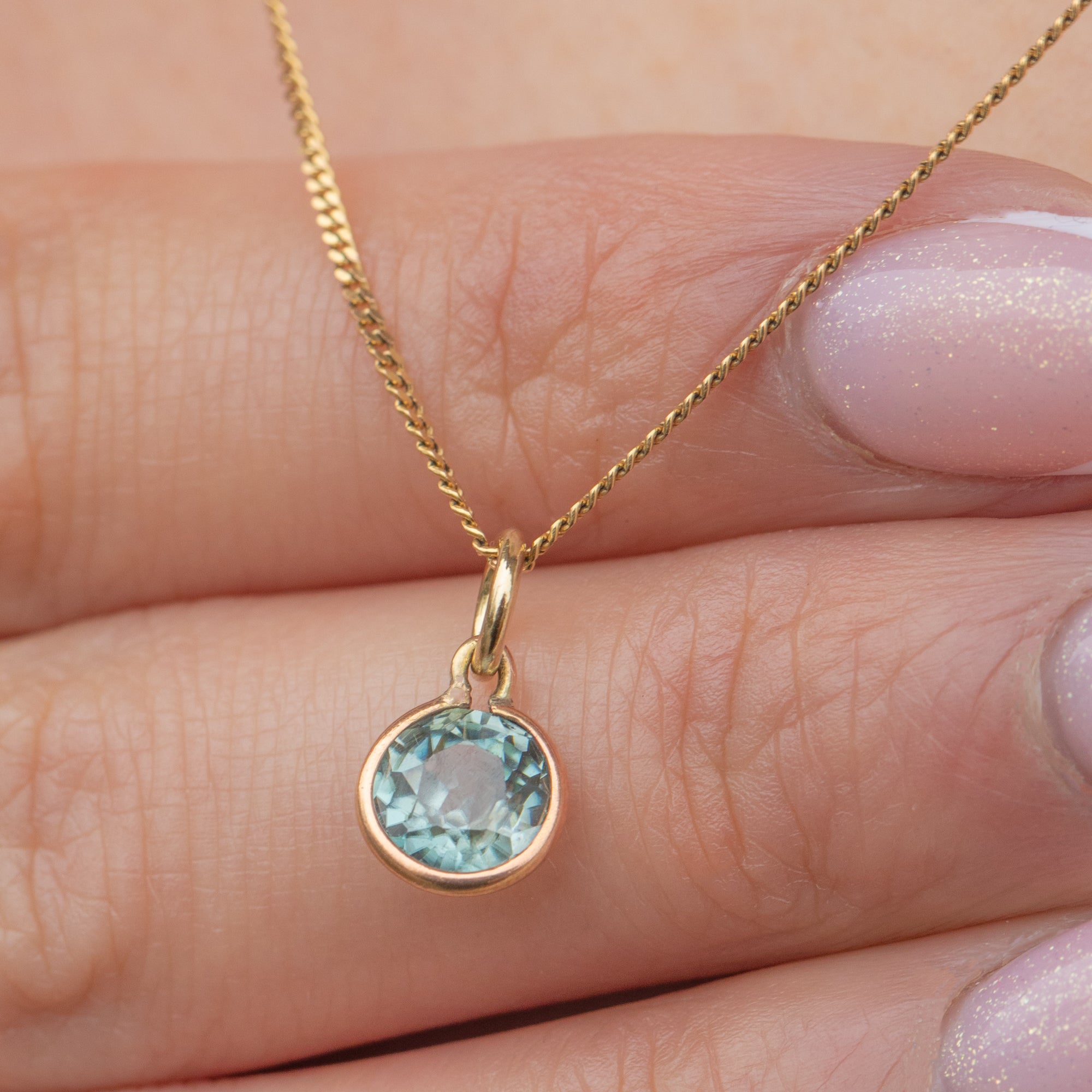 VERY GOOD: This Edwardian 14ct Gold Blue Zircon charm is in very good condition. The Zircon is resplended with its pale blue hue, with only some minor fleabites visible under close inspection. The Zircon is held securely within its bezel setting and the Gold is buttery and smooth. With a generously sized jump ring, you can effortlessly style this Edwardian Zircon pendant!