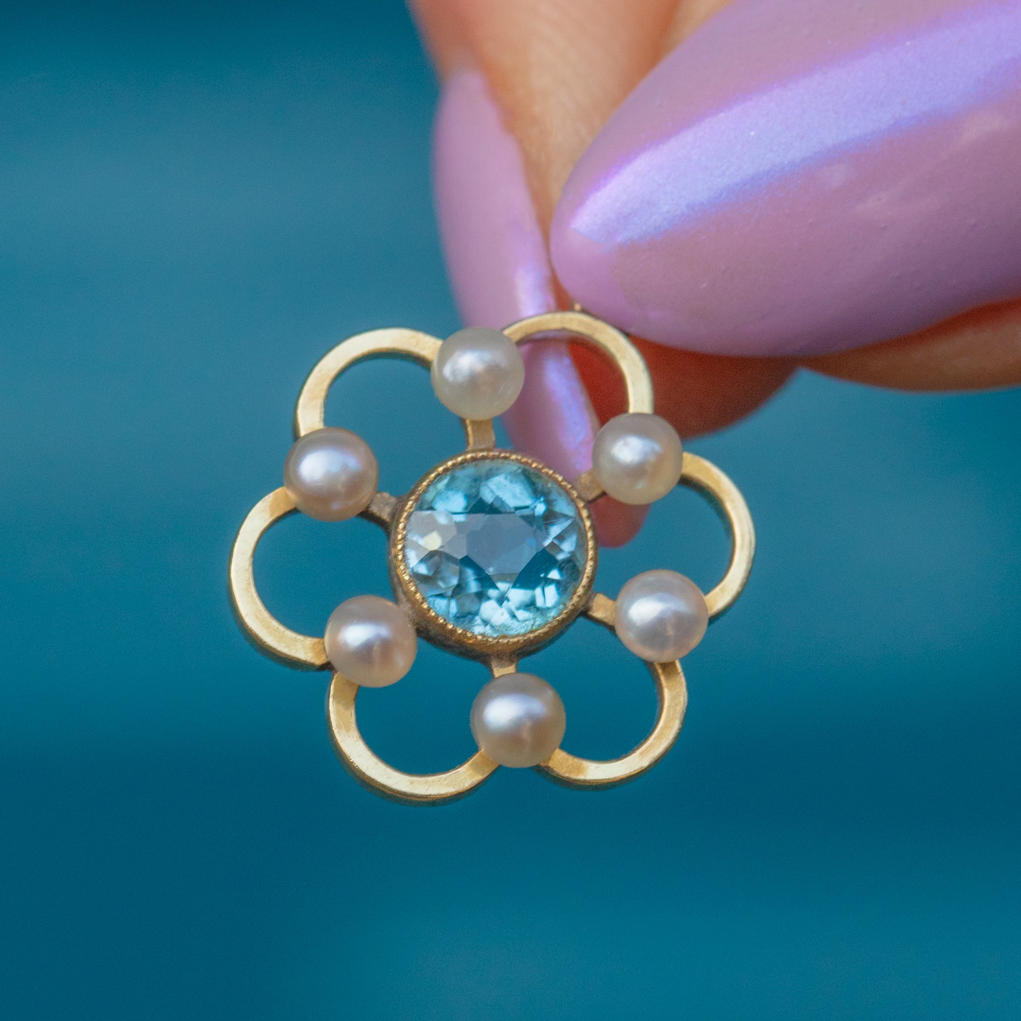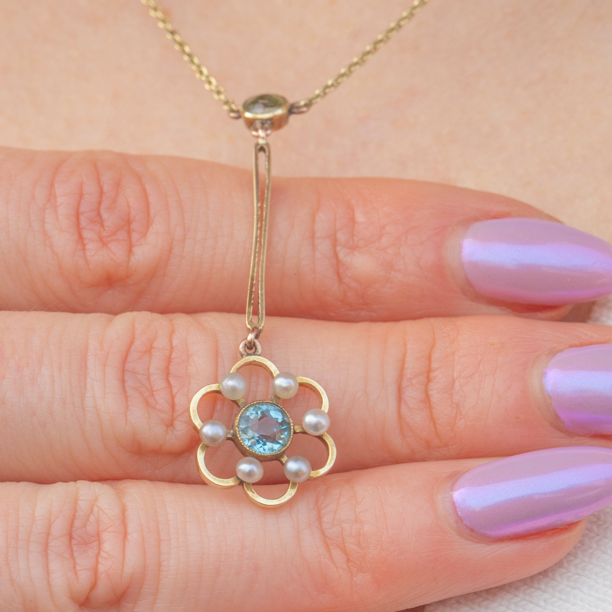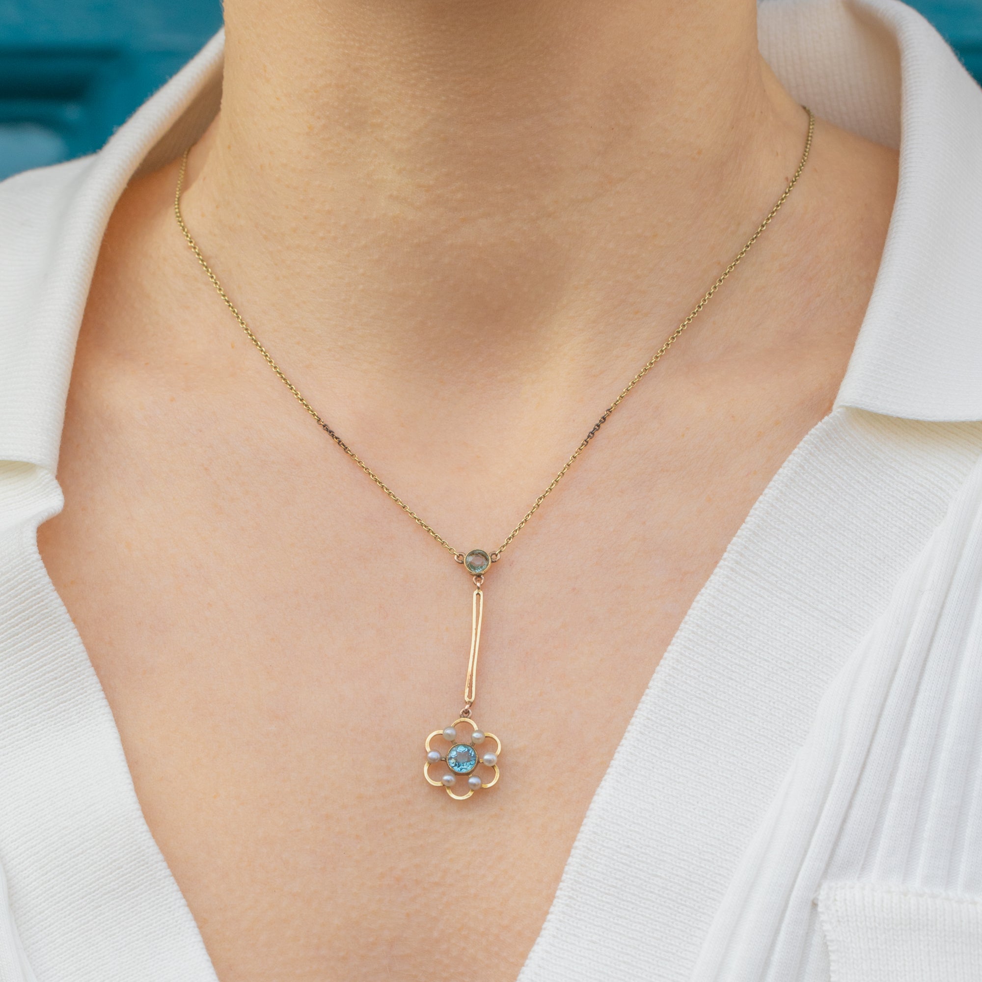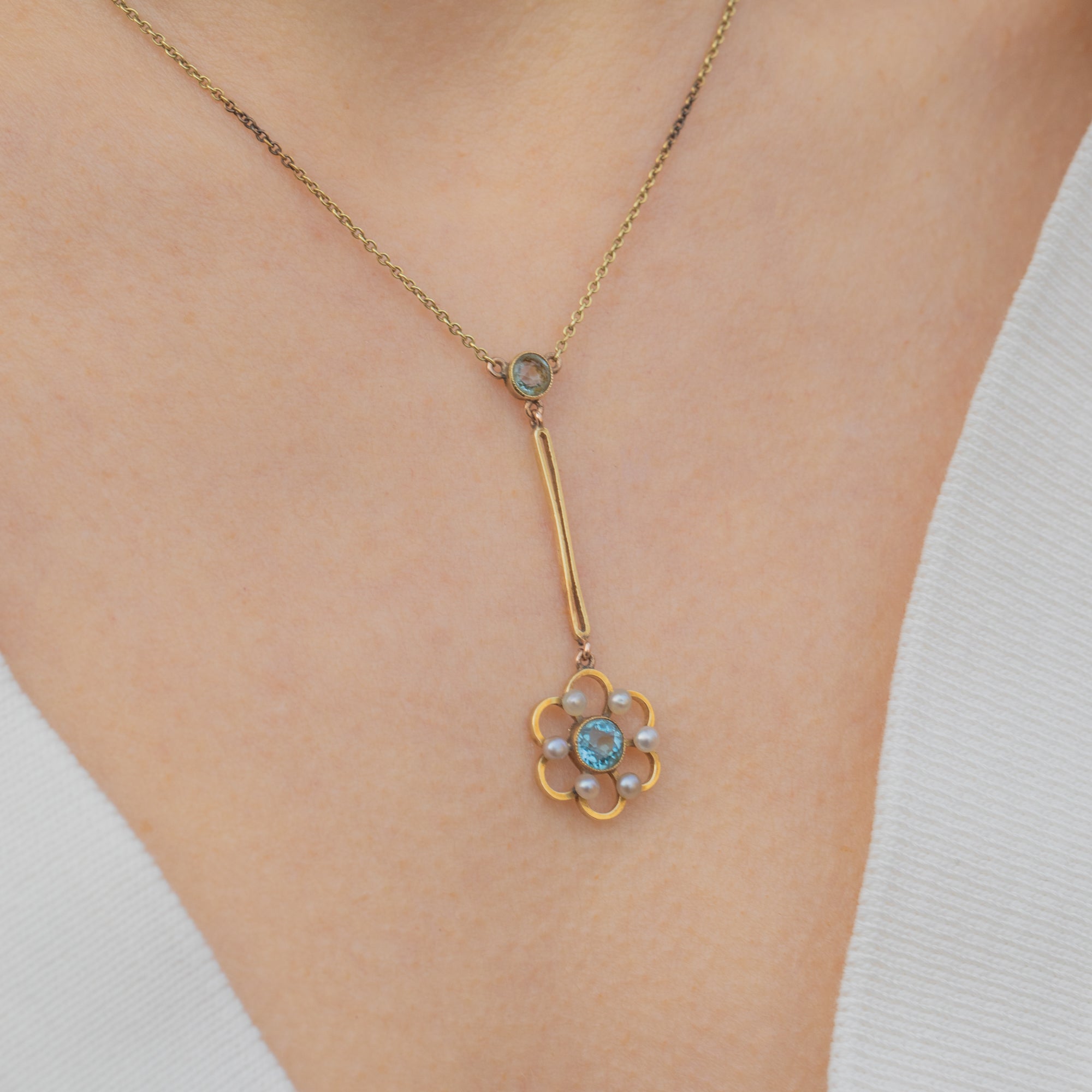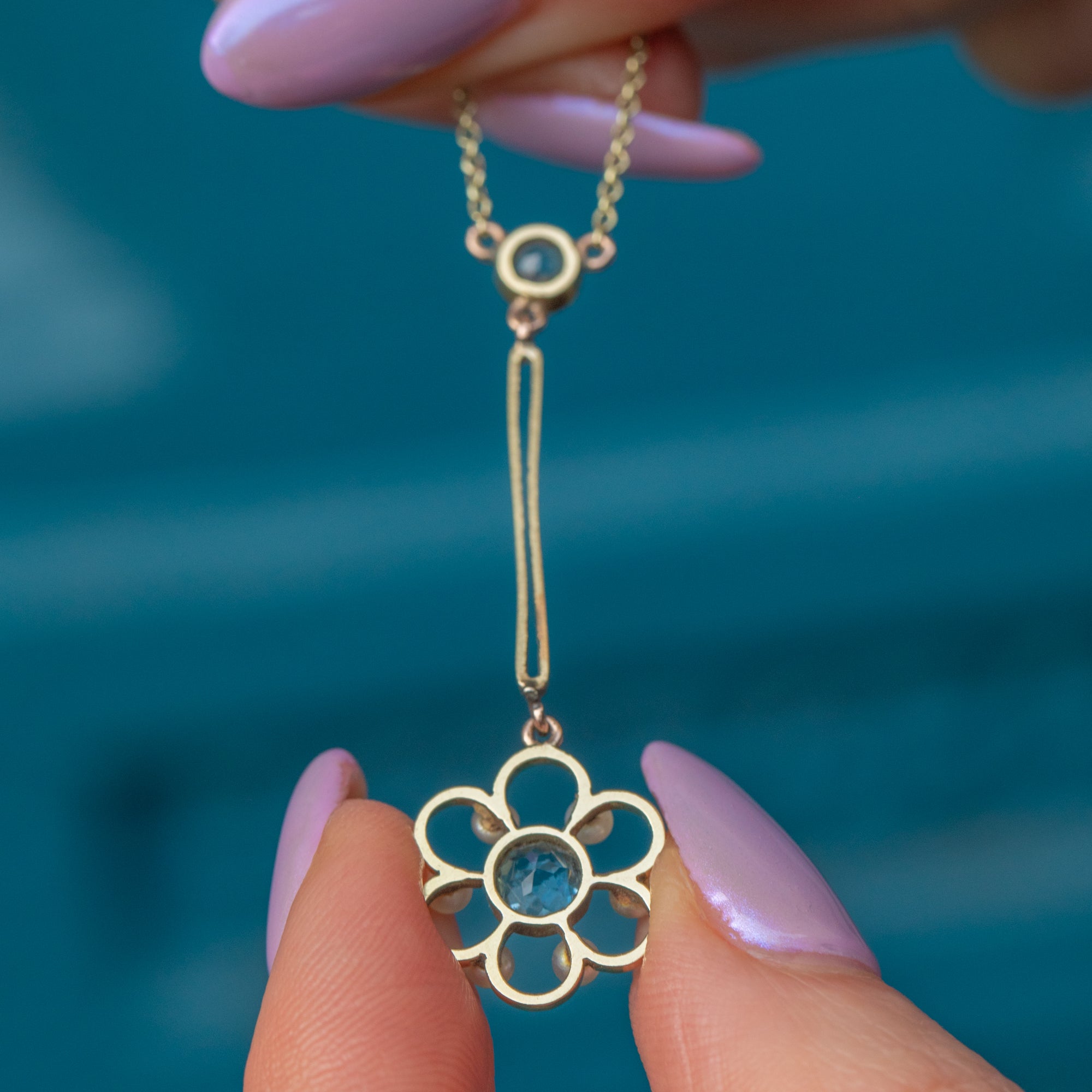 In quintessential Edwardian style, she features a dainty floral drop pendant, inlaid with lustrous Pearls and complete with a gorgeous sky blue Aquamarine in her centre. Each gemstone is complimented beautifully by the warmth of its buttery 15ct Gold settings and chain.