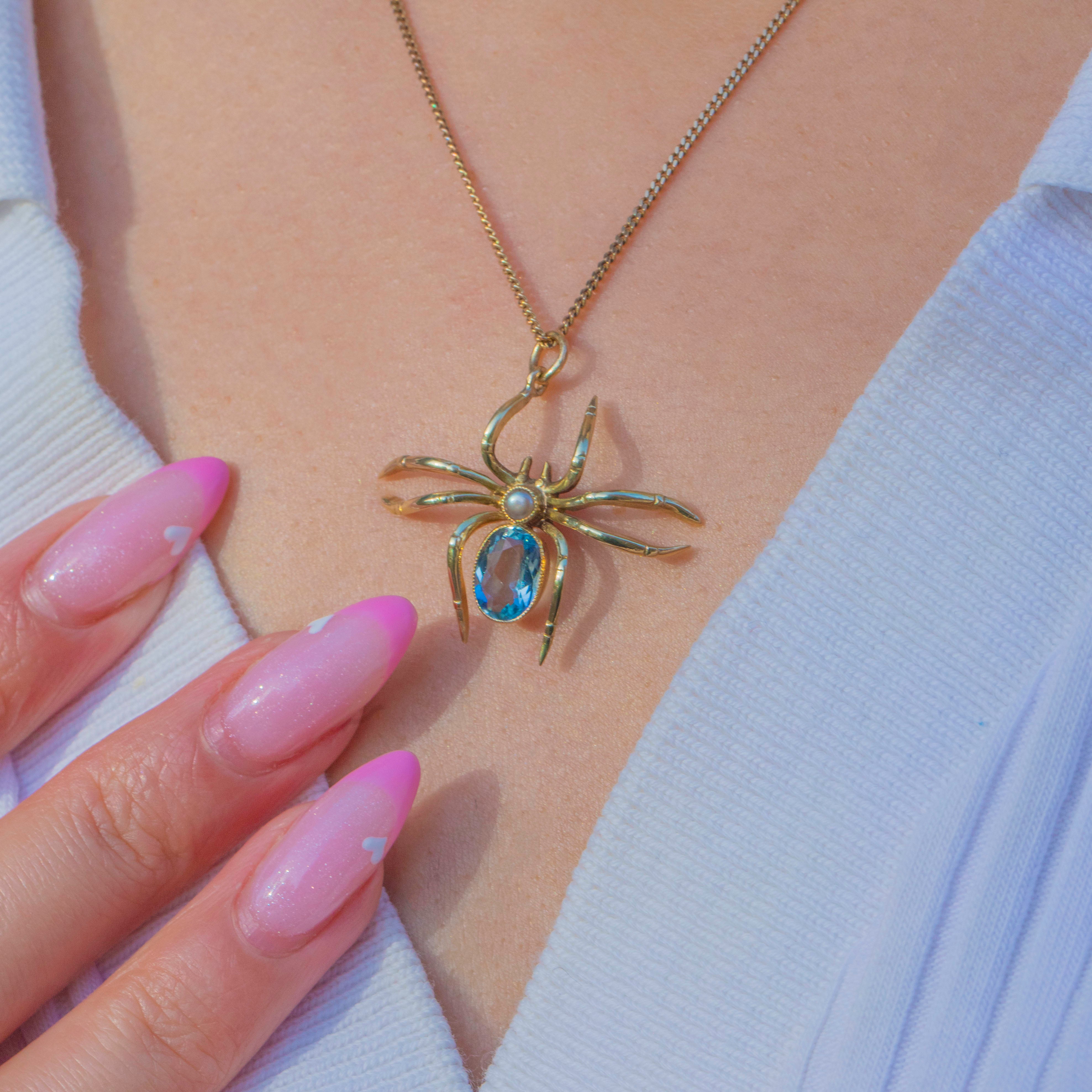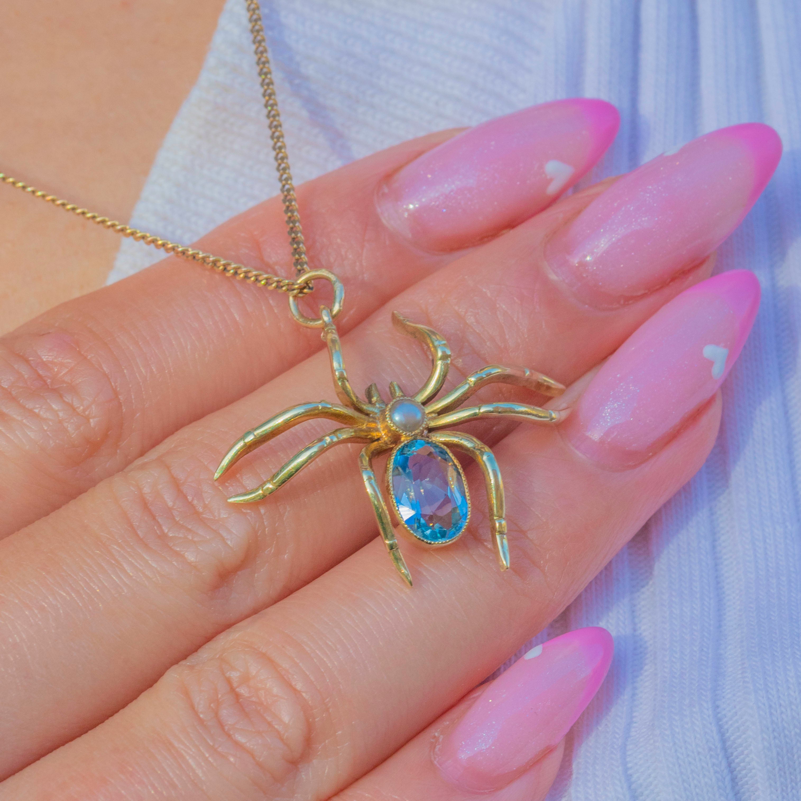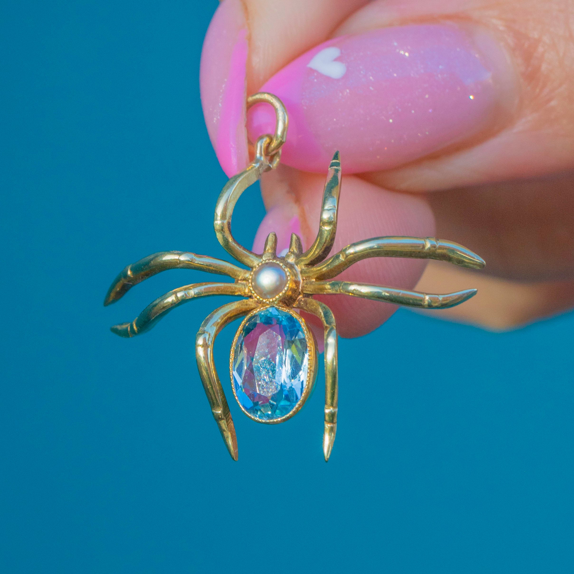 This charming Edwardian pendant is modelled as a spider, crafted in bright 15ct Yellow Gold with a glittering 0.75ct Aquamarine body and a delicate Seed Pearl head. The pastel blue of the Aquamarine sparkles beautifully against the warm Gold, giving this piece both elegance and whimsy.