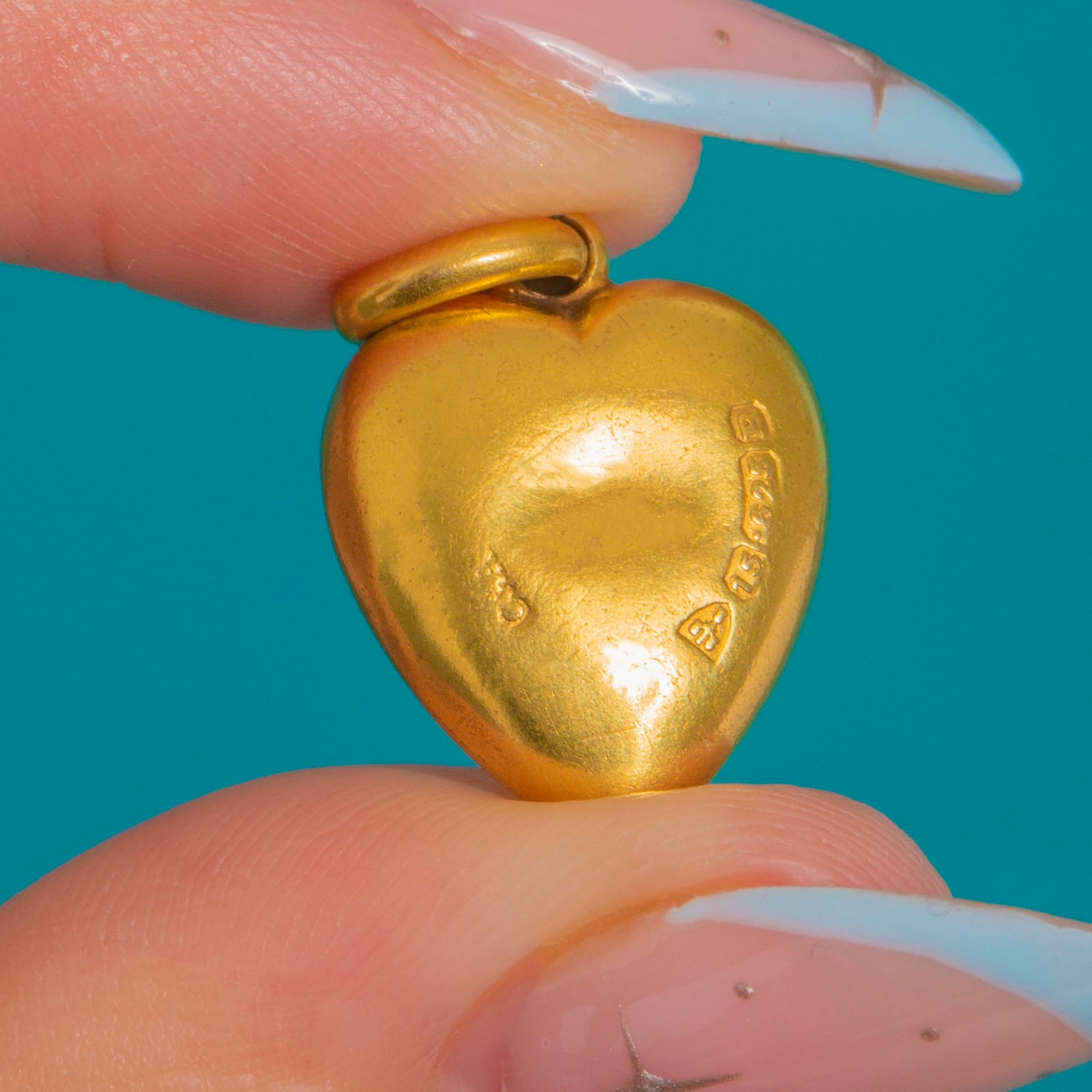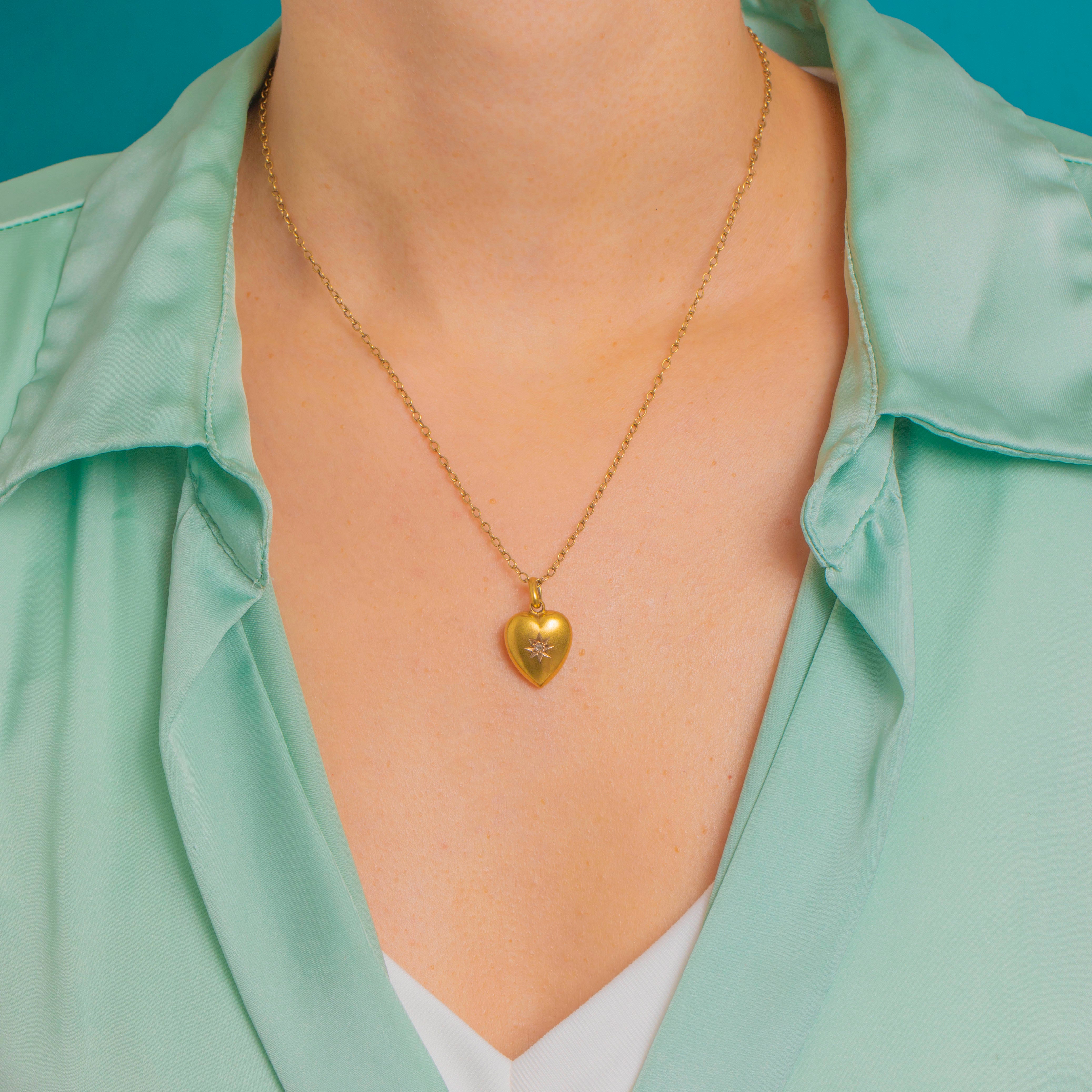 Beautifully made, the heart is topped with a hasp and jump-ring bail, the Diamond flush-set for a clean, refined look. Hallmarks to the reverse confirm Chester assay with a 1900 date, making this a timeless antique keepsake that layers effortlessly and wears with understated glow.