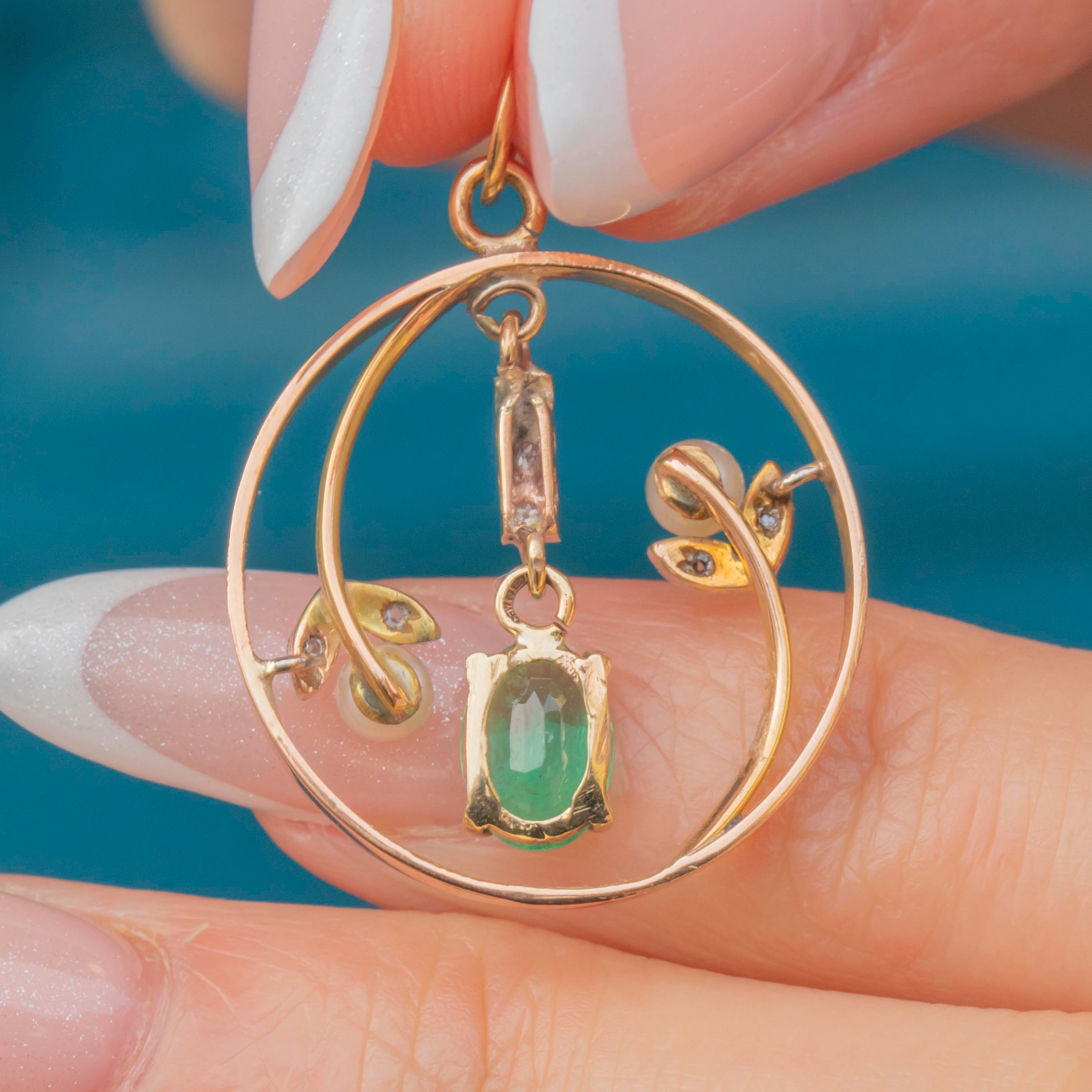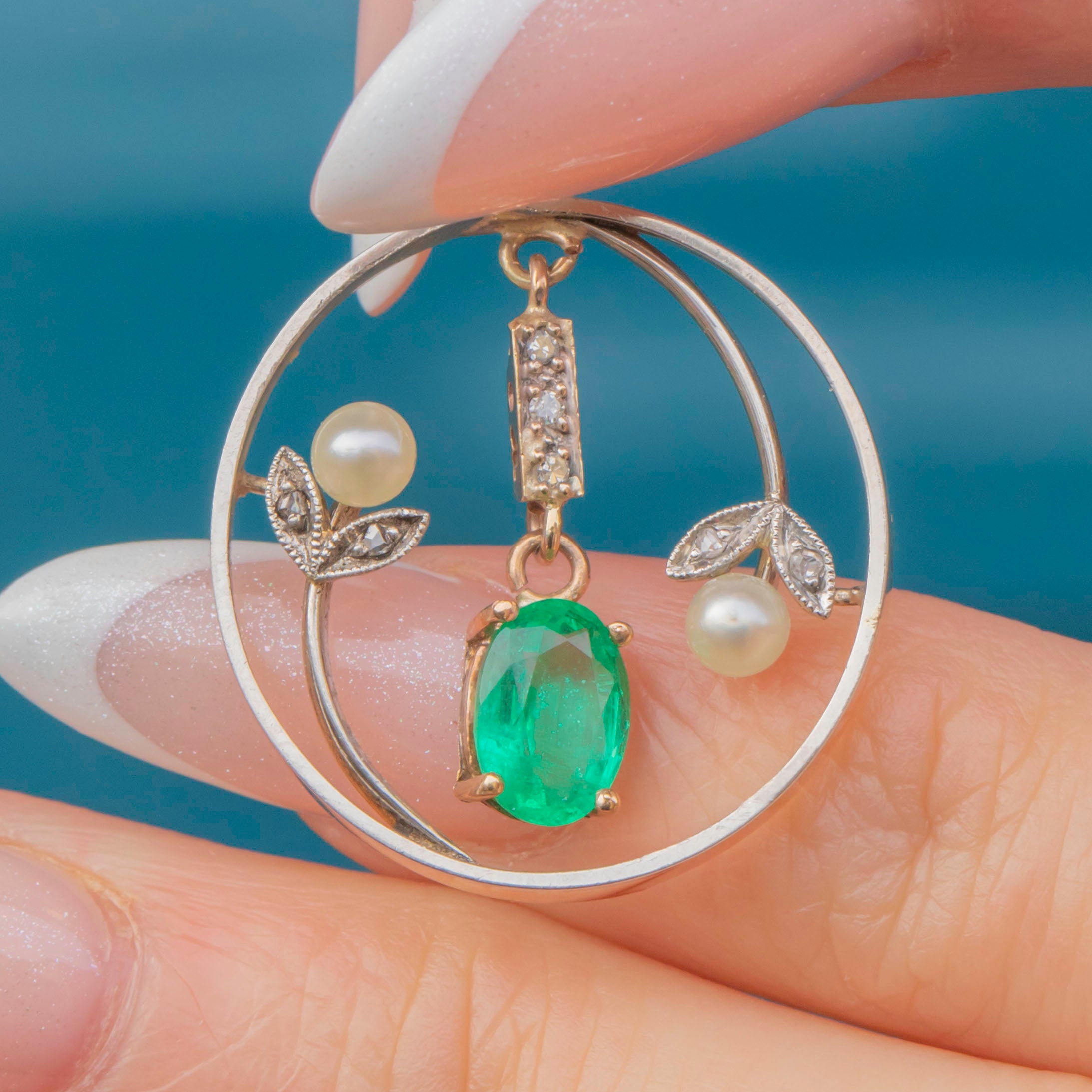 This striking Edwardian 15ct Gold Emerald Diamond flower pendant exudes feminine charm! Finely crafted from 15ct Gold and Platinum, the classically Edwardian roundel form displays an exquisite selection of gemstones, with its 0.46ct Emerald bound to grab your attention.