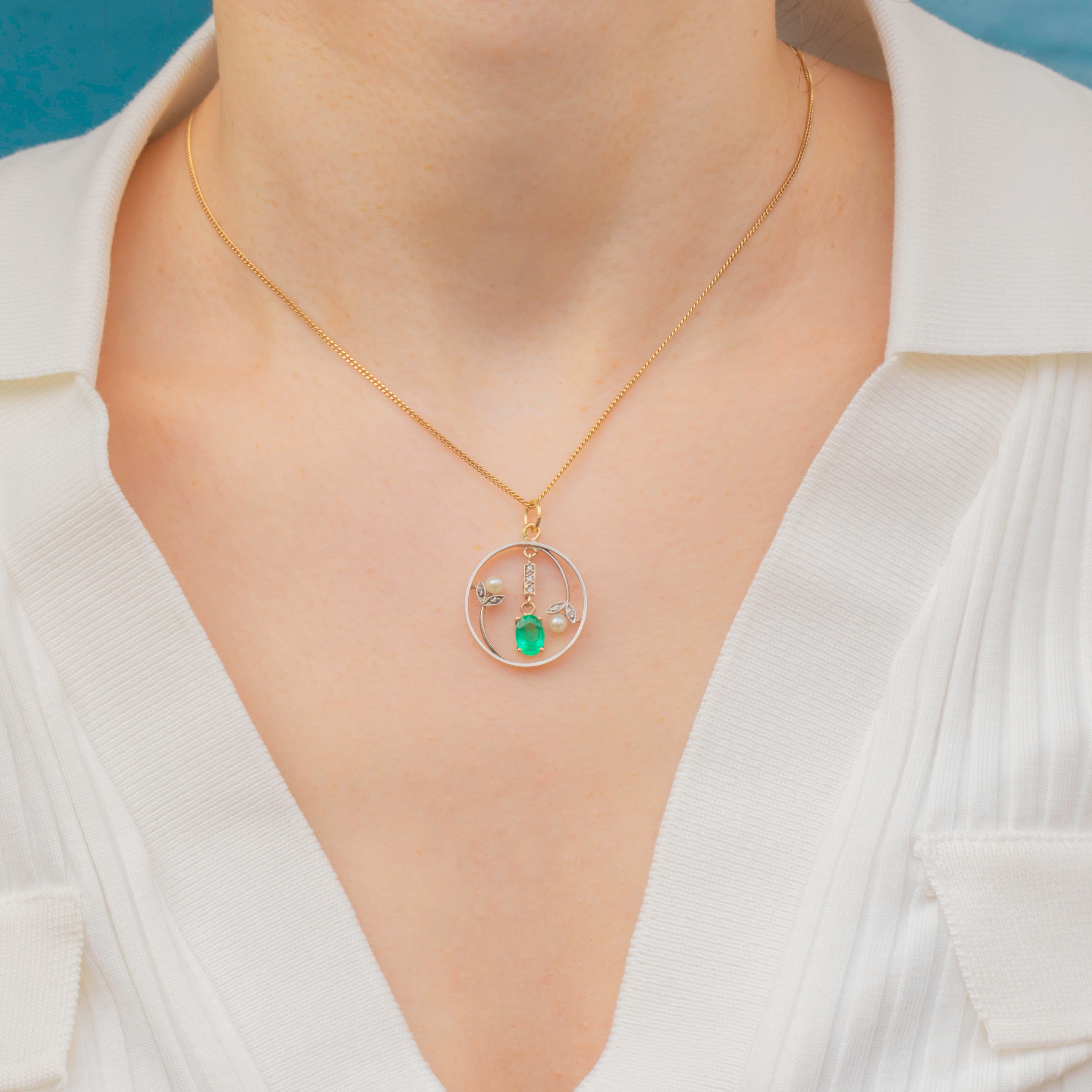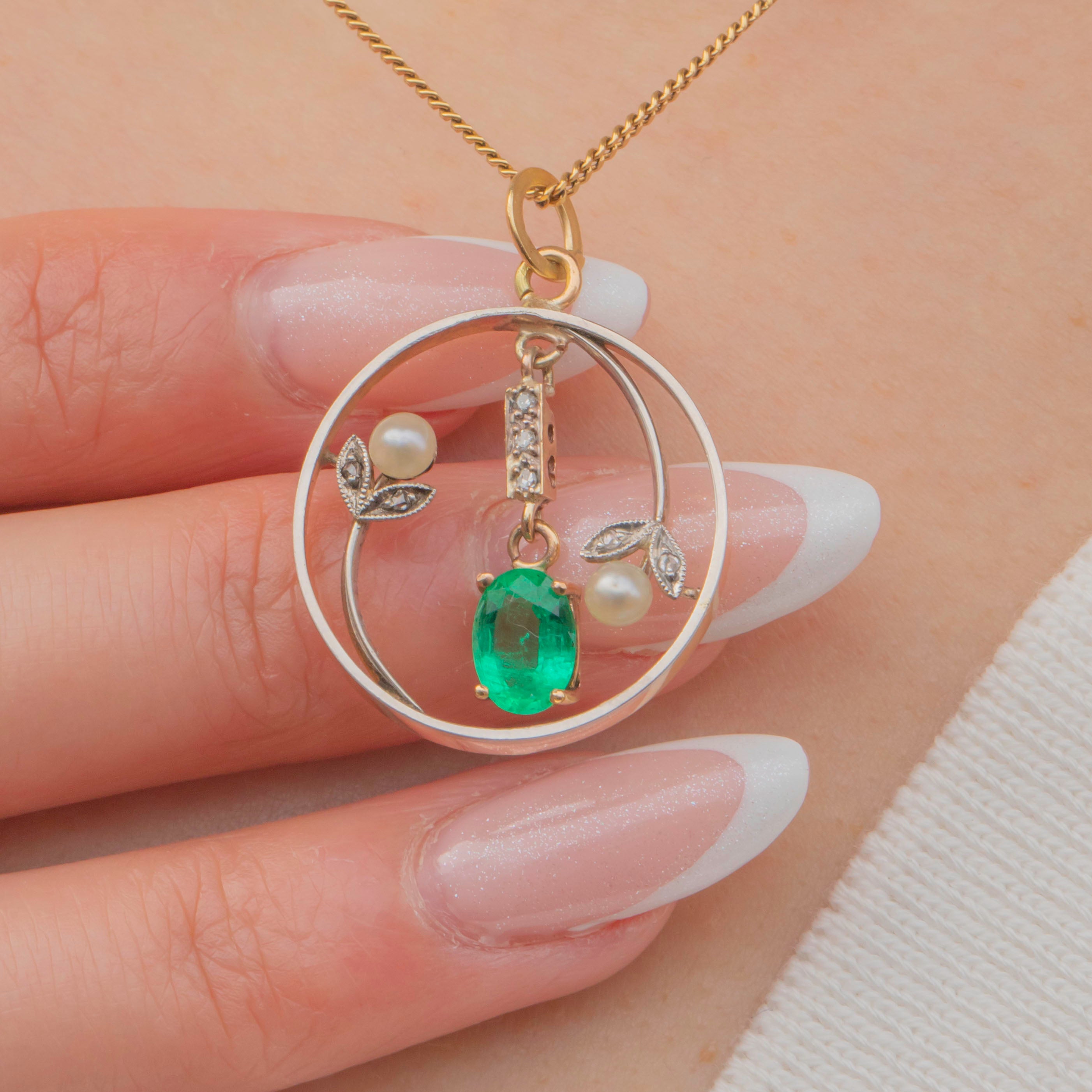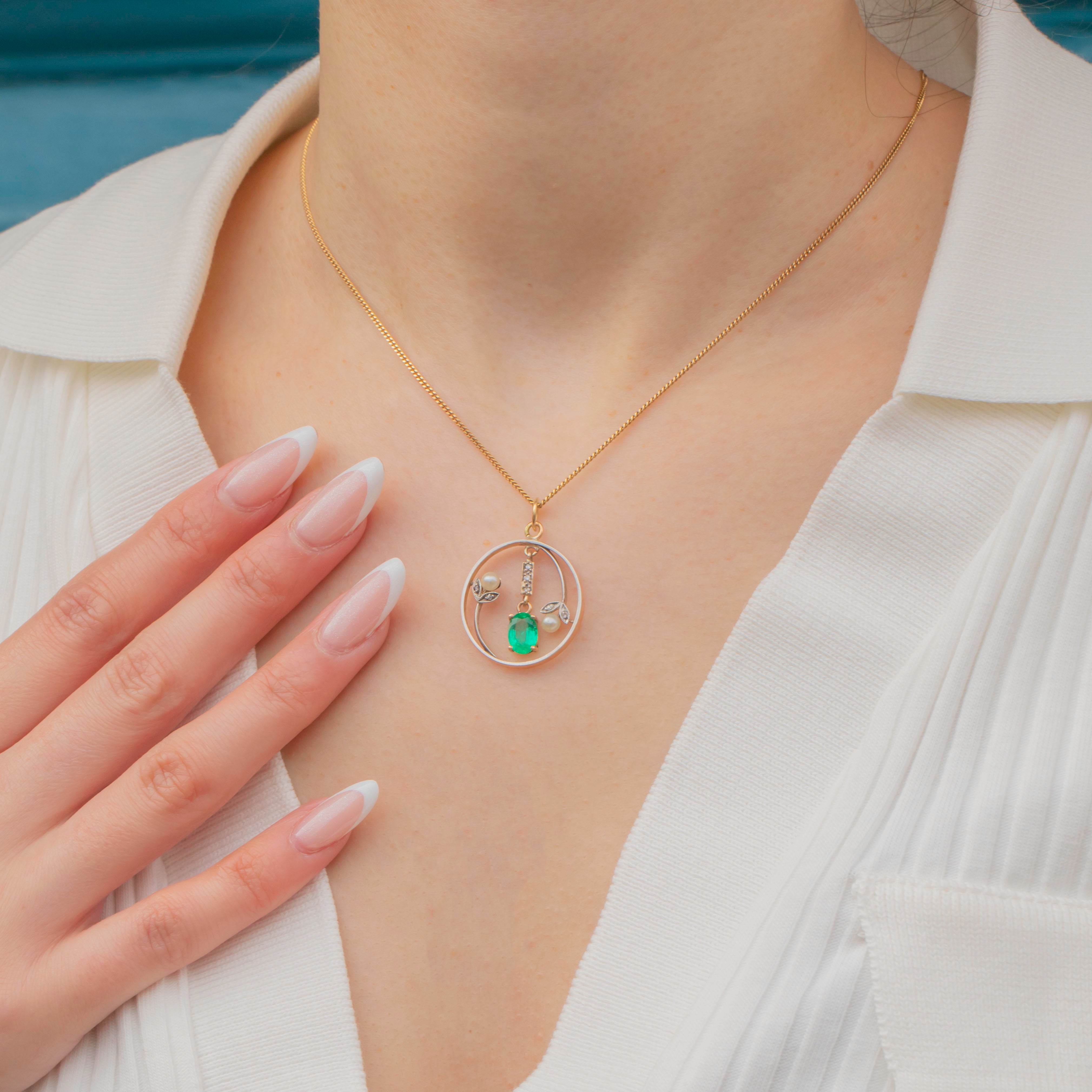 The vibrant grass-green Emerald is suspended from a Diamond-encrusted bar drop, providing this piece with lovely movement. Two floral forms curve elegantly around the central drop, their petals fanning out to display a linen white Pearl resting on top. With a unique and graceful design, this Edwardian pendant will make a standout addition to your collection!