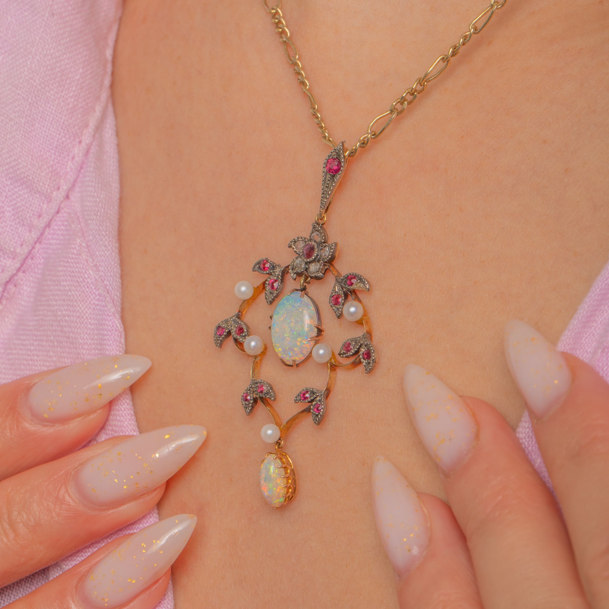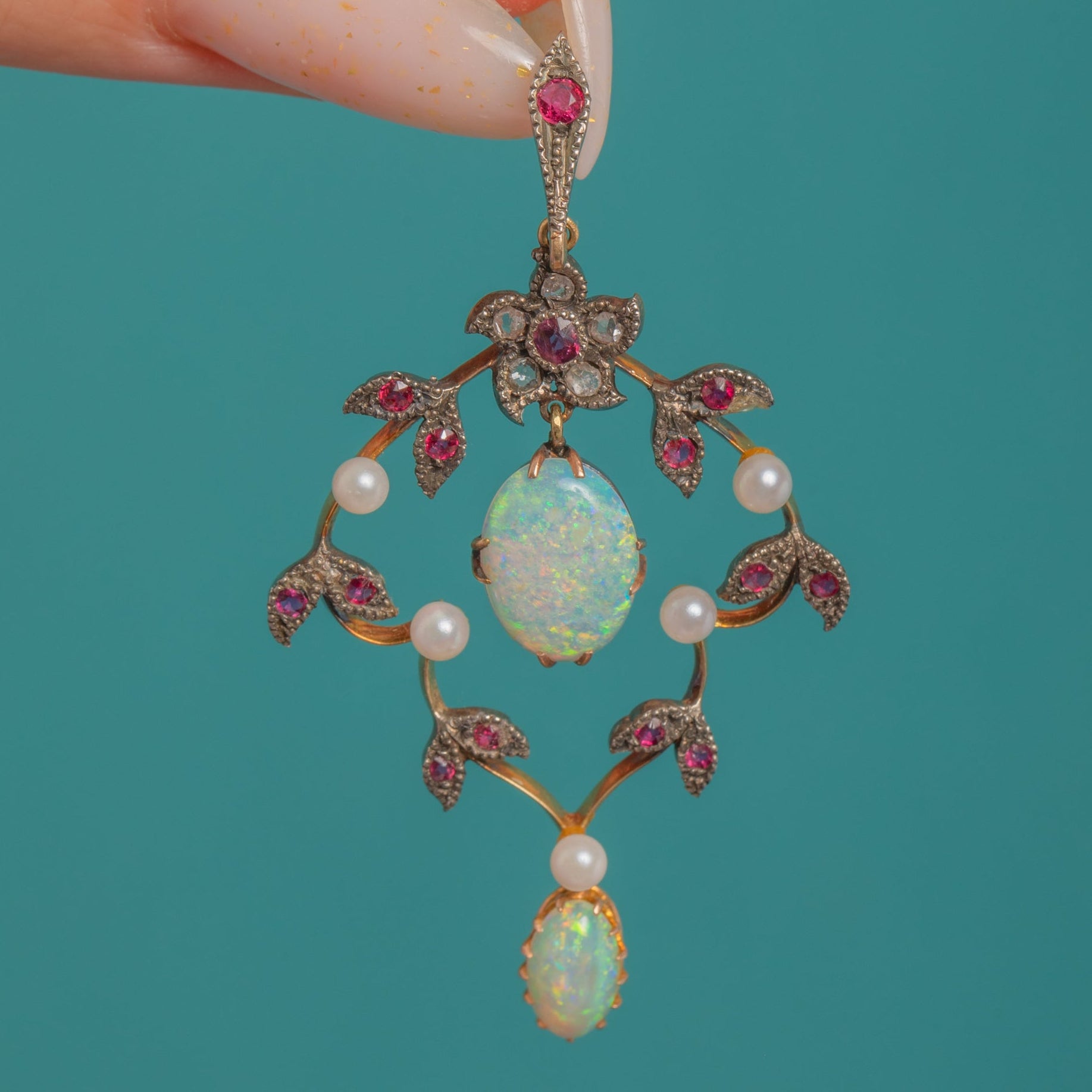 A dreamy Edwardian lavalier pendant, sculpted in 15ct Gold with Silver settings, its openwork foliate garland alive with delicate milgrain and pavé details. Two luminous Opal cabochons take centre stage, their milky bodies flashing blue, green and ember-orange, framed by twinkling Diamonds, vivid Ruby accents and tiny creamy Pearls.
