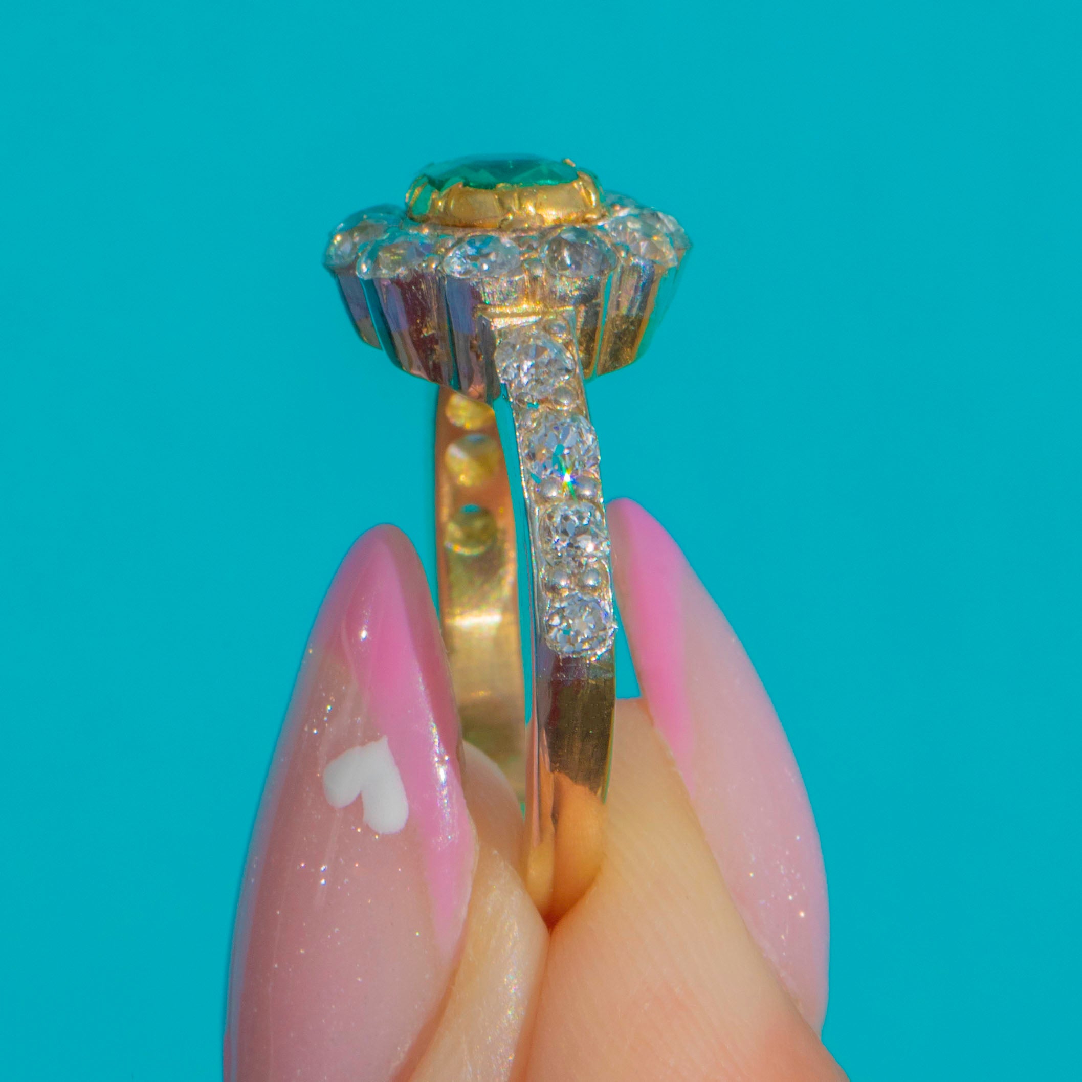 EXCELLENT: The Emerald is richly coloured with fine clarity and minimal natural inclusions. Diamonds are bright, well-matched and securely set. The Gold and Silver retain a beautiful antique polish, with no thinning or wear to the band. A superbly preserved Edwardian cluster ring of outstanding quality.