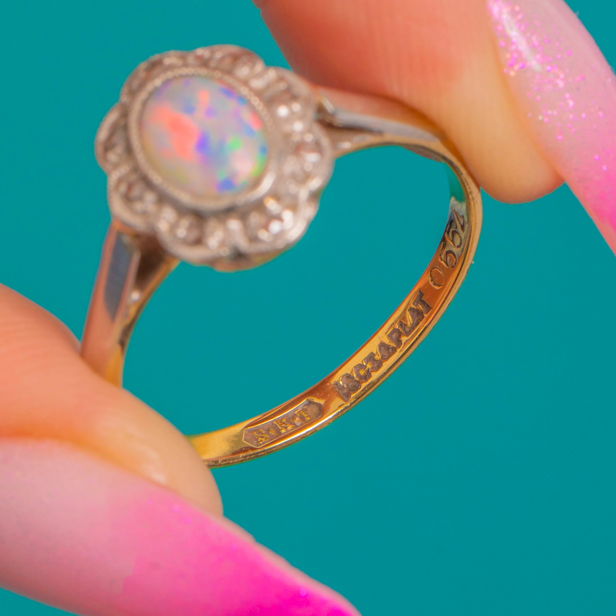 EXCELLENT: The Opal is bright with strong play-of-colour and no obvious chips or abrasions visible; the rose-cut Diamonds are lively and well-matched. The settings are secure with crisp milgrain, and the shank shows only light surface wear consistent with age with subtle patina in recessed areas. No visible repairs or resizing.