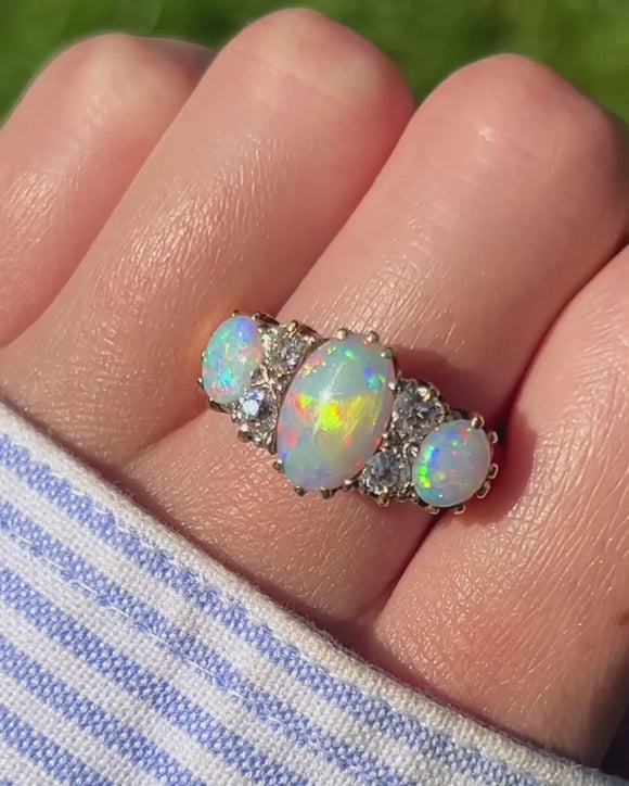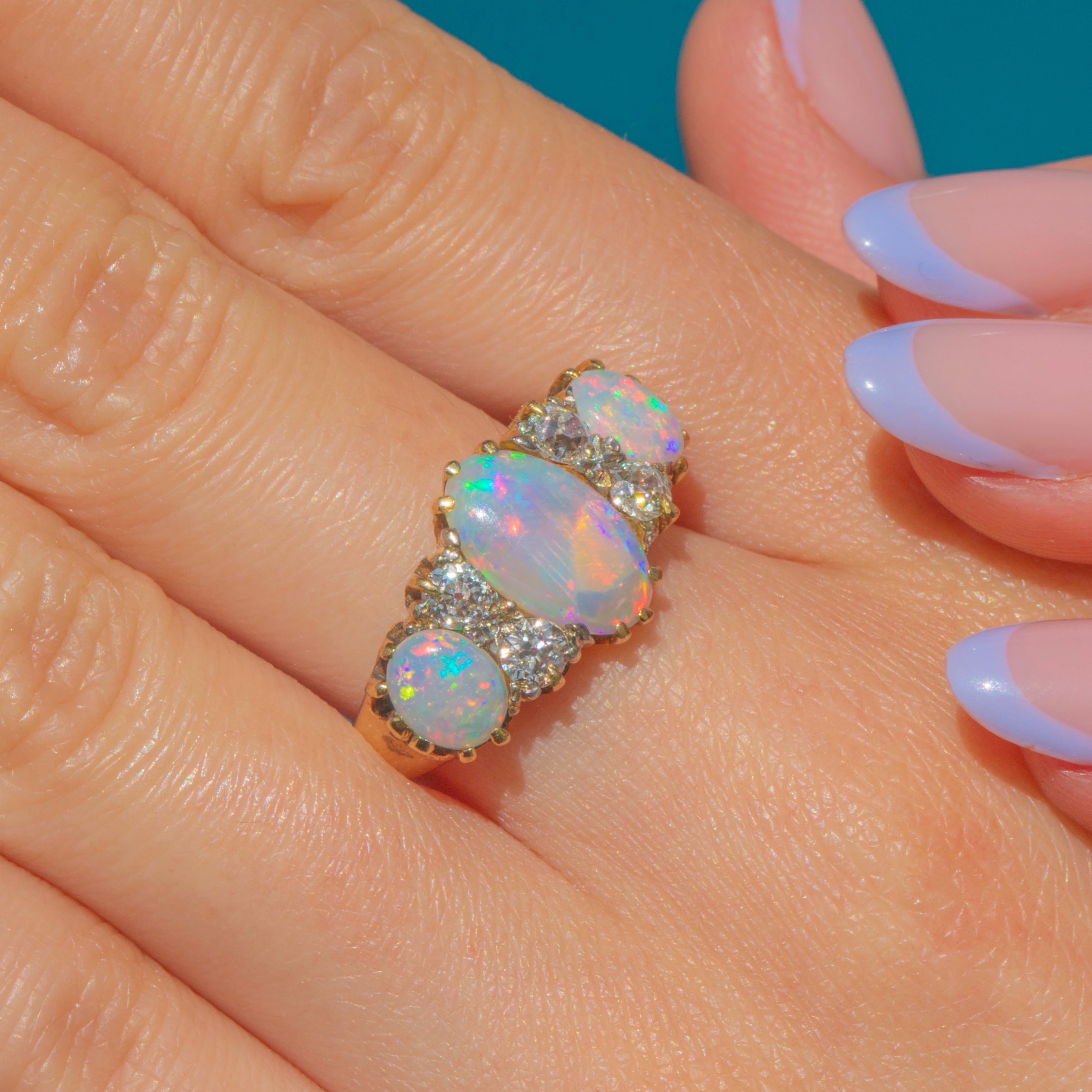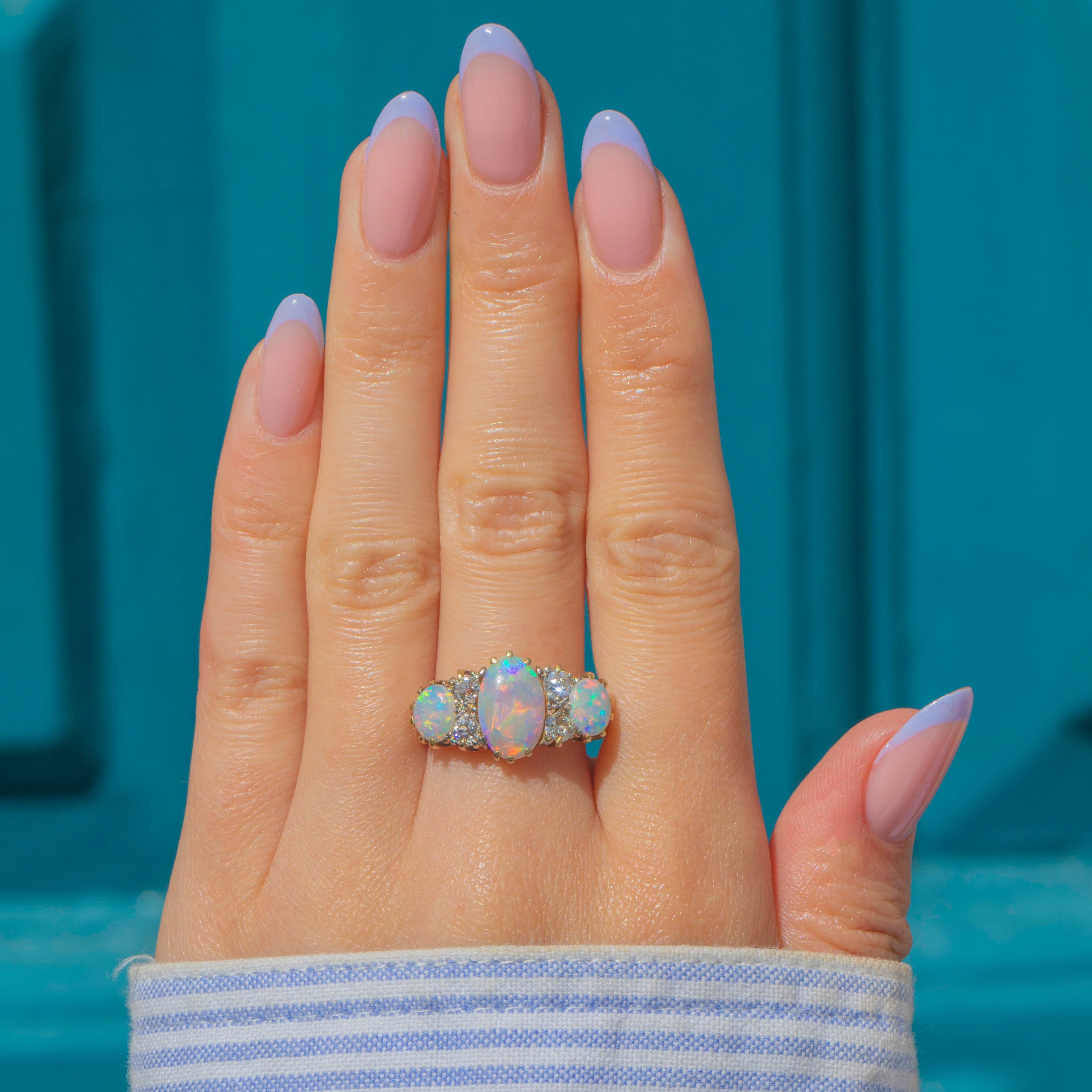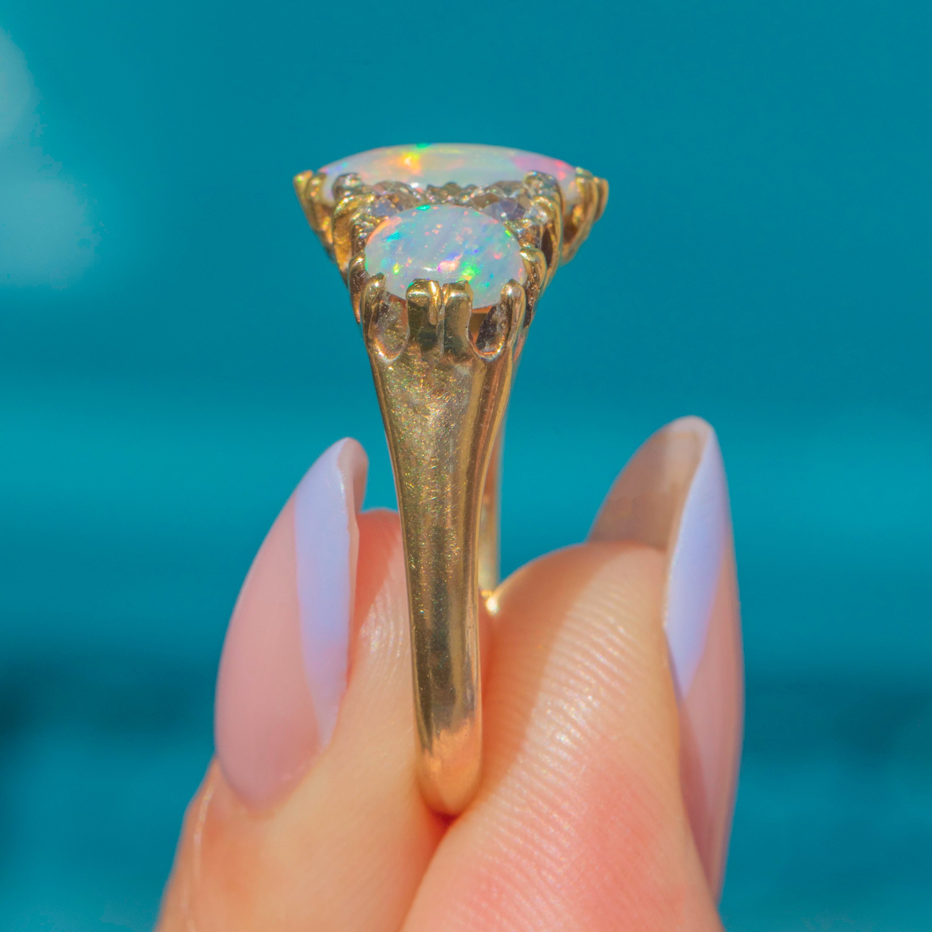 Three iridescent Opals and four scintillating Diamonds form the centre of this resplendent seven-stone ring, each boasting a magnificent radiance. The Opals, with a combined weight of 0.90ct, project a kaleidoscope of blues greens and lilac, with striking flashes of orange as they catch the light. This Edwardian ring impresses from every angle!