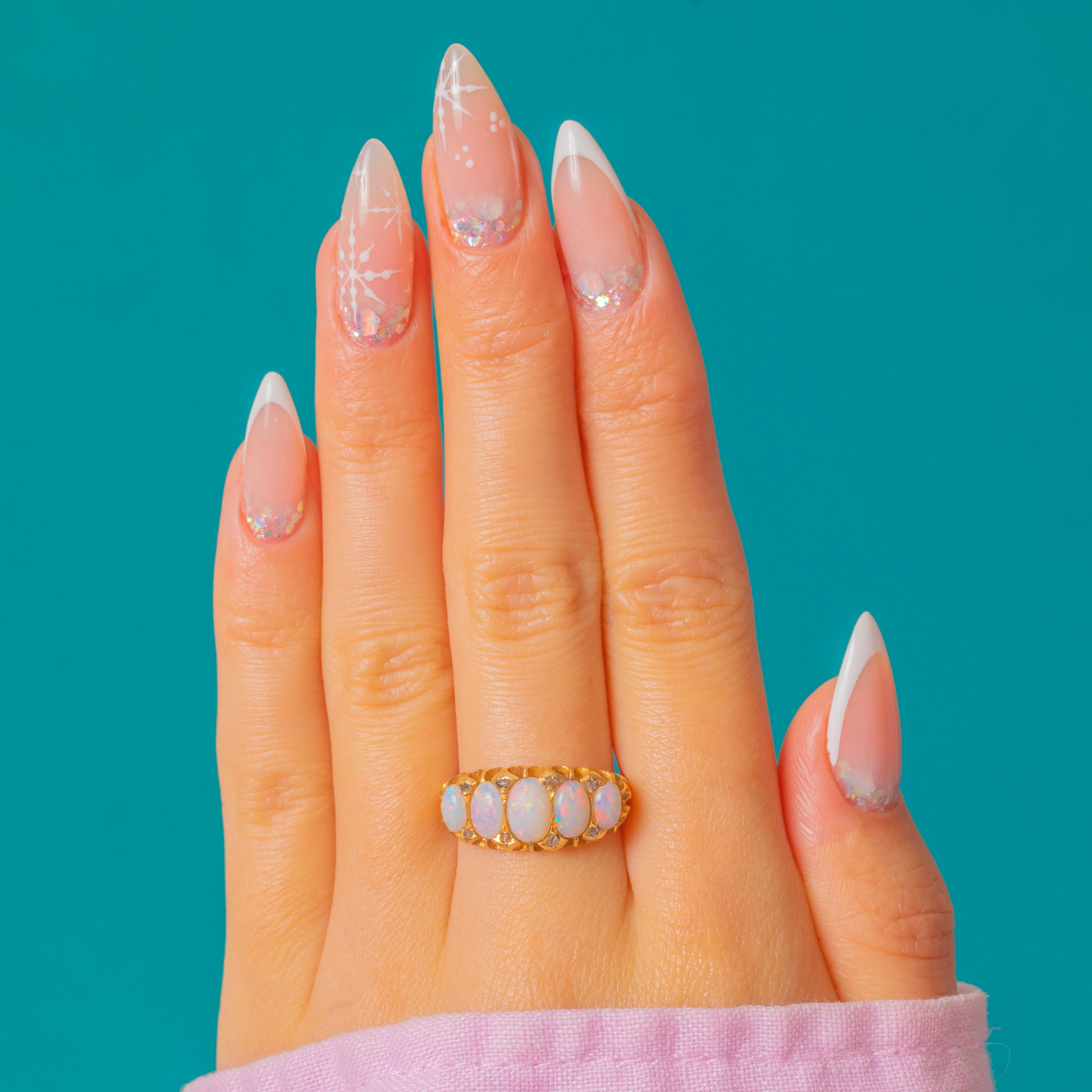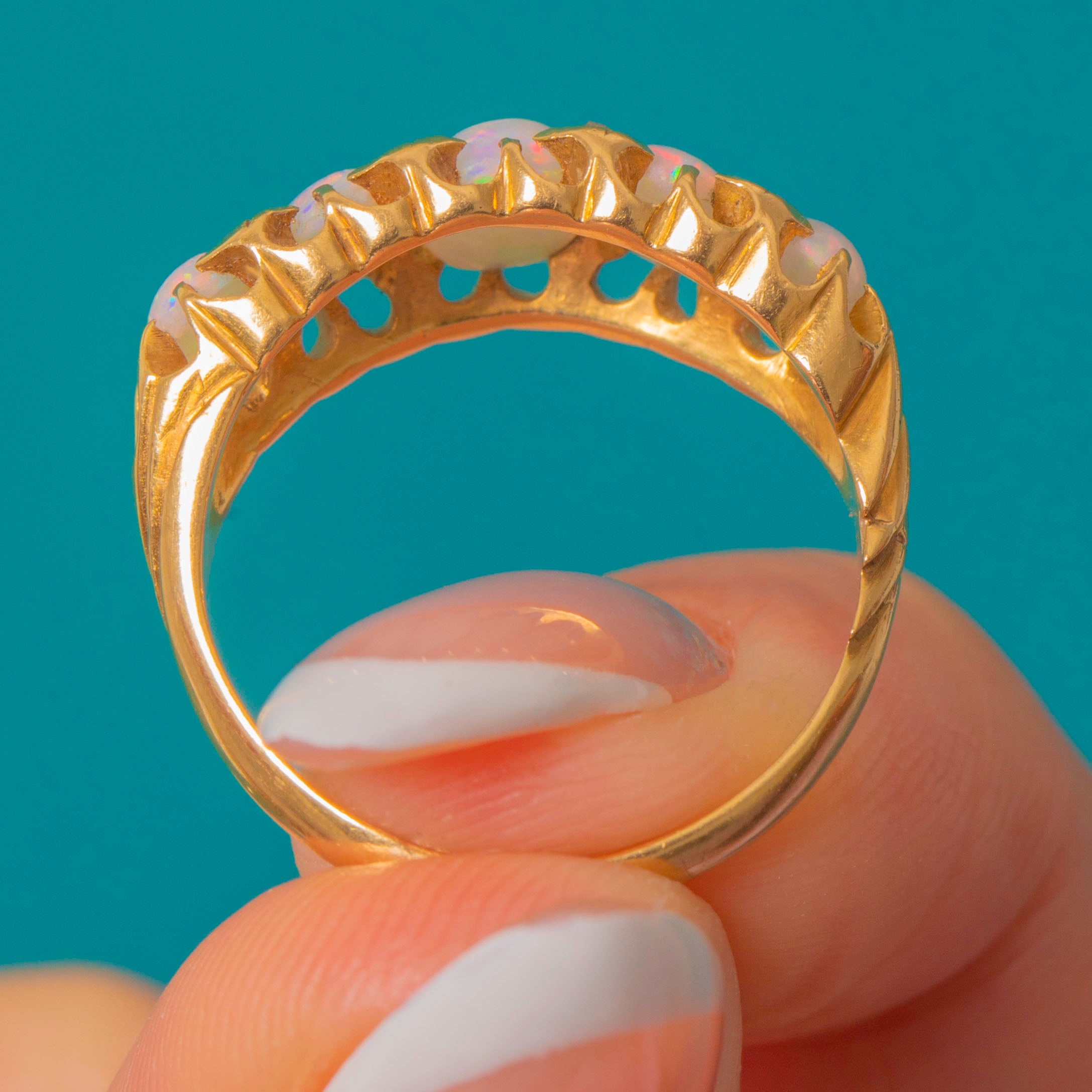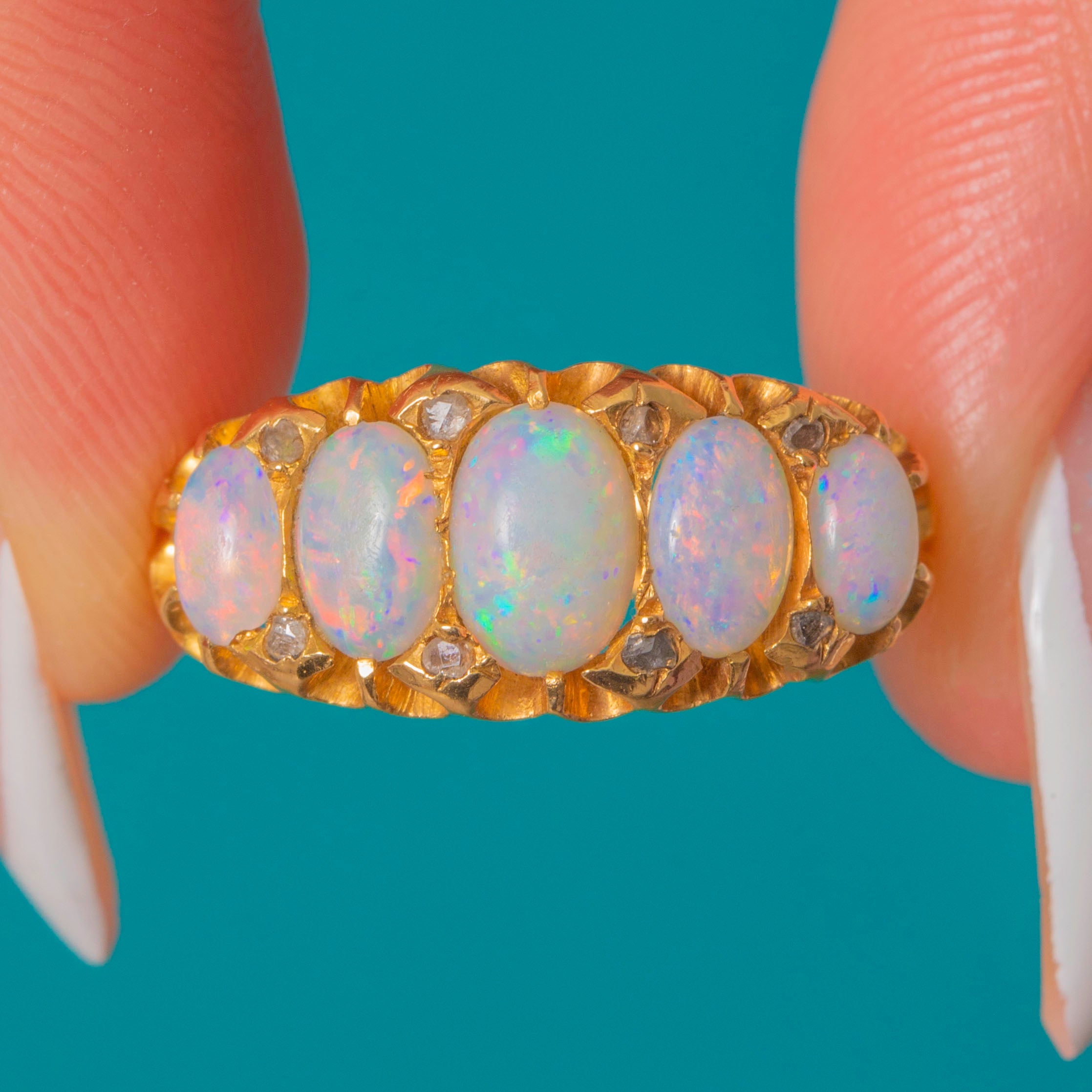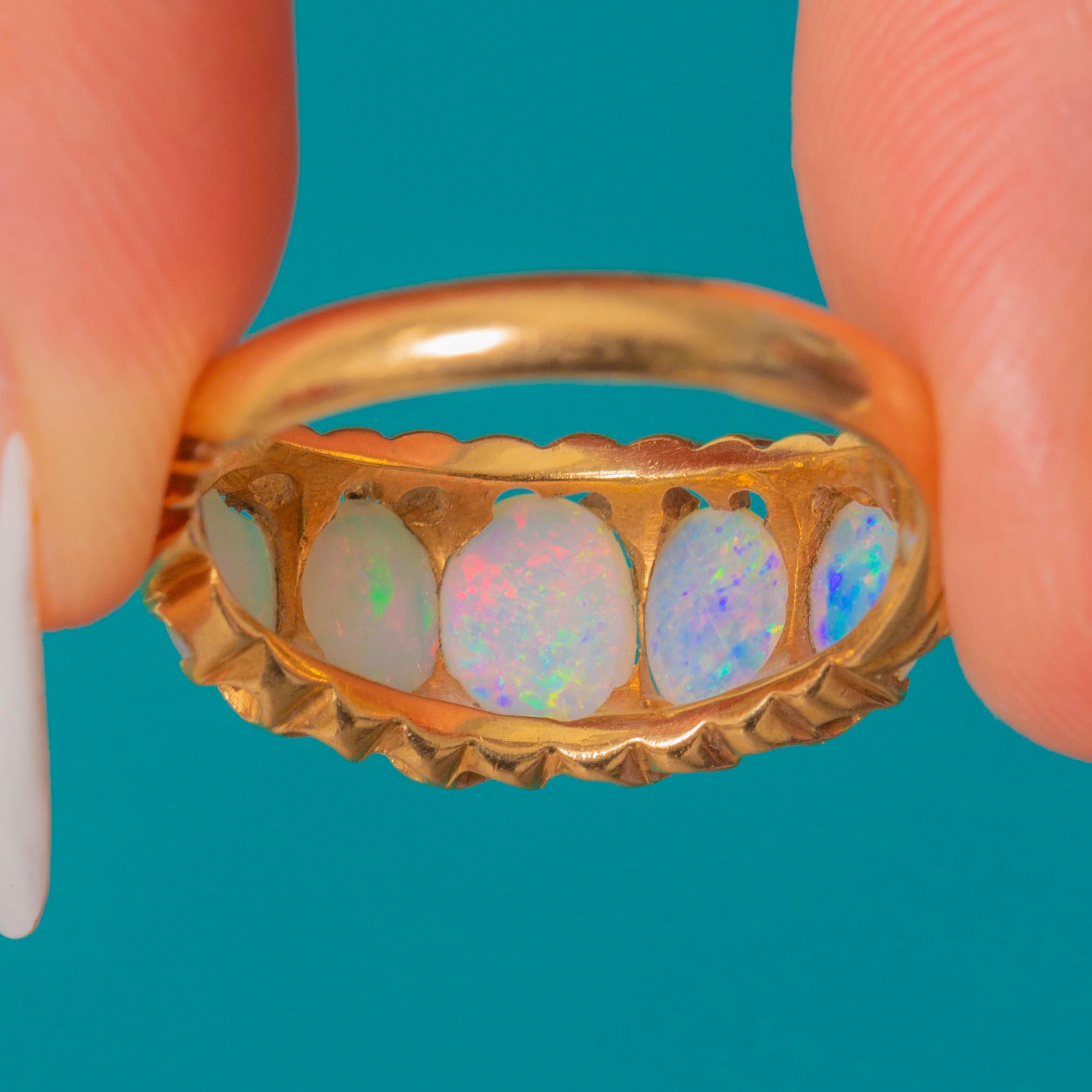This enchanting antique Opal ring will look resplendent adorning your hand! The five zingy Opal cabochons span the width of the finger, providing exceptional finger coverage, each one bursting with a confetti display of colours across their lilac cores.