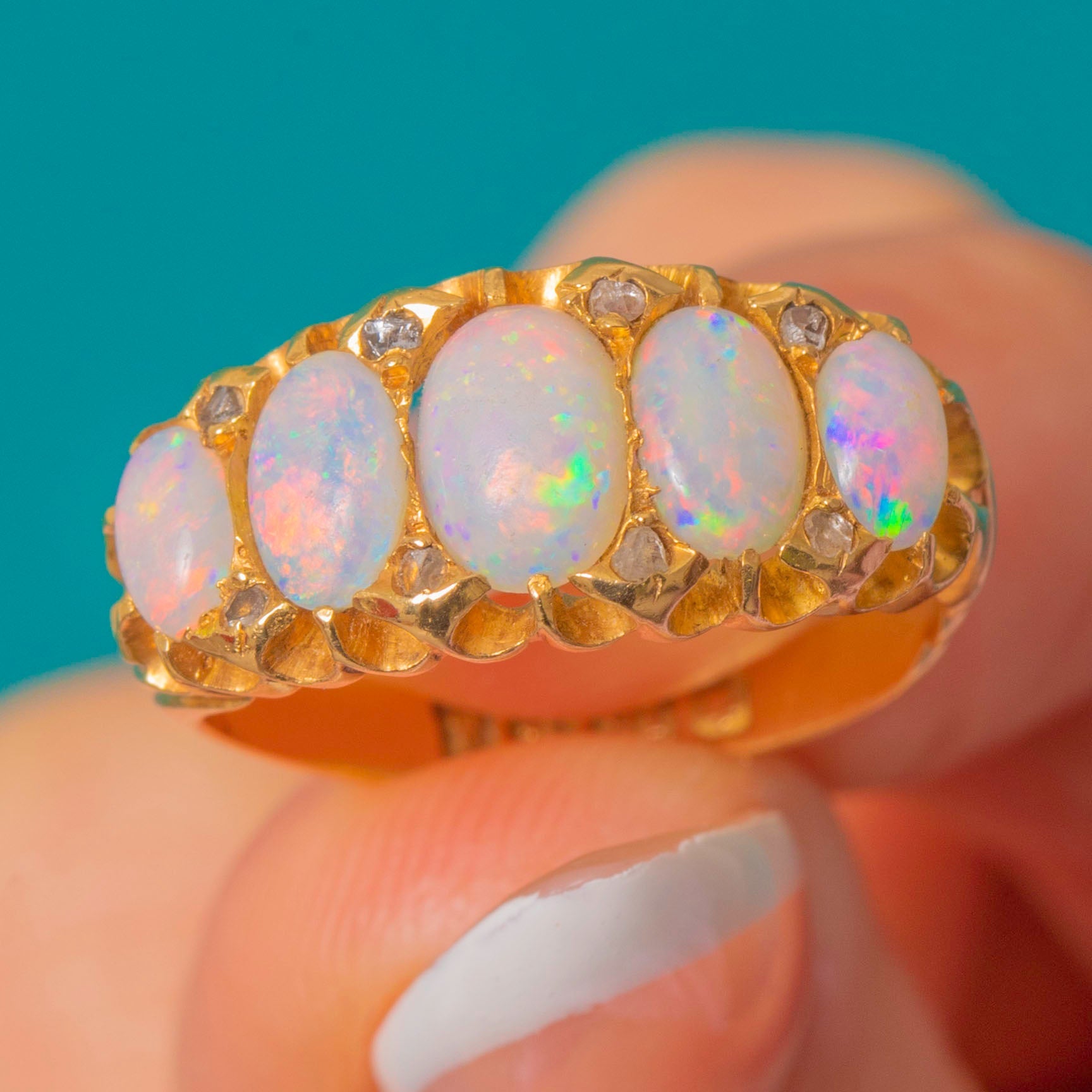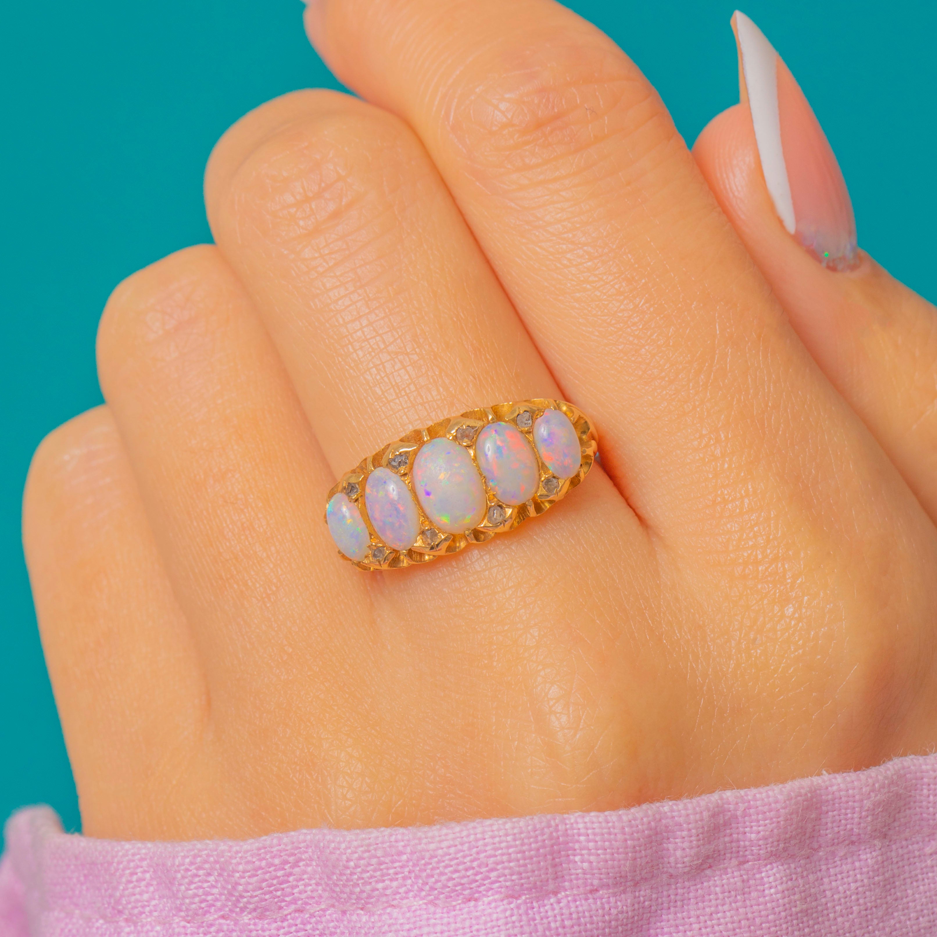 Edwardian 18ct Gold Opal Five Stone Ring, Diamond Spacers