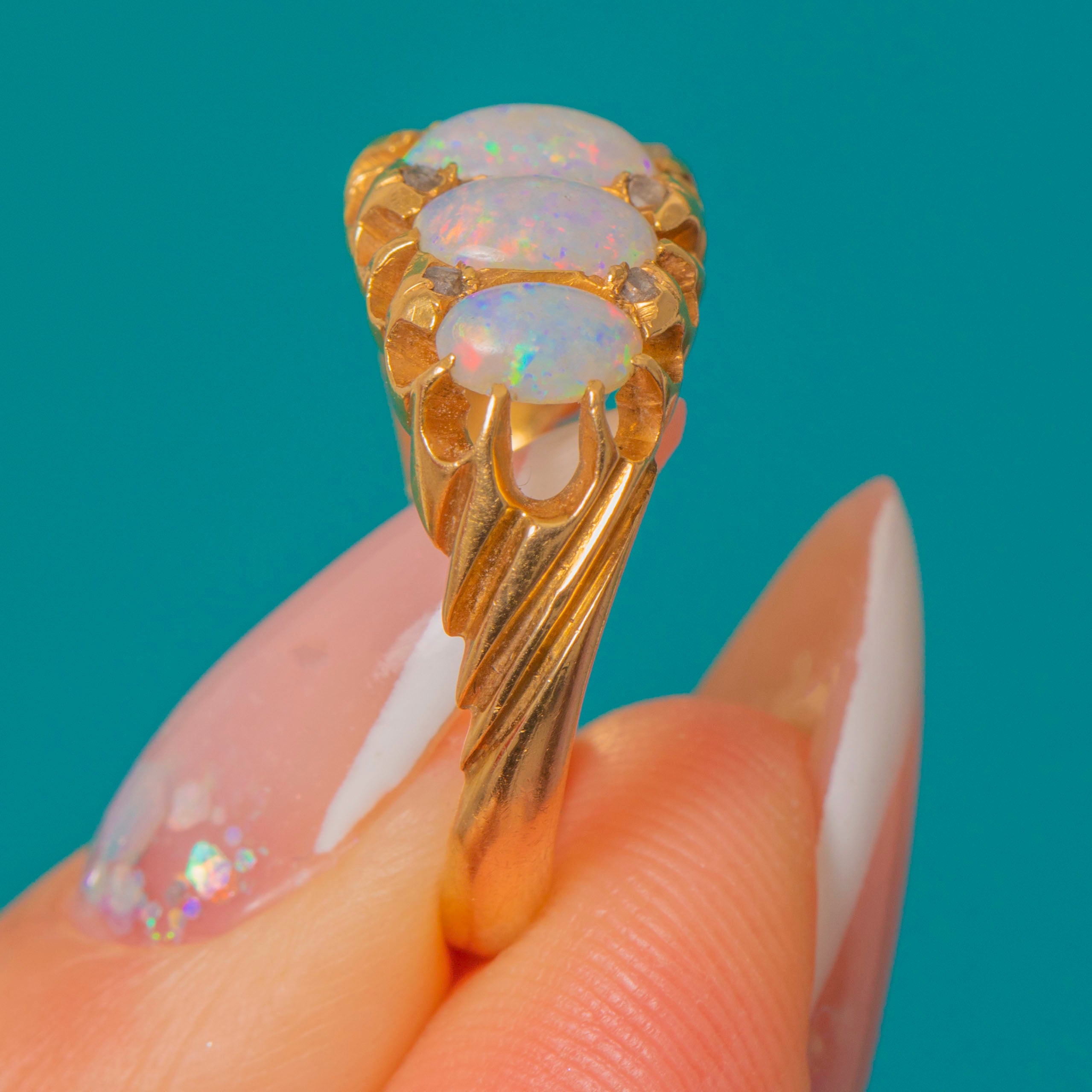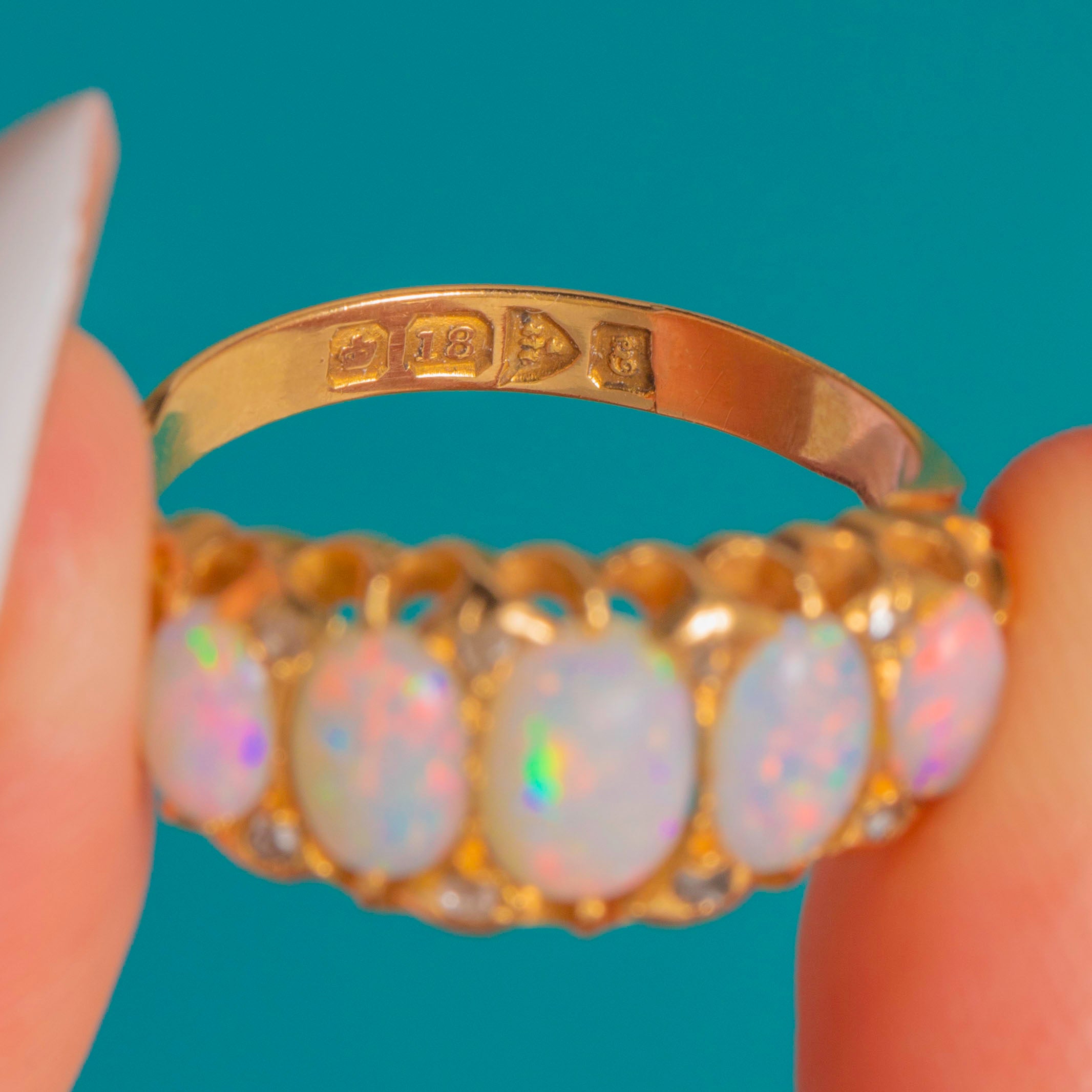 The Opals are accompanied by dainty rose-cut Diamond spacers, adding a subtle sparkling accent, all set into saturated 18ct Gold. Complete with a full set of hallmarks, including the rare Chester Assay, dating to 1905, this Edwardian Opal ring is a fine investment piece!
