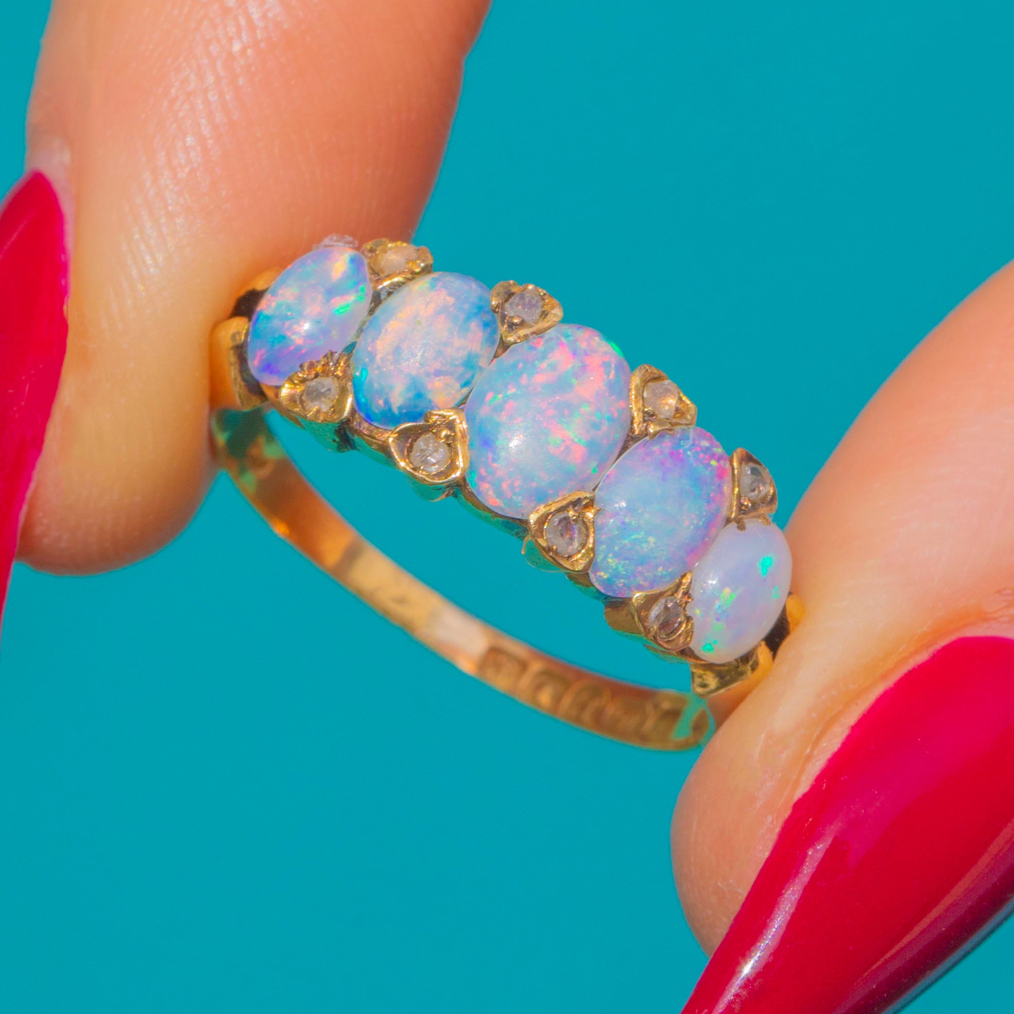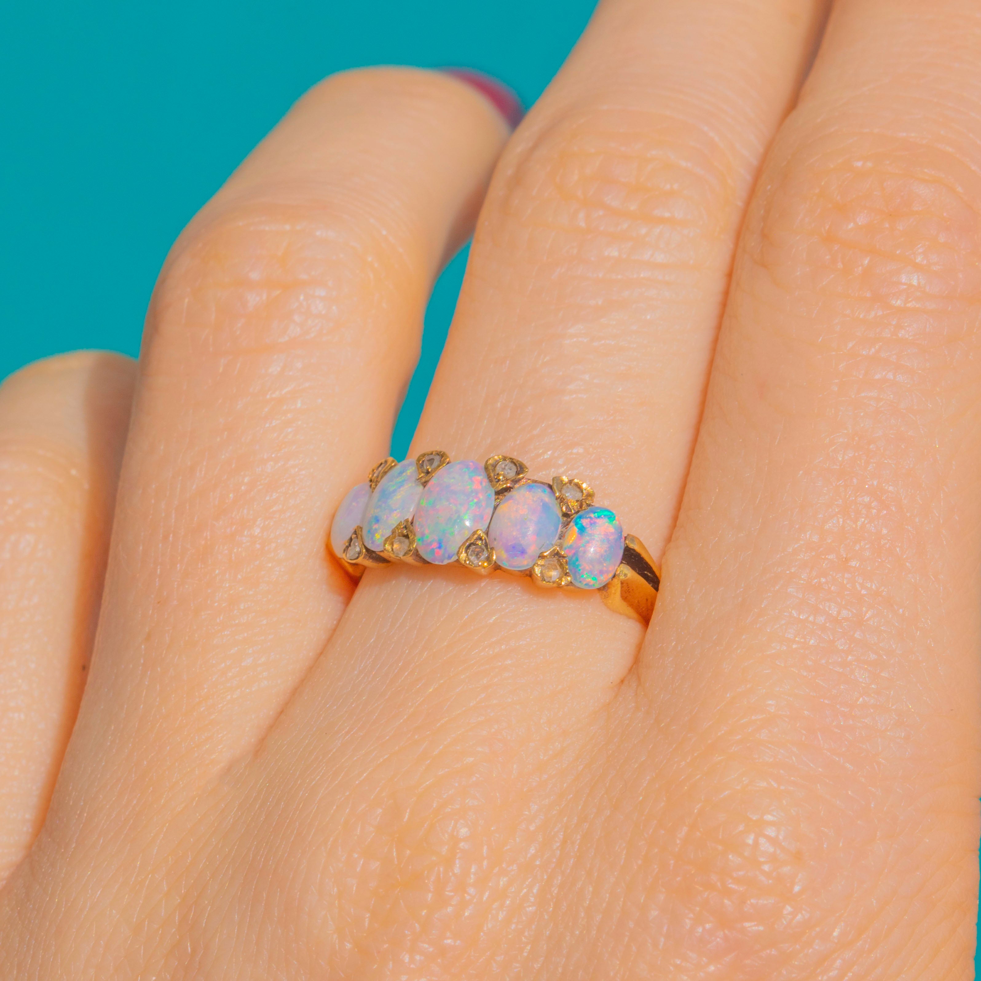 A luminous Edwardian five-stone ring ablaze with colour, this 18ct Gold beauty showcases five oval Opal cabochons alive with pink, blue and green play-of-colour, interspersed with tiny Diamond spacers for a twinkling lift between each gem. The low, elegant line and delicate petal-like separators give a refined, romantic silhouette that’s as wearable as it is enchanting.