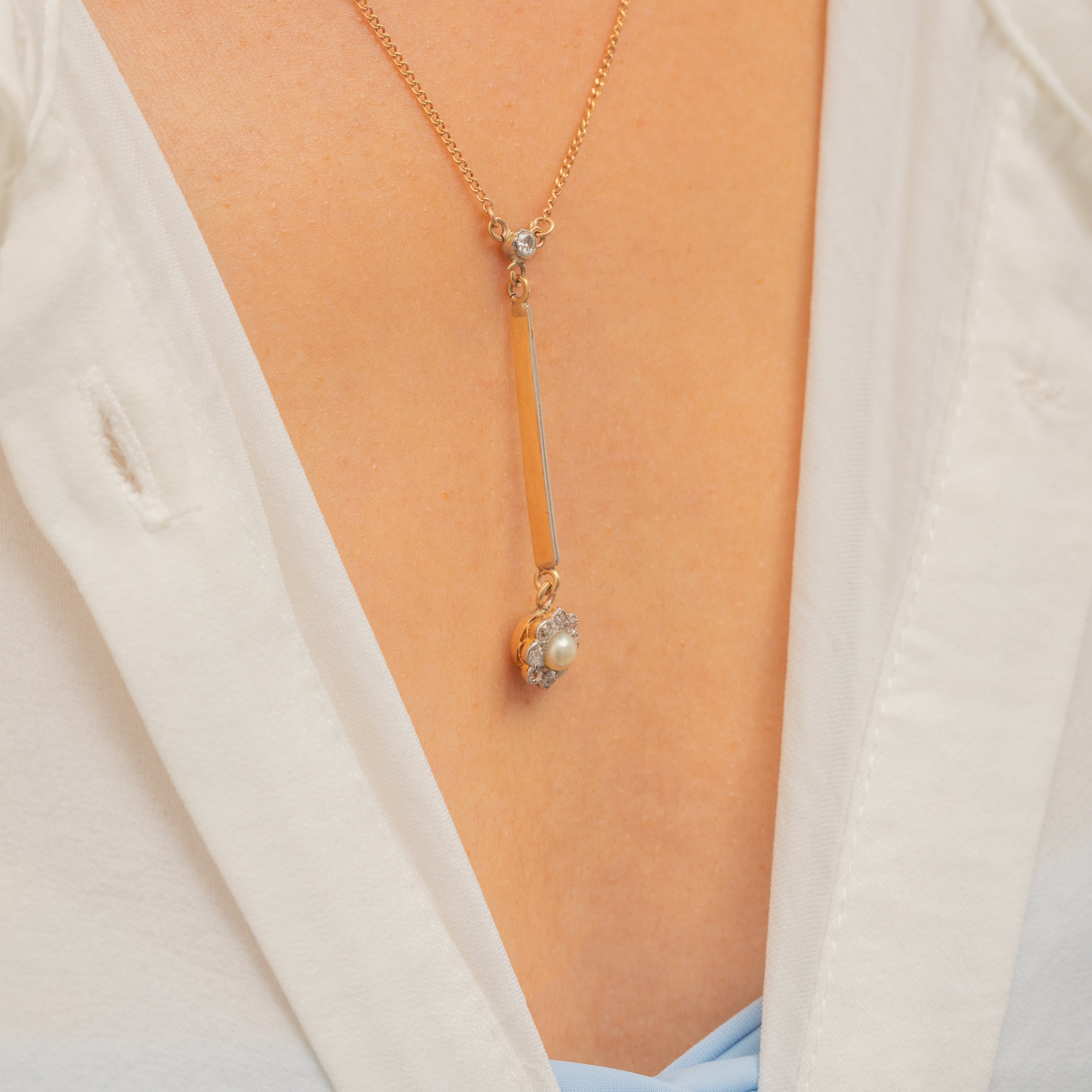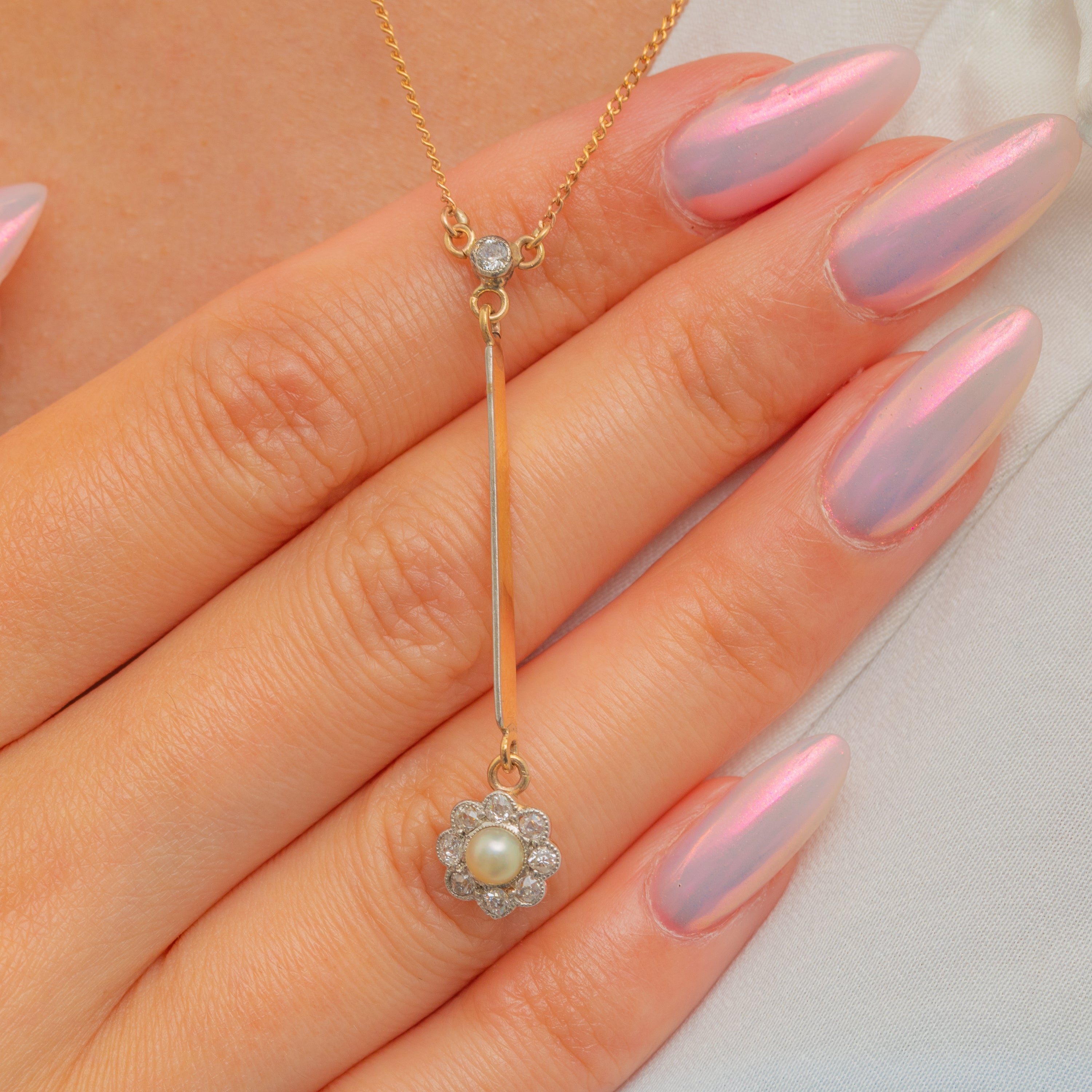 This Edwardian 18ct Gold Pearl Diamond daisy drop necklace radiates timeless elegance!