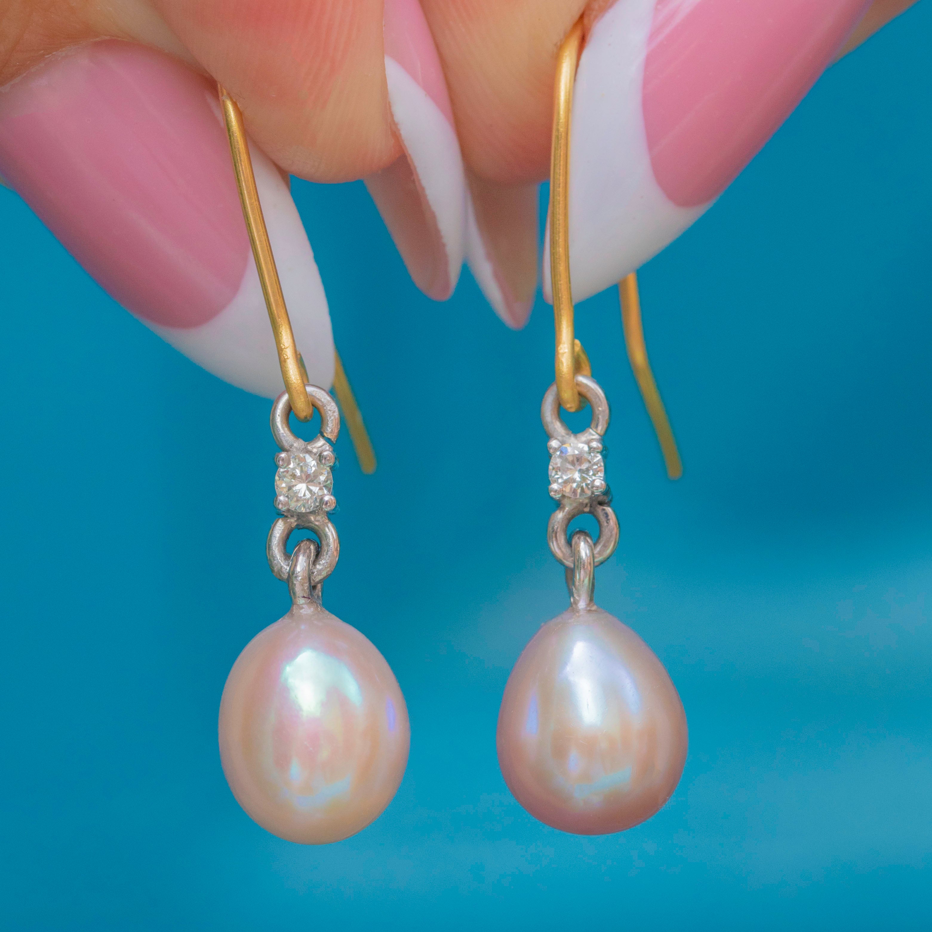 MATERIALS: Tests as 18ct White Gold, Yellow Gold hooks, Diamonds (0.08ct), Pink Pearls.