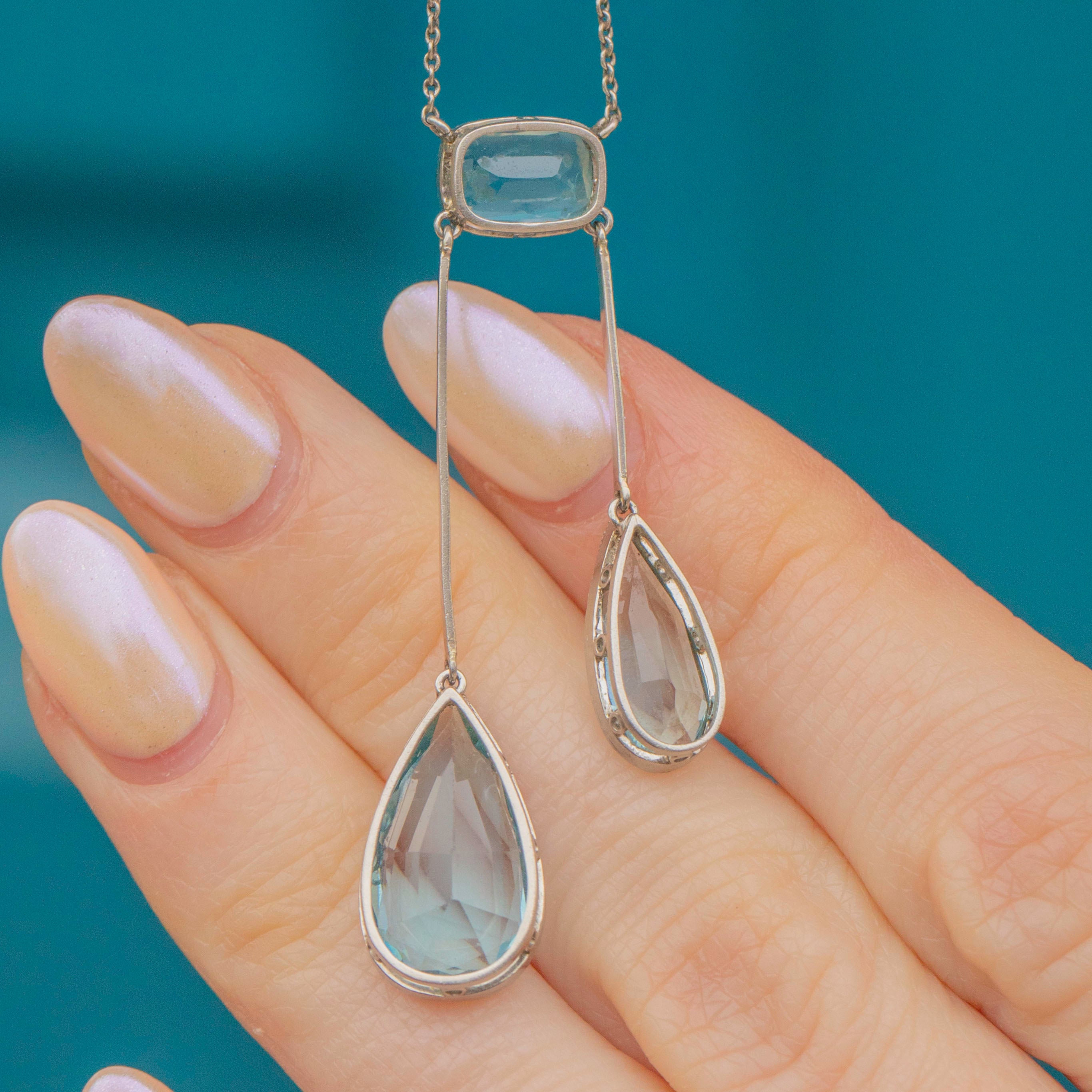 This antique necklaces features three stunning Aquamarine stones, boasting a combined carat weight of 5.40ct, each possessing a frosty pale blue hue. The gemstones are set within lustrous Platinum settings in classic Edwardian negligee style.