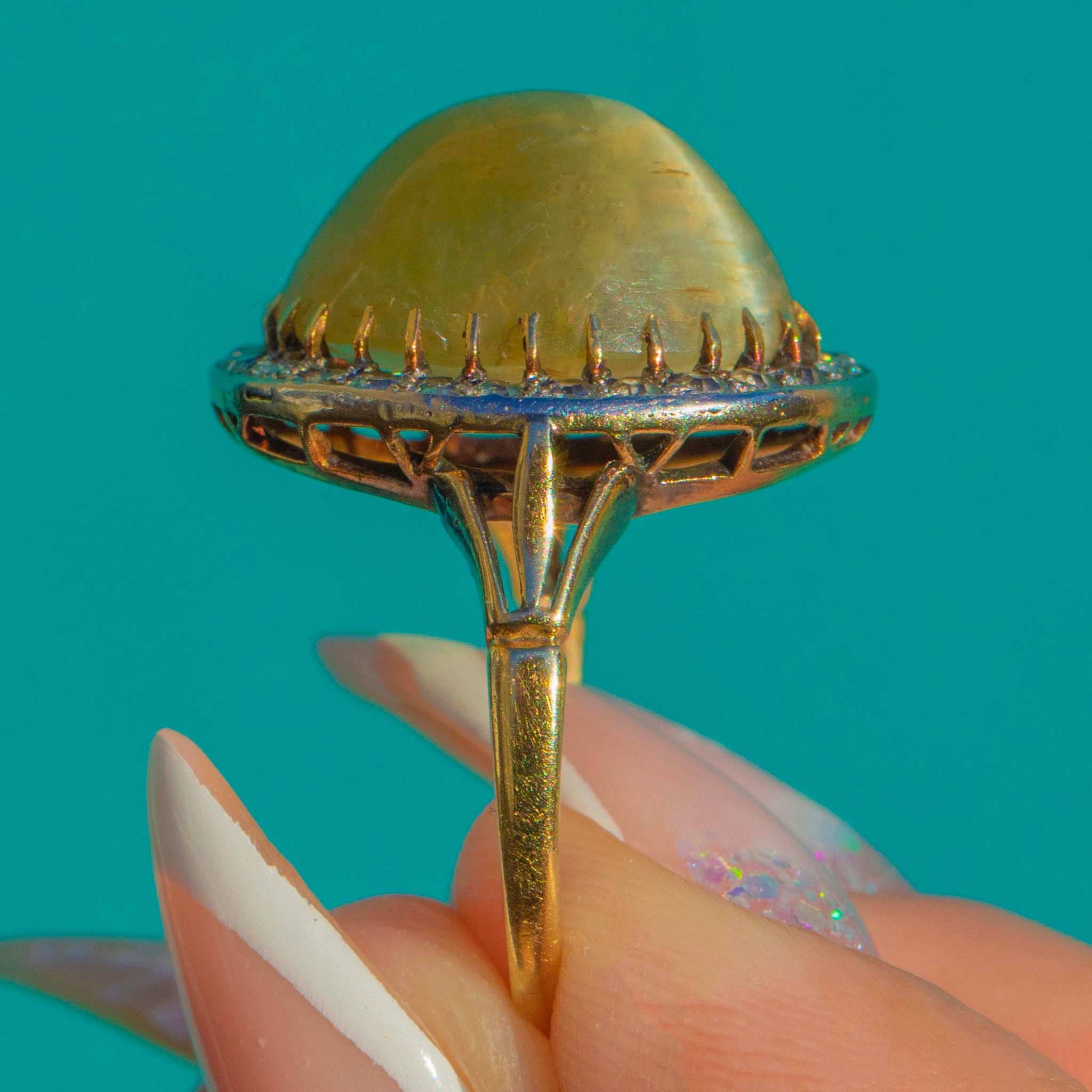Bold yet exquisitely balanced, the large, sculptural cabochon dome plays beautifully with the scintillation of the Diamond surround. An enduringly chic oval halo silhouette, crafted with that airy late Victorian finesse!